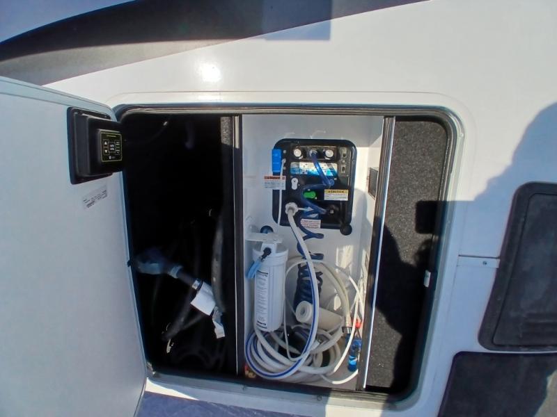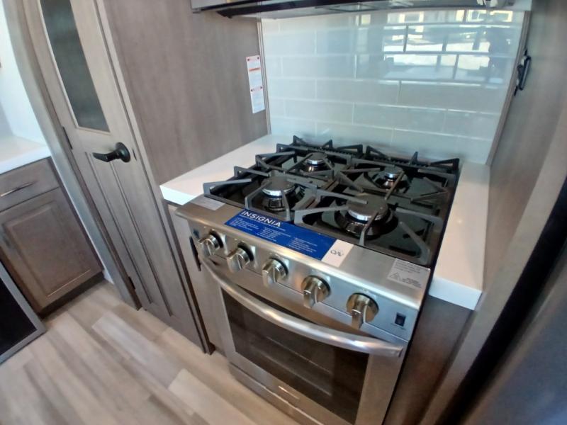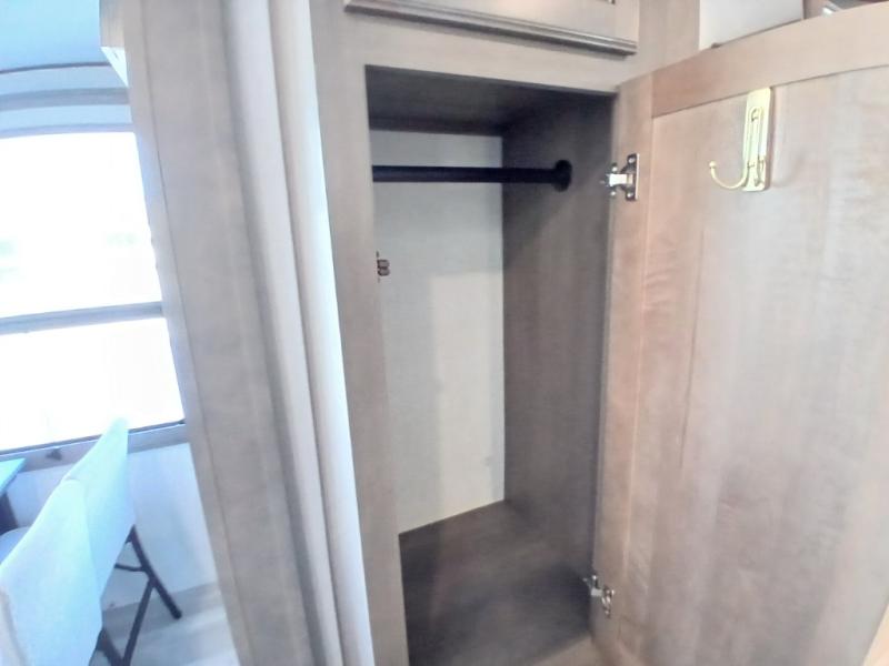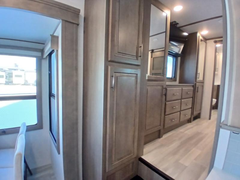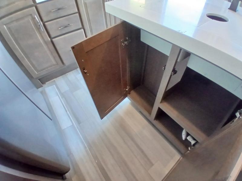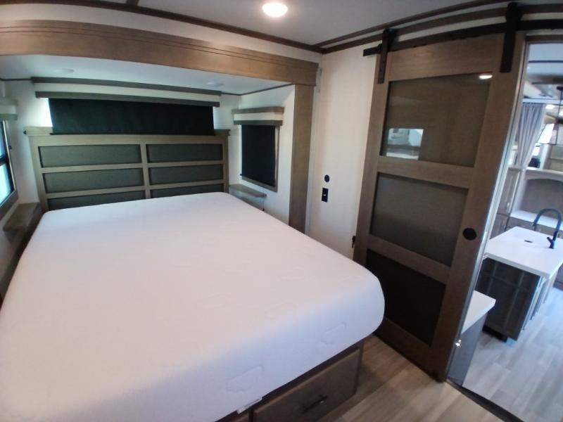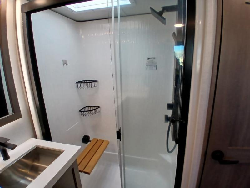If you enjoy entertaining while camping, you will love this setup with a wet bar including a beverage cooler, a kitchen island to set snacks on, and a hutch for storing dishes plus it also provides more counter space. And, the gourmet kitchen appliances with a 24" residential oven and four-burner range along with a 20 cu. ft. refrigerator allow you to cook any meal for your family and friends. The separate front living room is spacious with dual opposing tri-fold sofa slides and theater seating, and a front wall with an LED telescoping TV and fireplace below plus storage for entertaining. There is also a curtain to close at the pony wall for privacy when friends are sleeping on the sofas. You will have your own master bedroom with a queen bed slide (or optional king), wardrobes, an LED TV, plus sliding doors that lead into the private master bath. Here you will find dual sinks, a shower with flip-down teak seat and skylight, plus a space prepped to add an optional washer/dryer which is great for when you plan to stay awhile.
