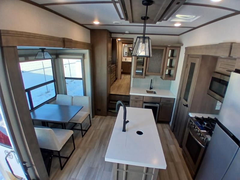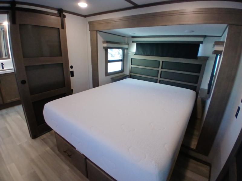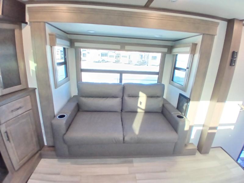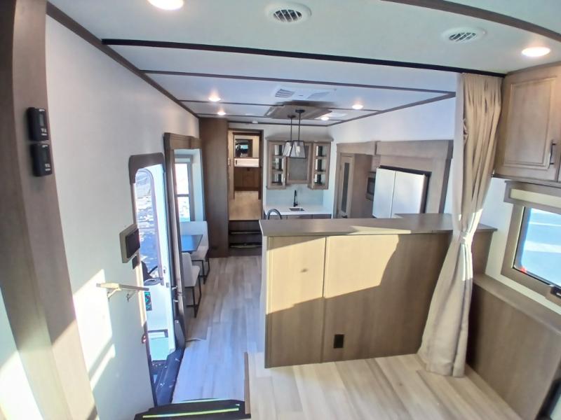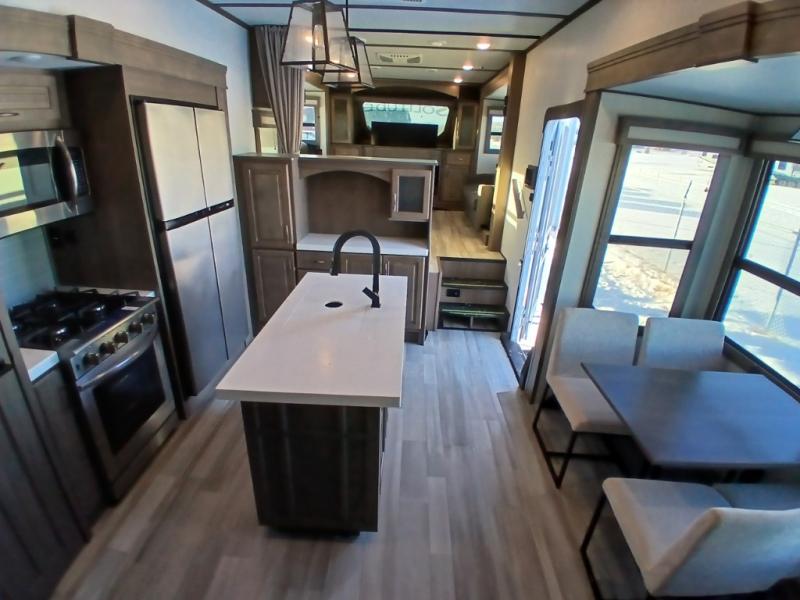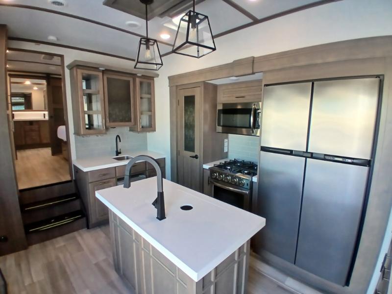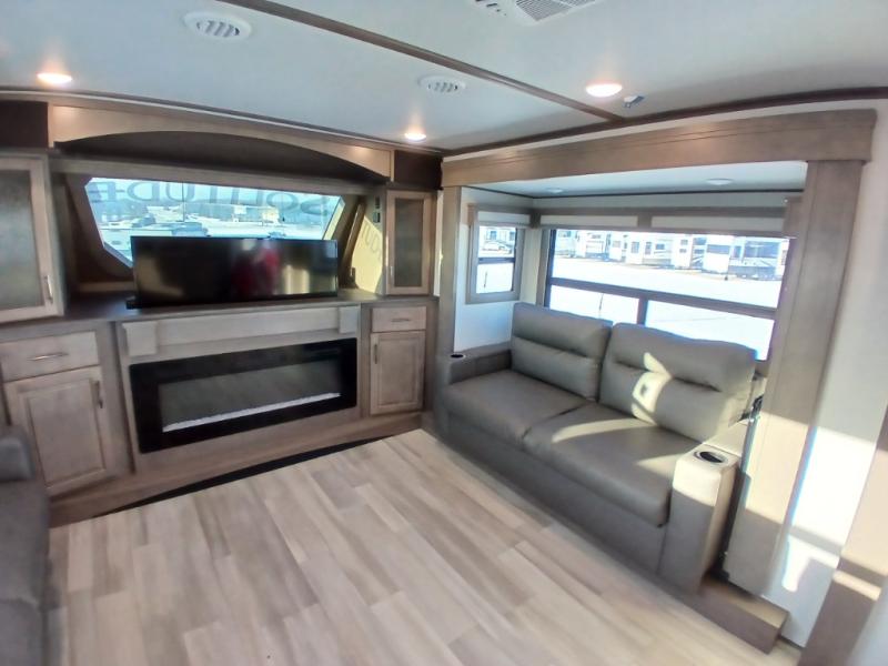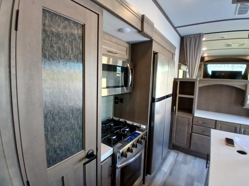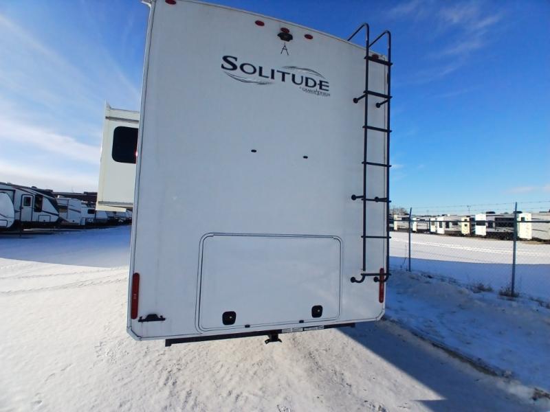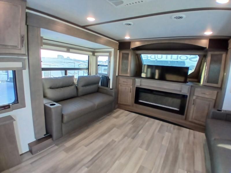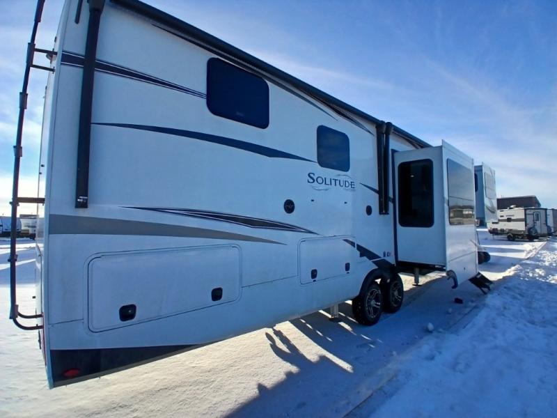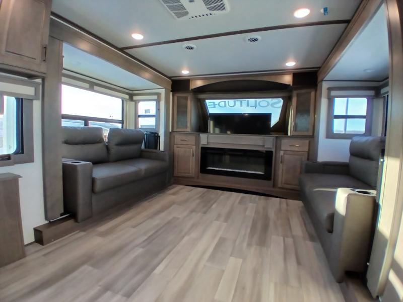 Each Solitude fifth wheel by Grand Design features a 101" wide-body construction, heavy duty 7,000 lb. axles, frameless tinted windows, and high-gloss gel coat sidewalls. You can camp year around thanks to the Weather-Tek Package that includes a 35K BTU high-capacity furnace, an all-in-one enclosed and heated utility center, and a fully enclosed underbelly with heated tanks and storage. Inside, you'll love the premium roller shades, hardwood cabinet doors, solid surface countertops and sinks, plus residential finishes throughout to make you truly feel at home. Each model also includes a MORryde CRE3000 suspension system, self adjusting brakes, and a MORryde pin box that will provide smooth towing from home to campground. Affordable luxury is possible with the Solitude fifth wheels; choose yours today!