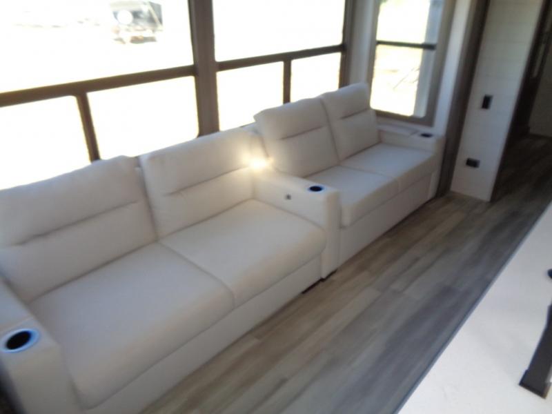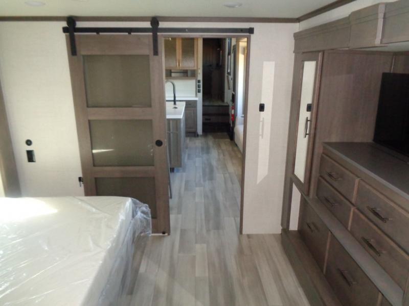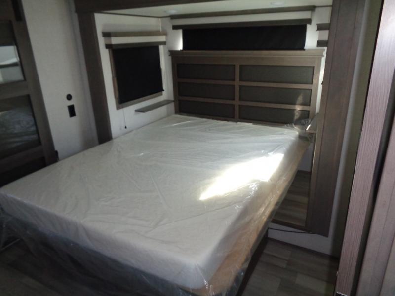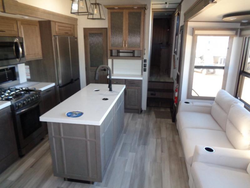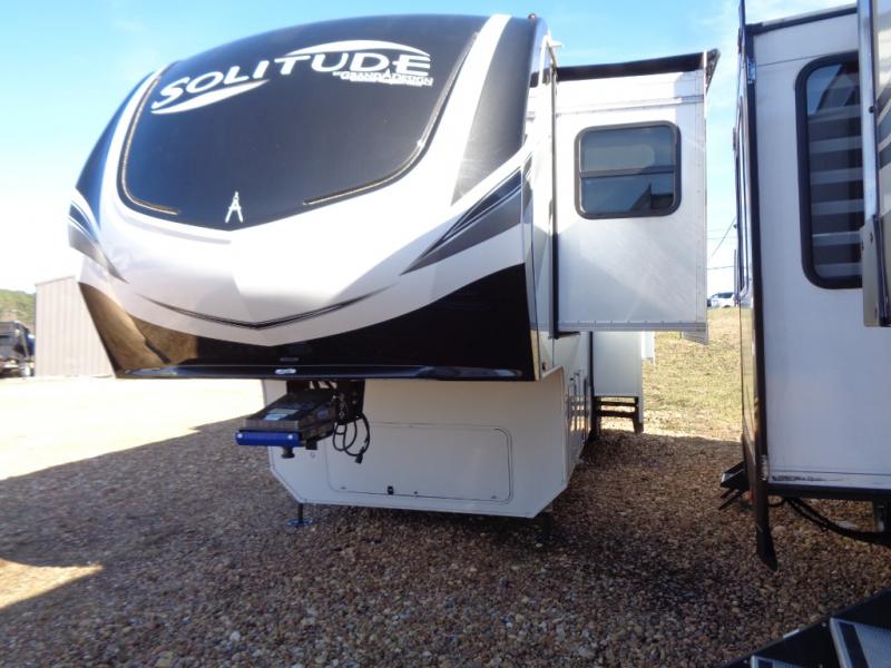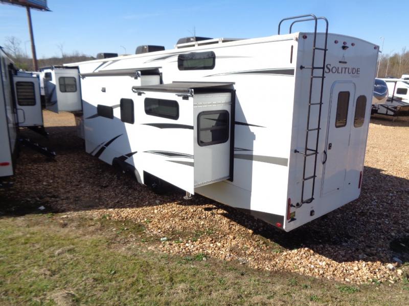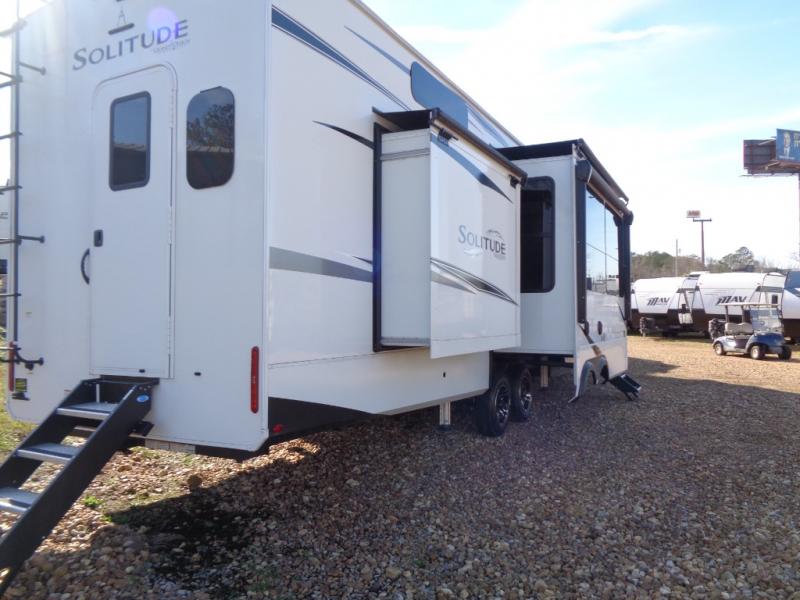 Each Solitude fifth wheel by Grand Design features a 101" wide-body construction, heavy duty 7,000 lb. axles, frameless tinted windows, and high-gloss gel coat sidewalls. You can camp year around thanks to the Weather-Tek Package that includes a 35K BTU high-capacity furnace, an all-in-one enclosed and heated utility center, and a fully enclosed underbelly with heated tanks and storage. Inside, you'll love the premium roller shades, hardwood cabinet doors, solid surface countertops and sinks, plus residential finishes throughout to make you truly feel at home. Each model also includes a MORryde CRE3000 suspension system, self adjusting brakes, and a MORryde pin box that will provide smooth towing from home to campground. Affordable luxury is possible with the Solitude fifth wheels; choose yours today!