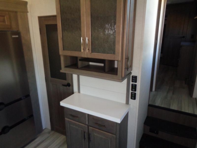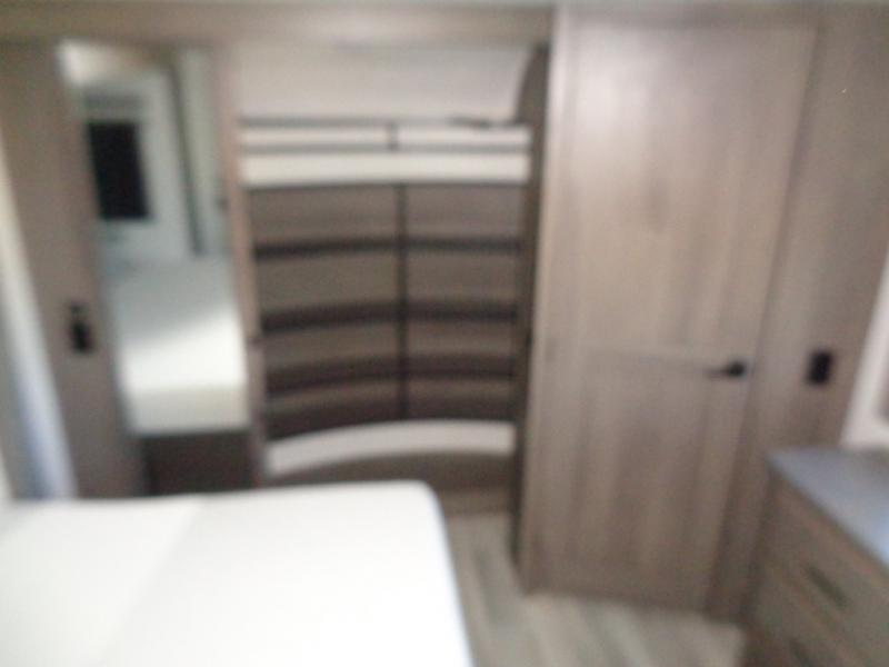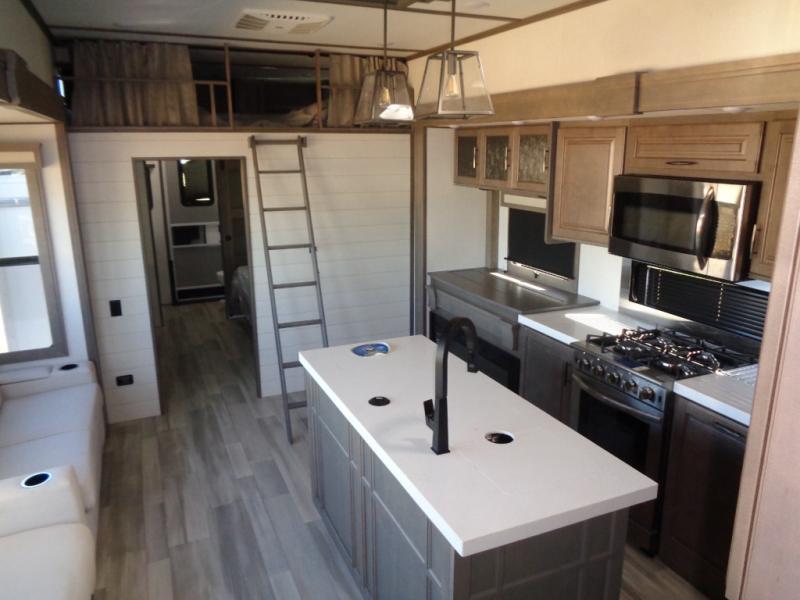 For an affordable luxury extended stay for your family, this Solitude is it! Two private bedrooms plus an overhead Sky Suite loft above the rear bedroom which also has it's own private rear entry/exit door is just the beginning of what is in store for your camping convenience. You will love the spacious feel that the Solitude provides with taller ceilings, larger scenic windows, and an interior width of 8' 5", not to mention FIVE slides in this unit alone. You may not even want to go home once you get a look inside. The upscale kitchen features an island with dishwasher prep, a large single bowl sink, a 12V 20 cu. ft. refrigerator for your perishables, and a 24" residential oven, not to mention you will also enjoy a microwave, pantry, and hutch for your dishes, plus a free standing dinette! You can easily take along extra family and friends with the second private bedroom featuring it's own private bath and entry which is great for another couple, and there is even loft space above this rear private bedroom for added storage or sleeping for children. Both bathrooms feature a shower with skylight, vanity and sink, plus a toilet. And, you will find ample storage for clothing and belongings throughout with nice size closets, overhead cabinets, plus loads of outside storage. Speaking of outside, this unit features a spray port for rinsing off before heading inside, two awnings, a USB charging outlet, and four step aluminum shock assist entry steps at both entrances.