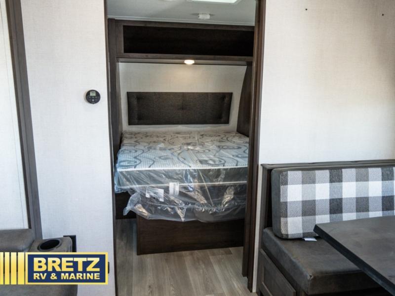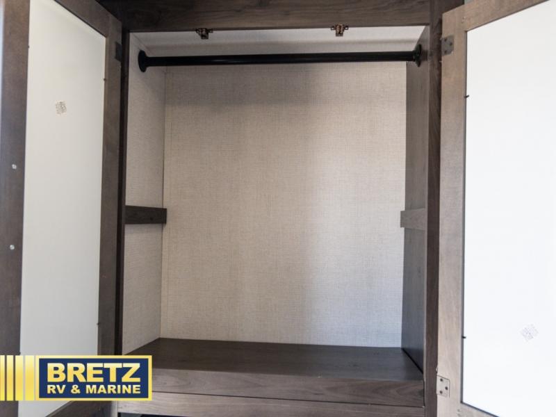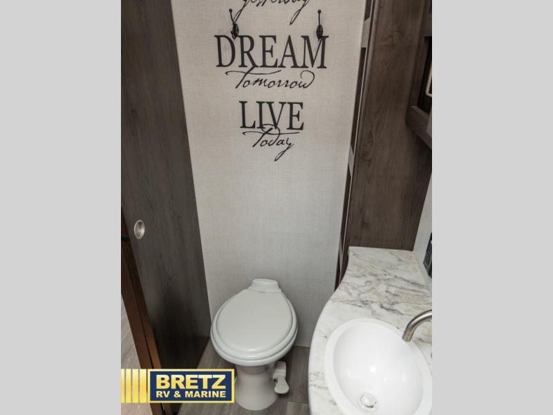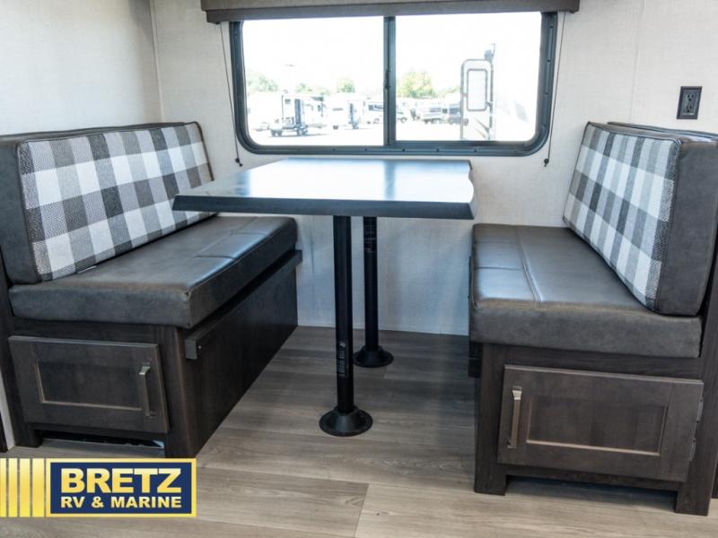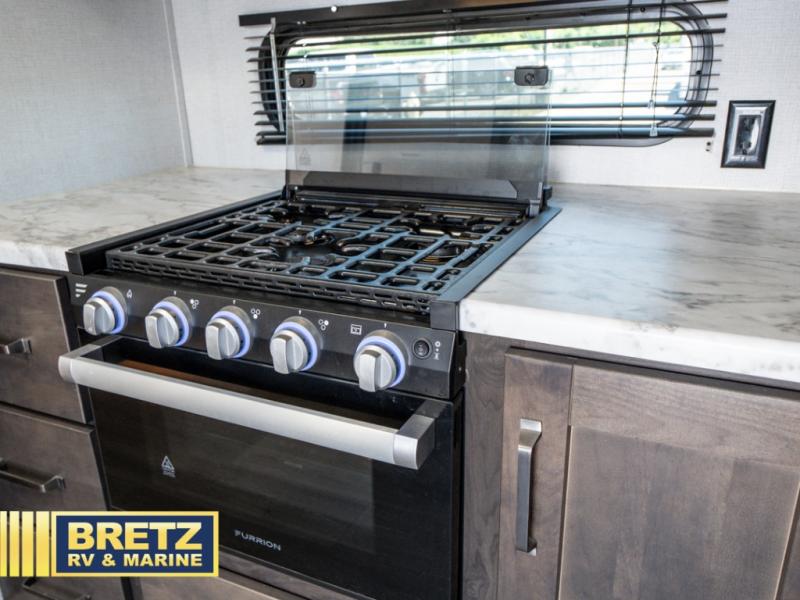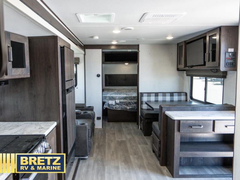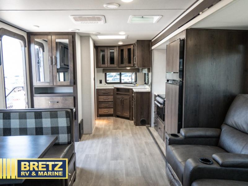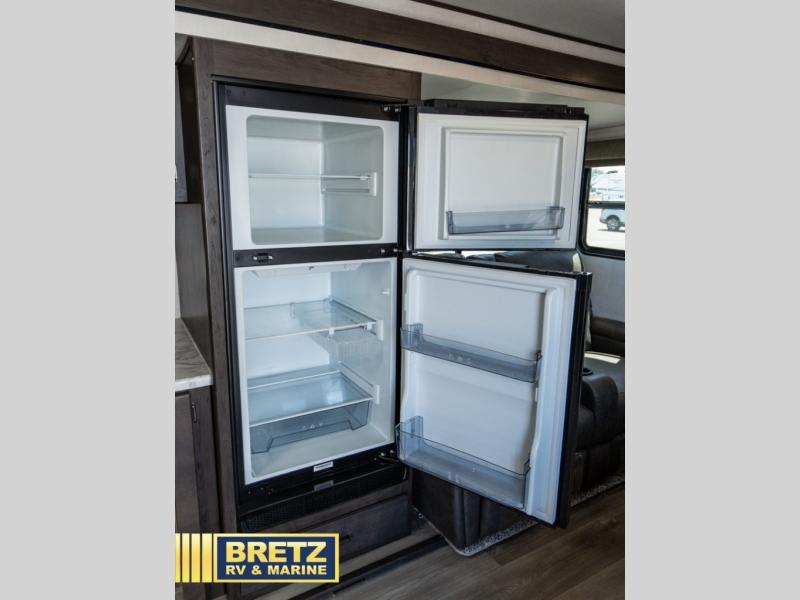 Relaxing weekends to the lake just got sweeter in this spacious travel trailer. Prepare lunch on the three-burner cooktop, and you can enjoy it at the booth dinette. There is also a 60" tri-fold sofa, or you can choose the optional theater seating in place of the sofa if you don't need the extra sleeping space. This model includes plenty of storage space, including a pantry/wardrobe just as you enter the unit, overhead compartments, and even a pet drawer for food and water!