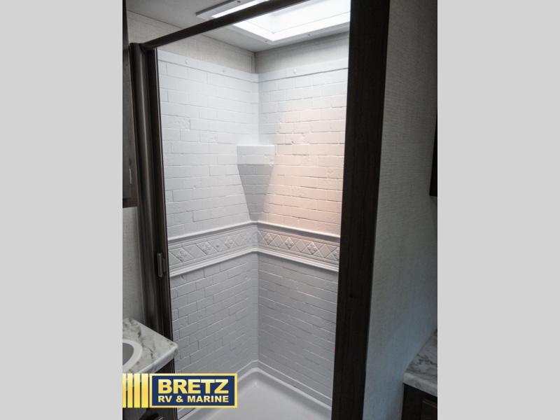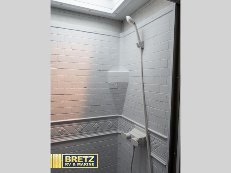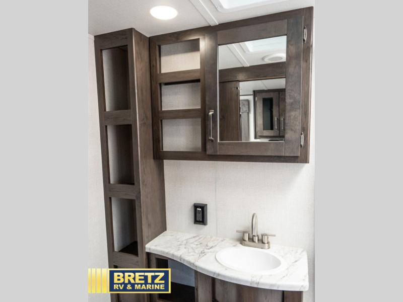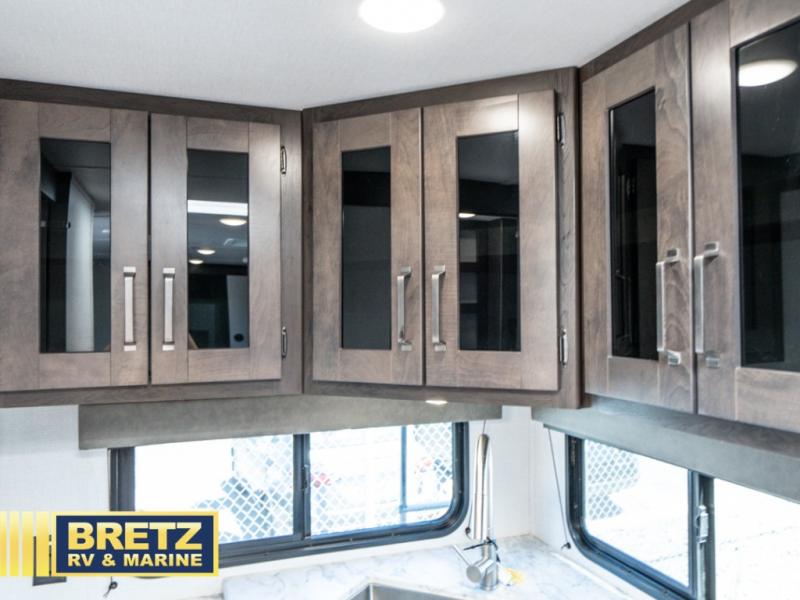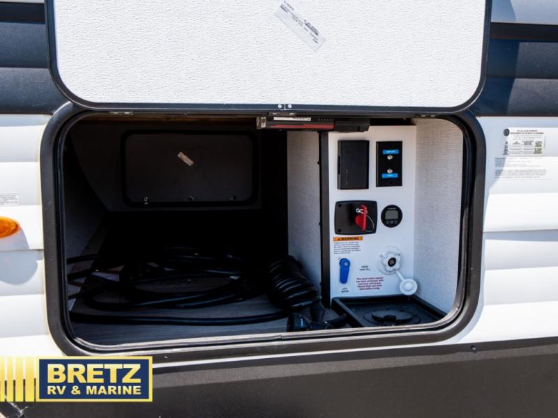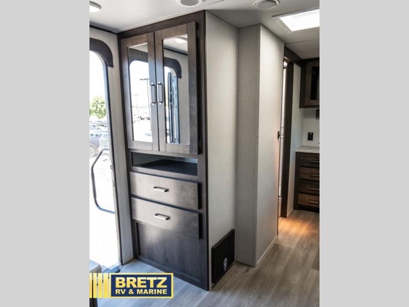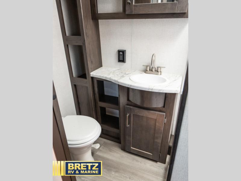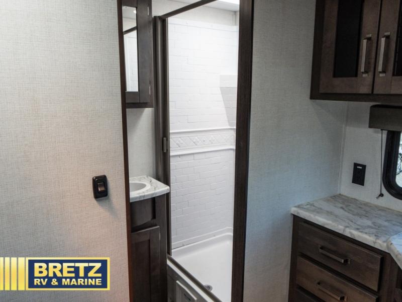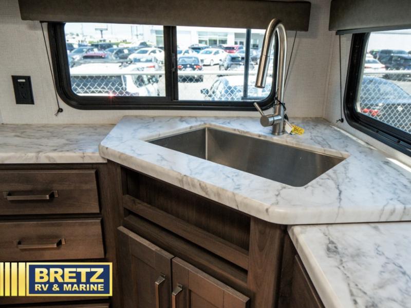 Relaxing weekends to the lake just got sweeter in this spacious travel trailer. Prepare lunch on the three-burner cooktop, and you can enjoy it at the booth dinette. There is also a 60" tri-fold sofa, or you can choose the optional theater seating in place of the sofa if you don't need the extra sleeping space. This model includes plenty of storage space, including a pantry/wardrobe just as you enter the unit, overhead compartments, and even a pet drawer for food and water!