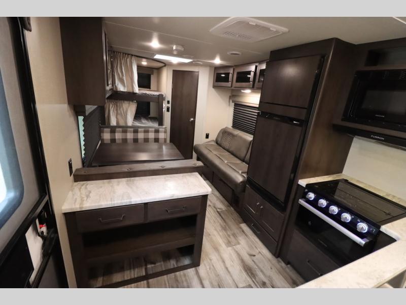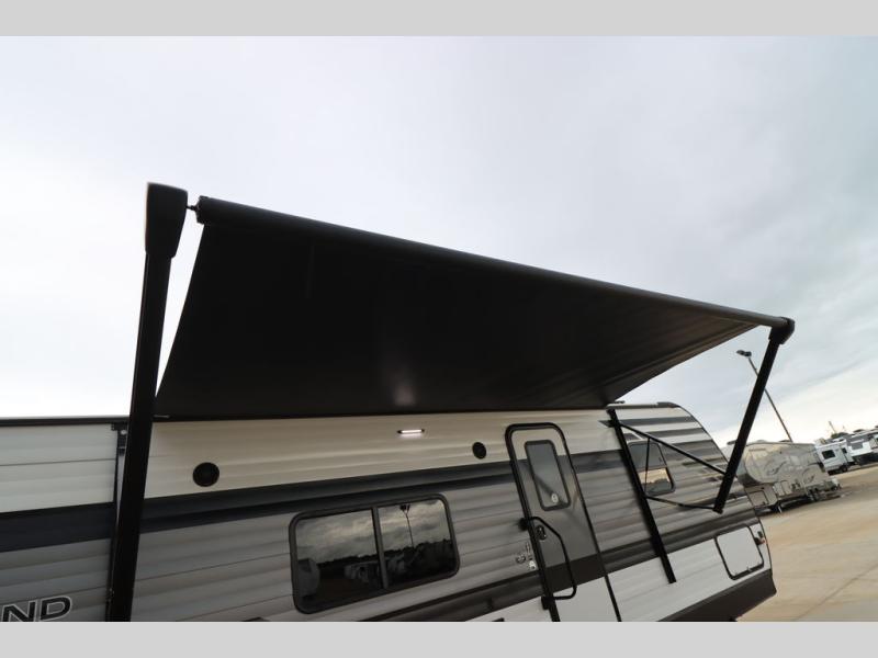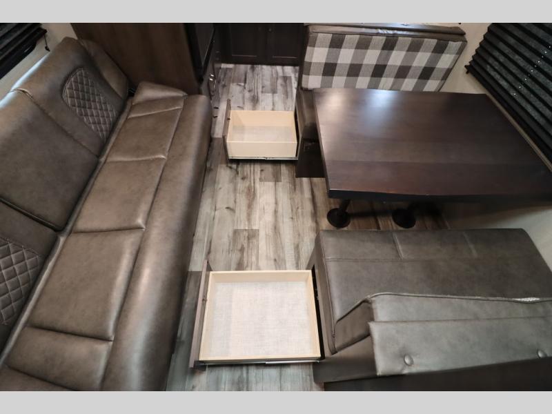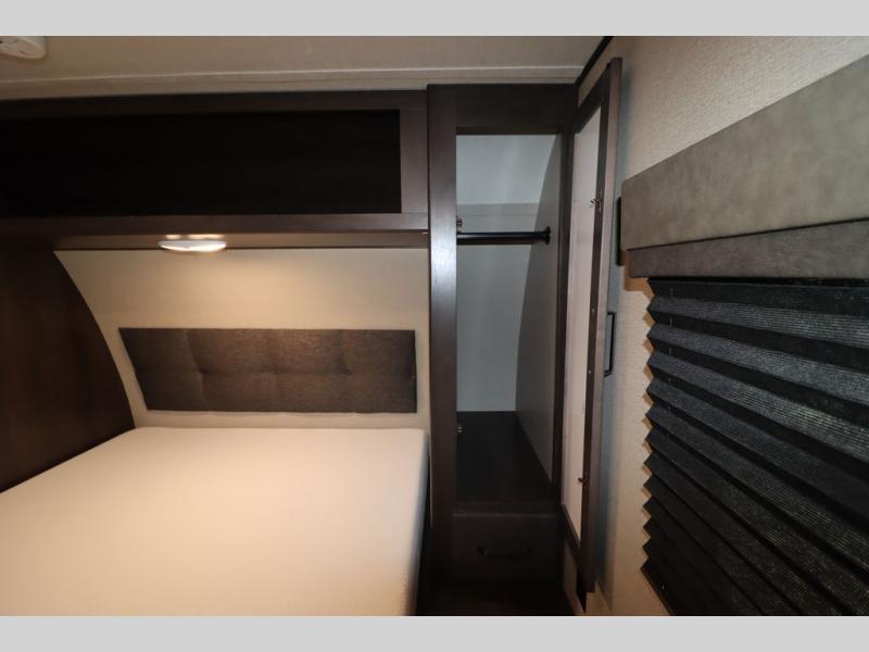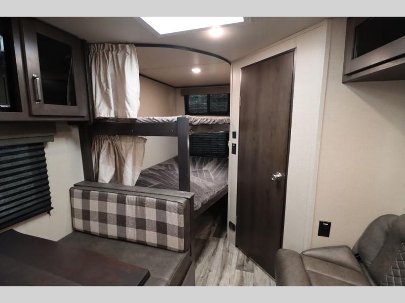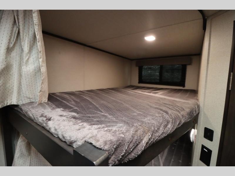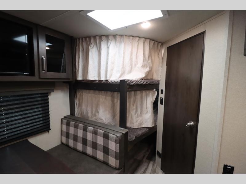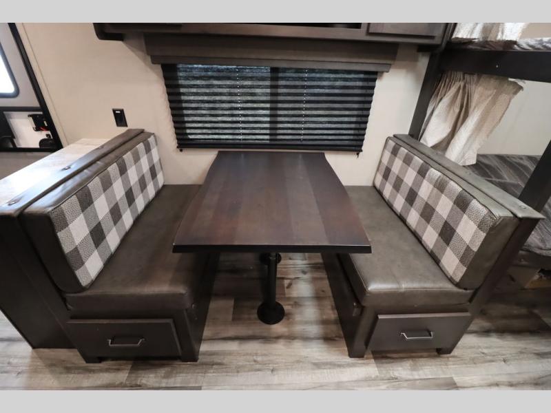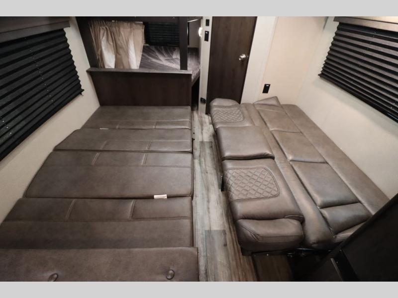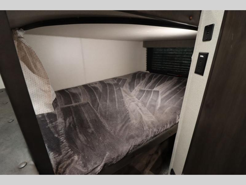 If you've been looking for a trailer with more sleeping space for your family or crew, check out this model that can sleep nine people each night! There are double-size bunks in the back next to the full bath, and the under-bed storage will be perfect for luggage and camp gear. While the chef is preparing dinner on the three-burner cooktop, everyone can visit on the booth dinette and roll-over sofa. If the weather is nice, you may just find yourselves under the 15' power awning planning out your next day's adventures. This model also includes front private bedroom with a queen bed and overhead storage for books!