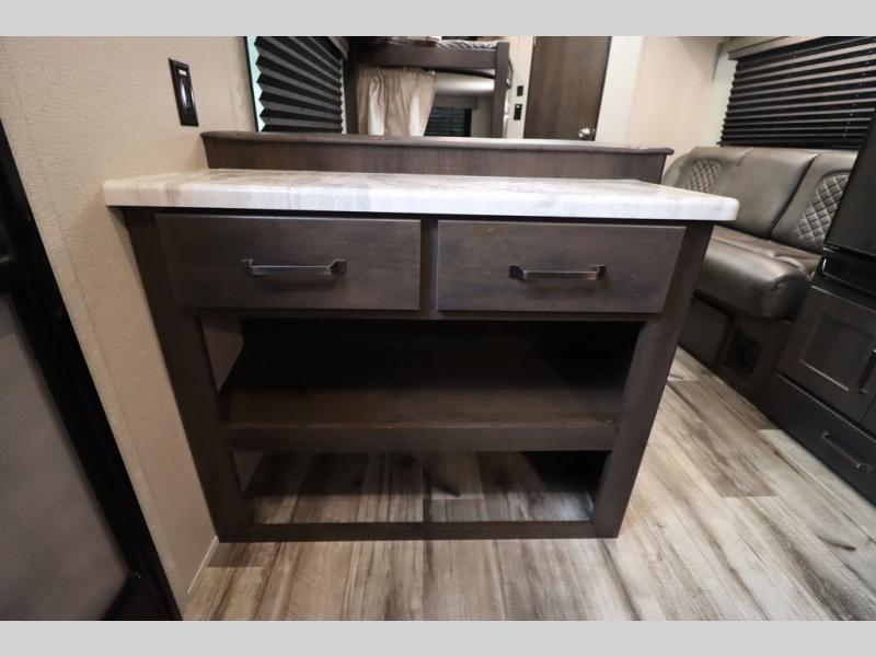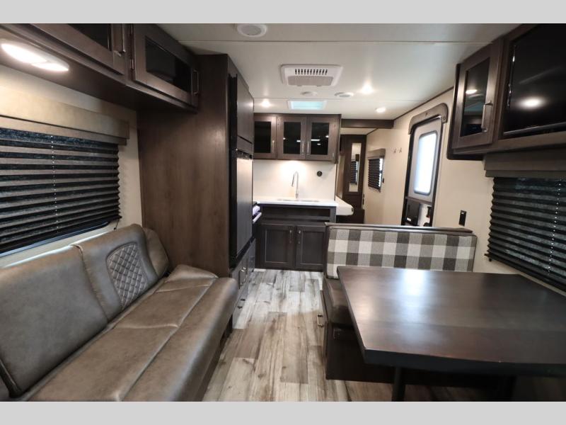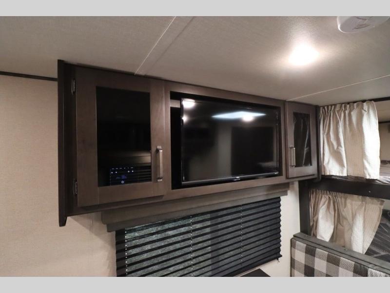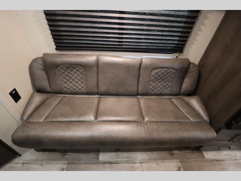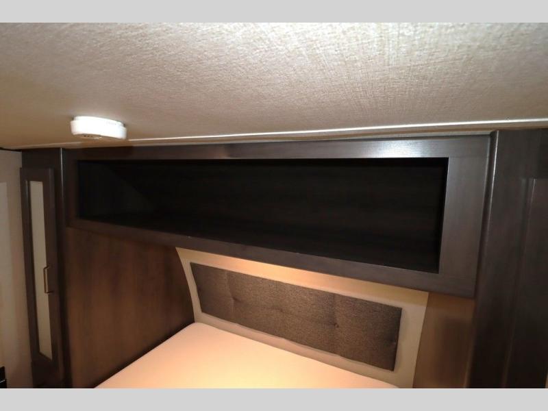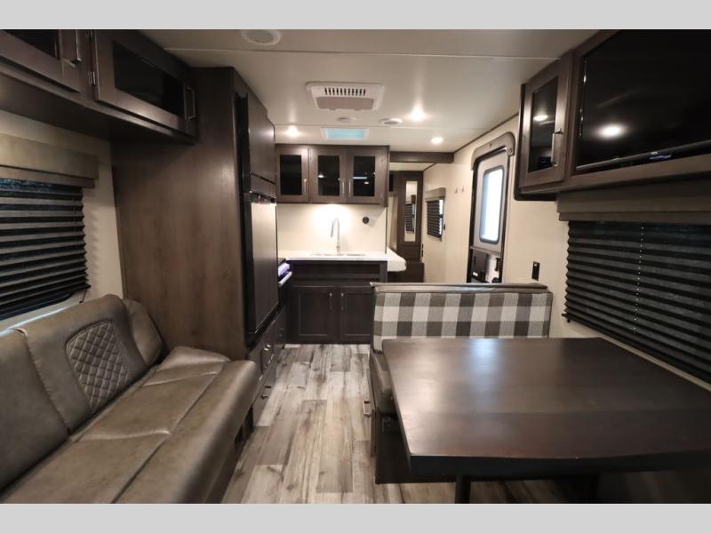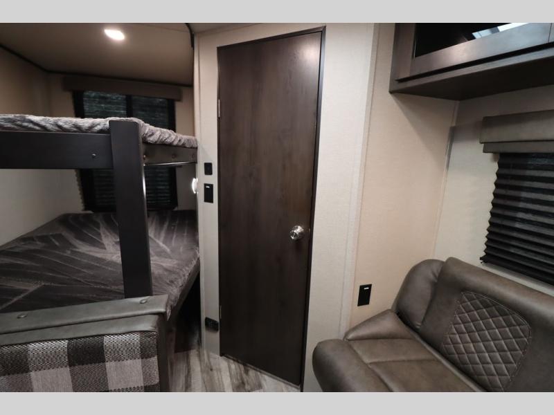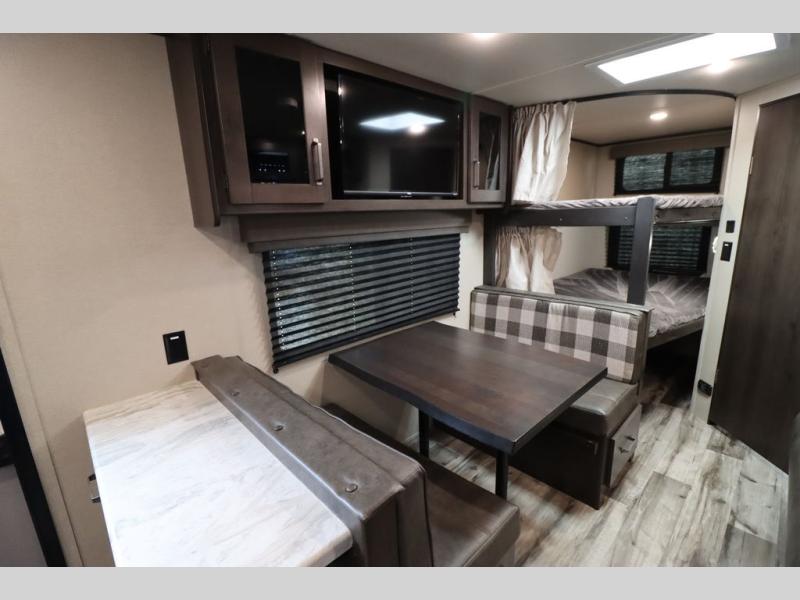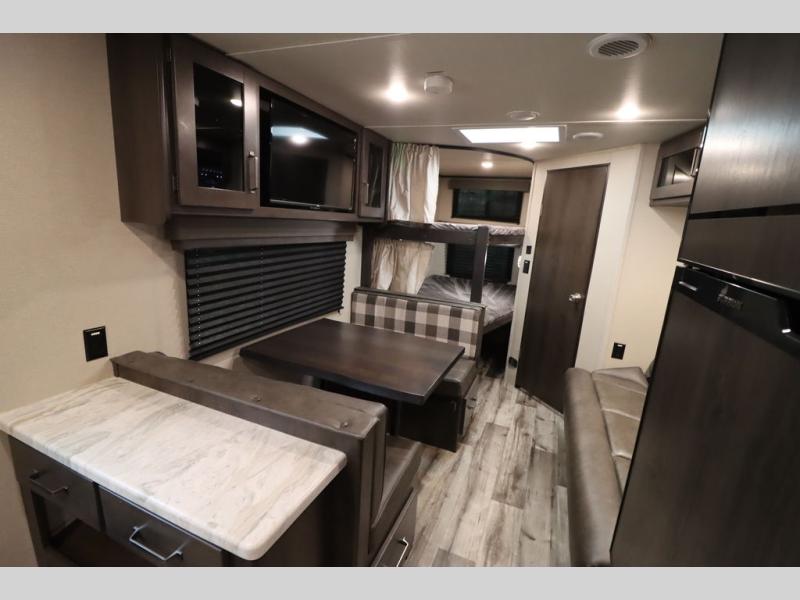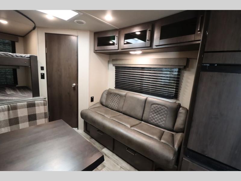 If you've been looking for a trailer with more sleeping space for your family or crew, check out this model that can sleep nine people each night! There are double-size bunks in the back next to the full bath, and the under-bed storage will be perfect for luggage and camp gear. While the chef is preparing dinner on the three-burner cooktop, everyone can visit on the booth dinette and roll-over sofa. If the weather is nice, you may just find yourselves under the 15' power awning planning out your next day's adventures. This model also includes front private bedroom with a queen bed and overhead storage for books!