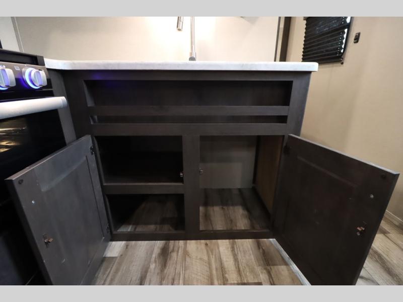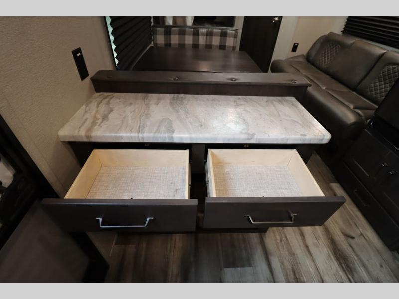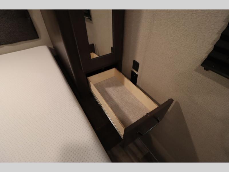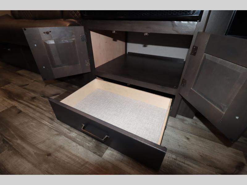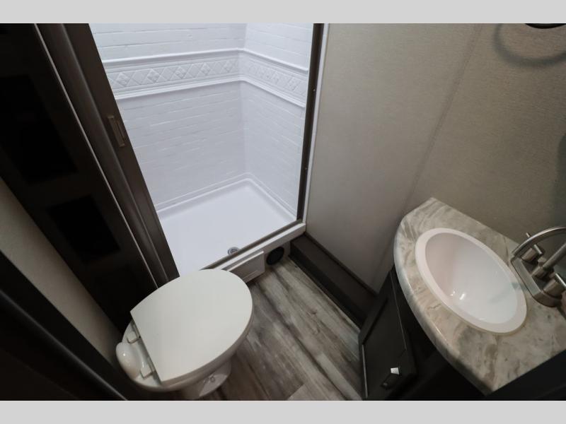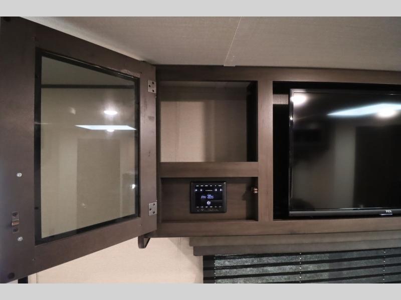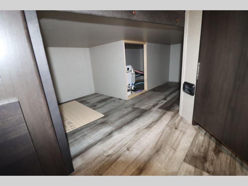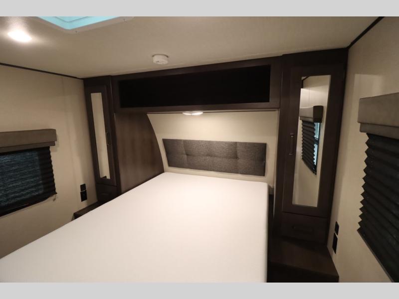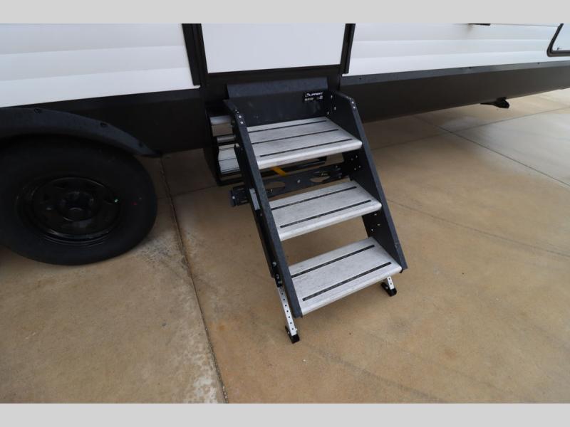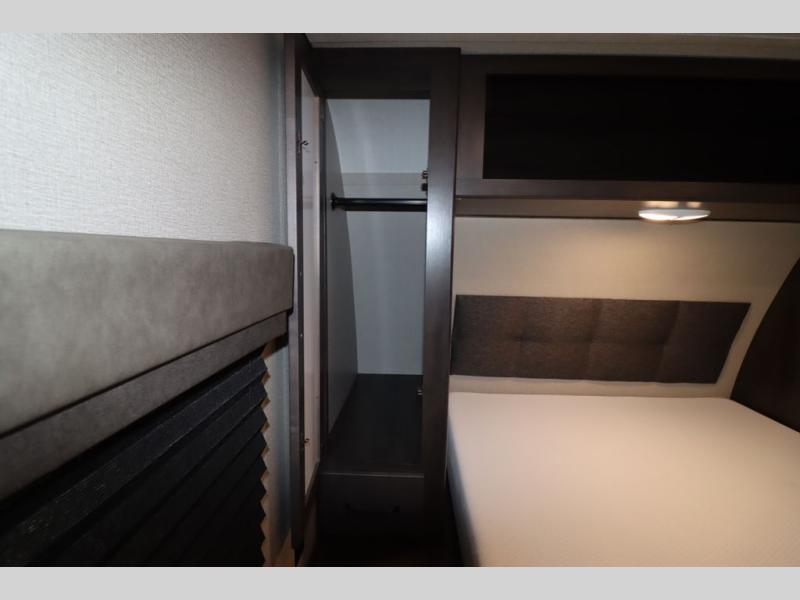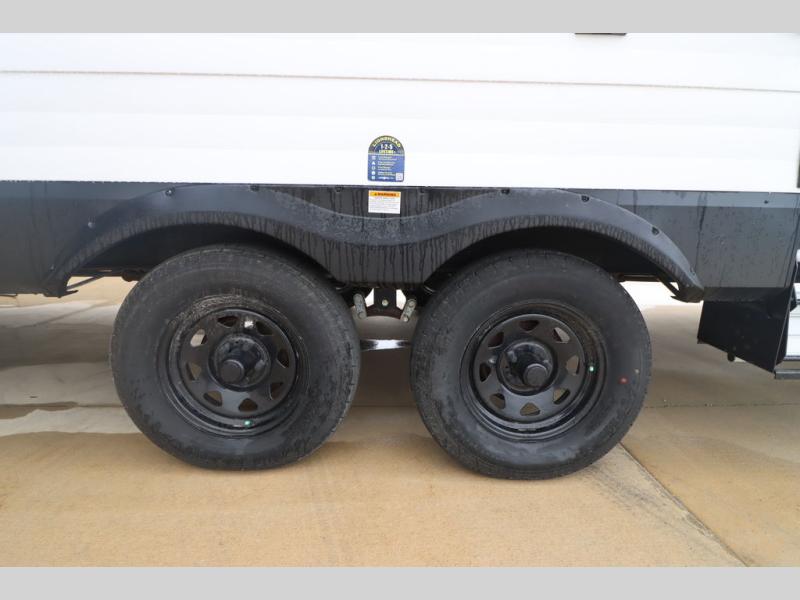 If you've been looking for a trailer with more sleeping space for your family or crew, check out this model that can sleep nine people each night! There are double-size bunks in the back next to the full bath, and the under-bed storage will be perfect for luggage and camp gear. While the chef is preparing dinner on the three-burner cooktop, everyone can visit on the booth dinette and roll-over sofa. If the weather is nice, you may just find yourselves under the 15' power awning planning out your next day's adventures. This model also includes front private bedroom with a queen bed and overhead storage for books!