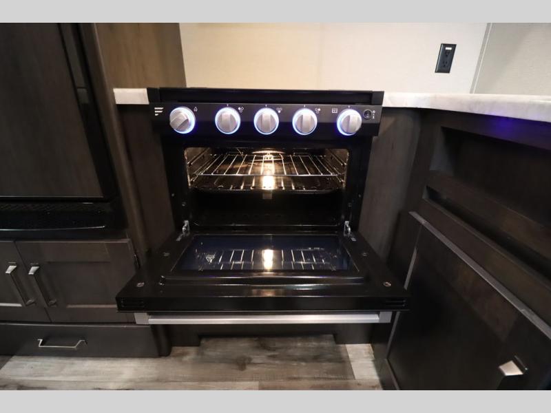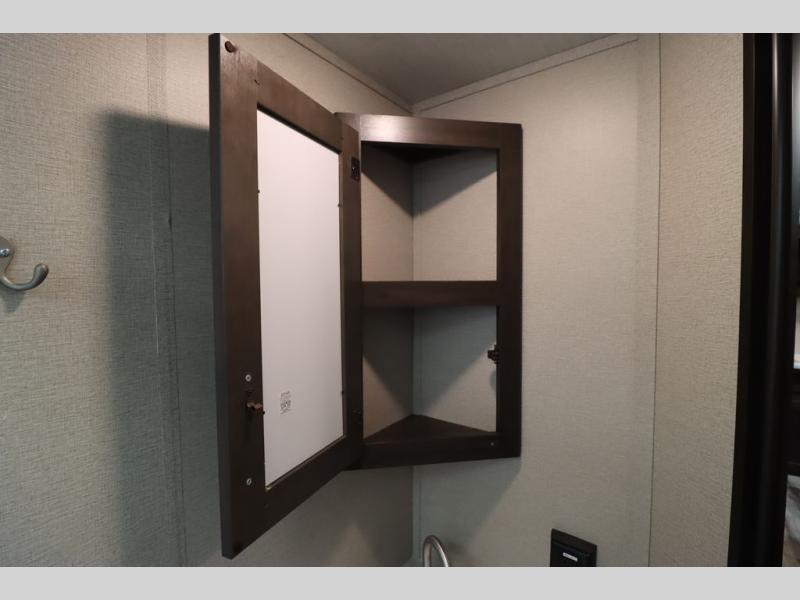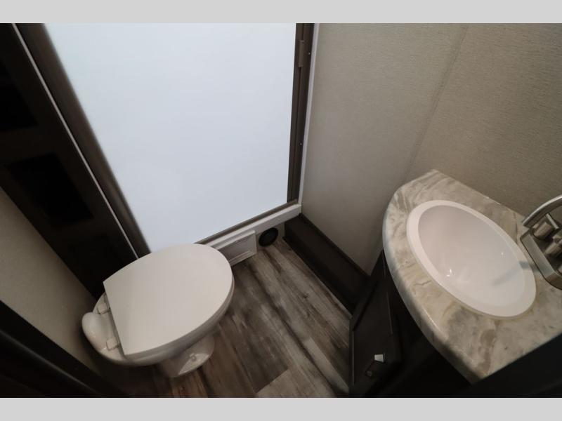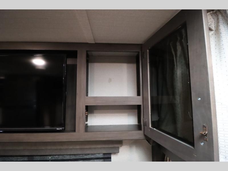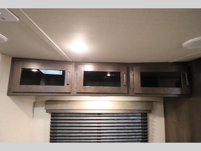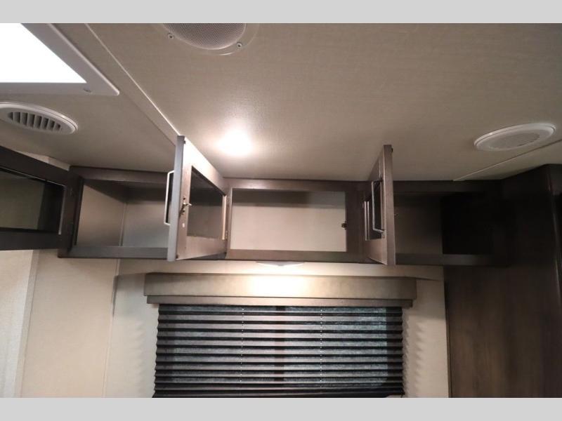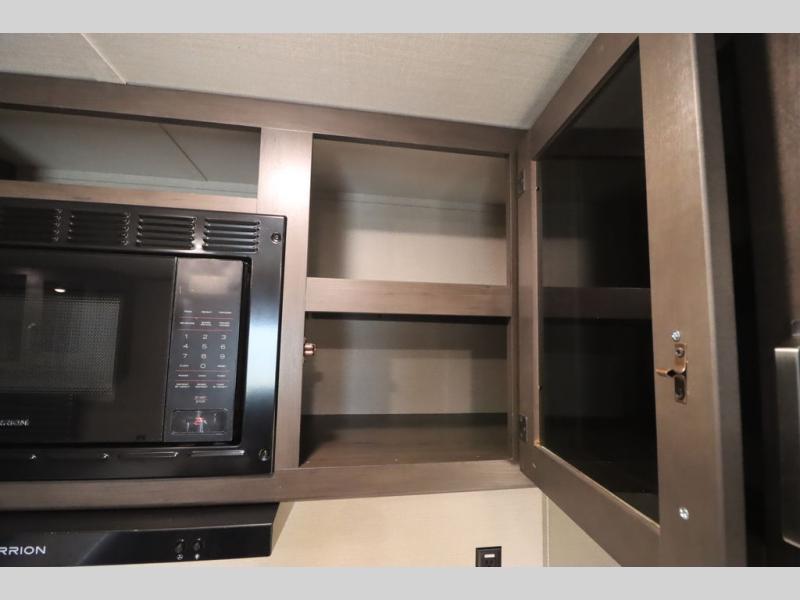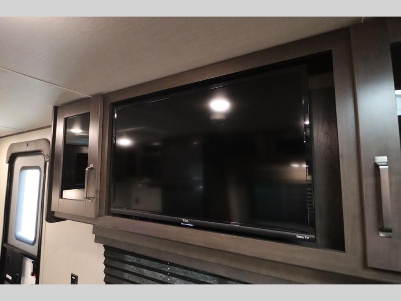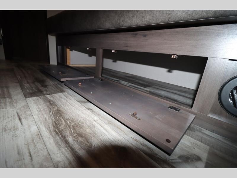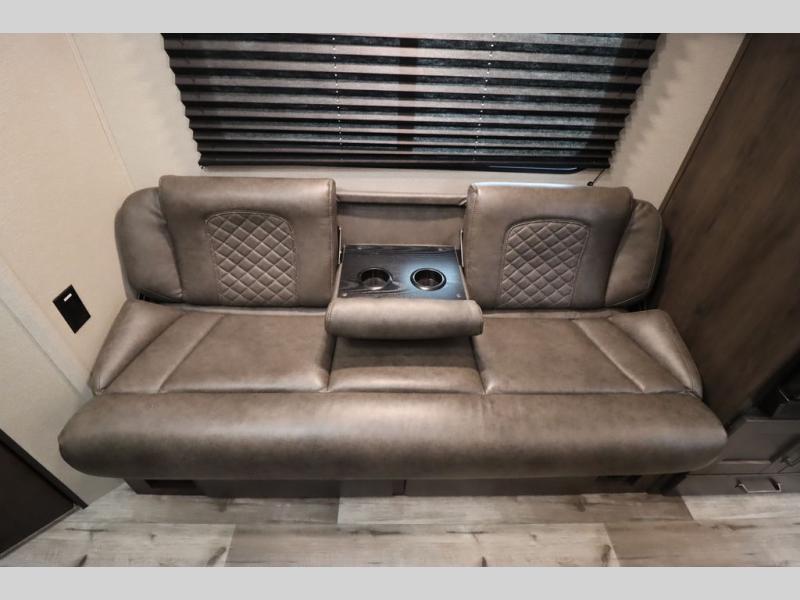If you've been looking for a trailer with more sleeping space for your family or crew, check out this model that can sleep nine people each night! There are double-size bunks in the back next to the full bath, and the under-bed storage will be perfect for luggage and camp gear. While the chef is preparing dinner on the three-burner cooktop, everyone can visit on the booth dinette and roll-over sofa. If the weather is nice, you may just find yourselves under the 15' power awning planning out your next day's adventures. This model also includes front private bedroom with a queen bed and overhead storage for books!