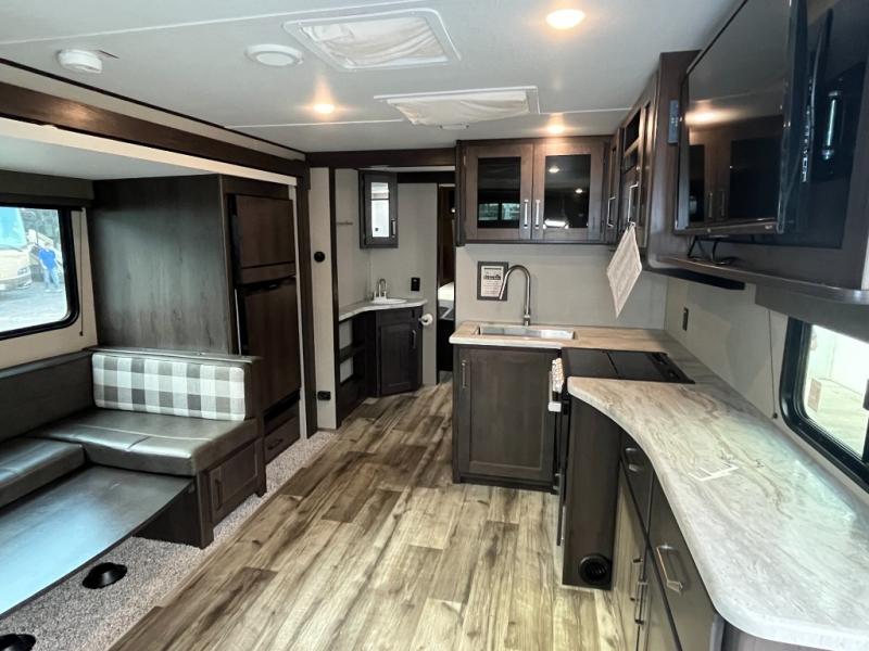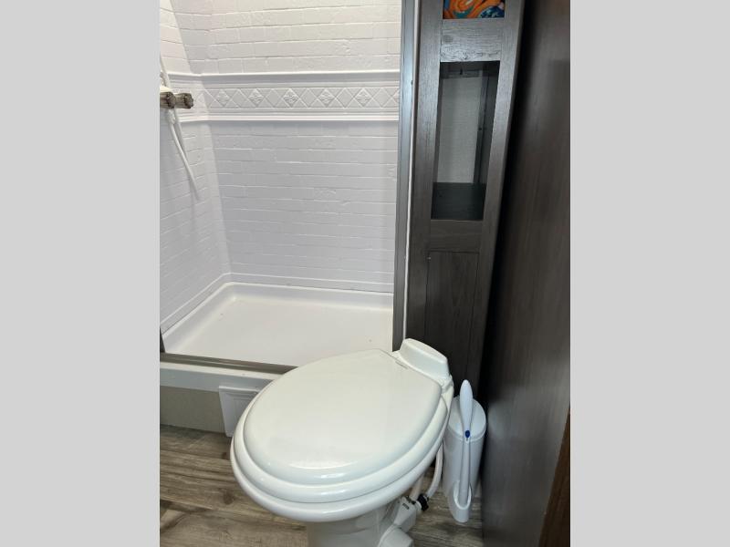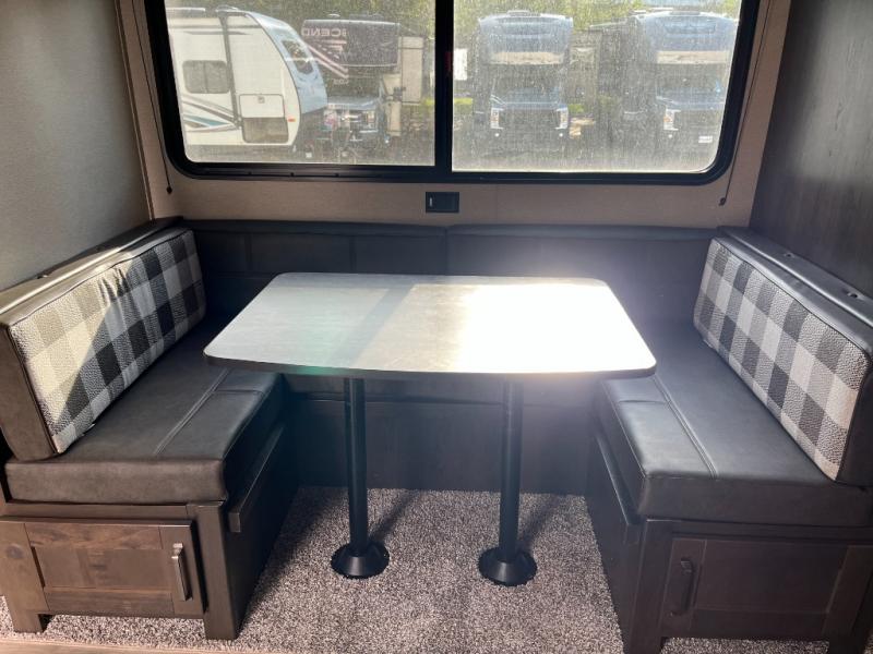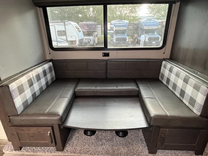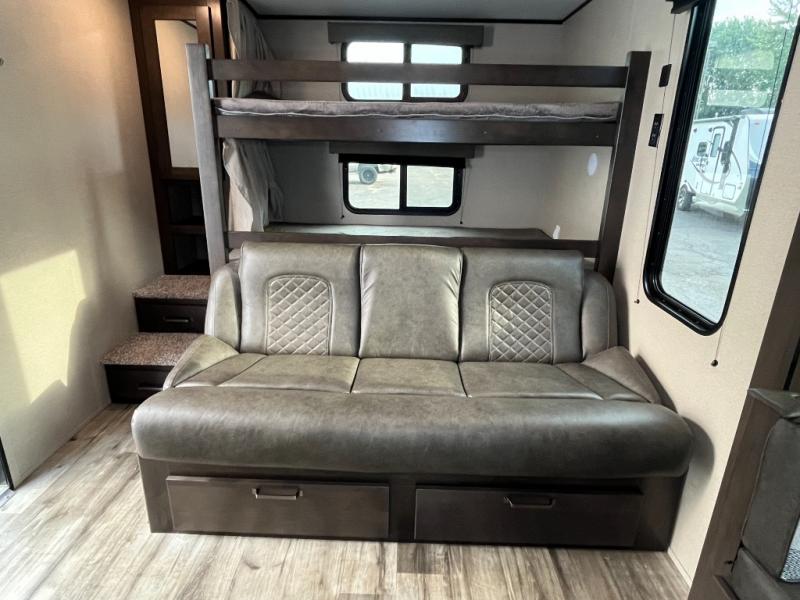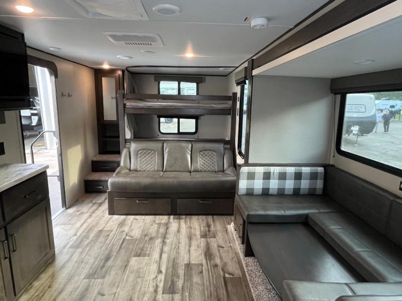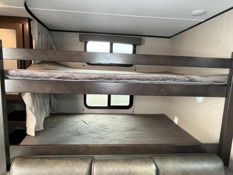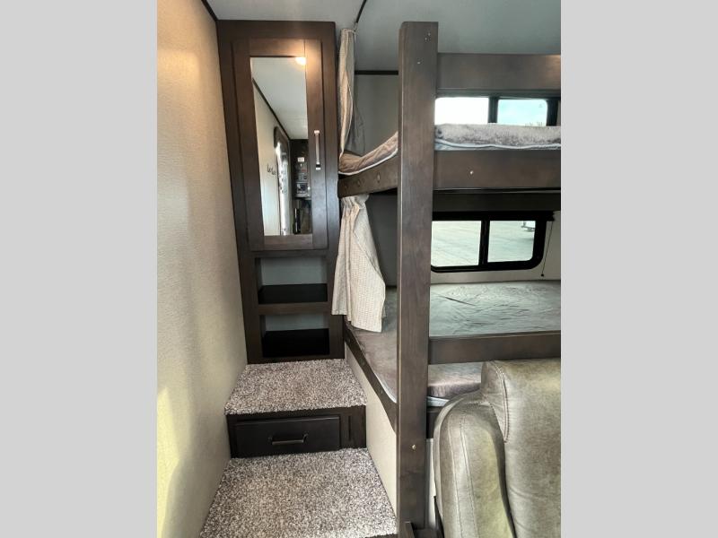 Are you ready to camp in comfort with your family or friends? This travel trailer allows you to do just that! There are double-size bunks in the back with step storage for books or board games. There is also a closet here to keep clothes wrinkle-free. The U-shaped dinette within the slide out can be switched out for the optional theatre seats, and the jackknife sofa will be the perfect spot to visit with your crew. This model features a walk-through bath that leads to the front master bedroom. You'll love the queen bed here, overhead storage, and your own exterior entry door for convenience.