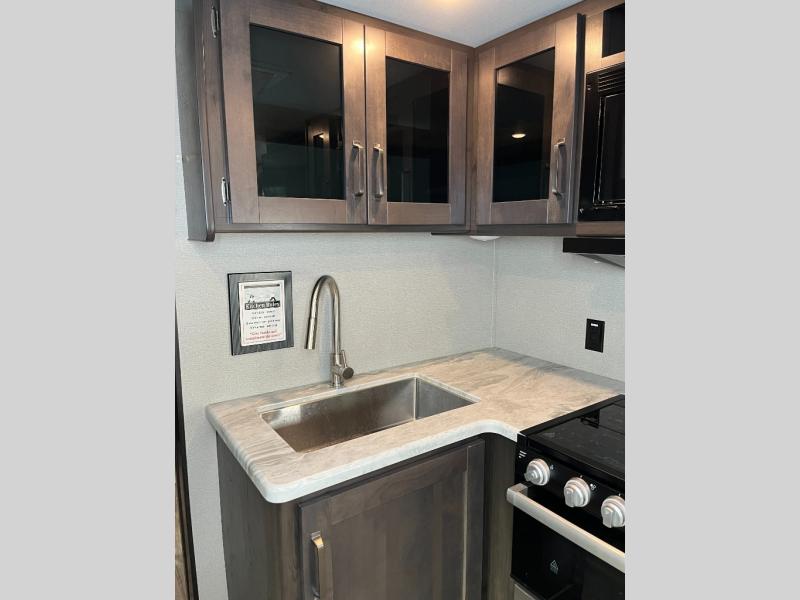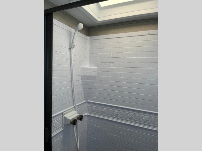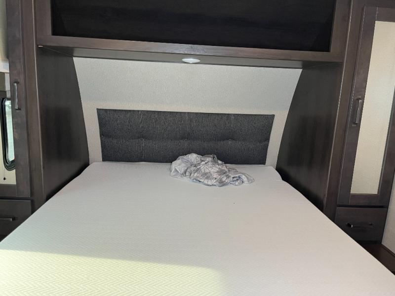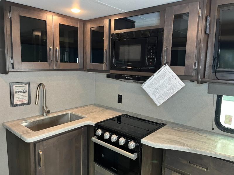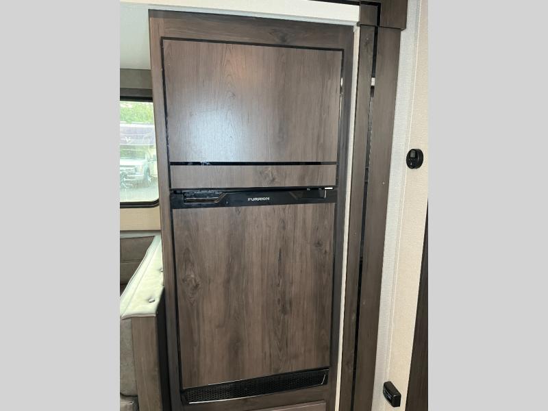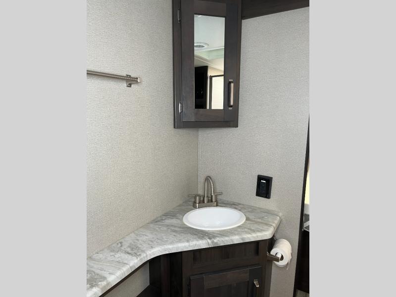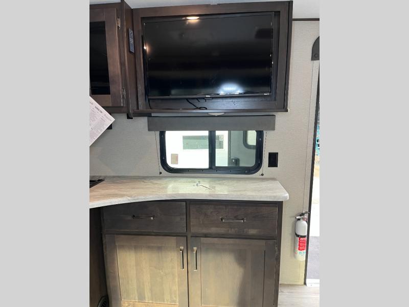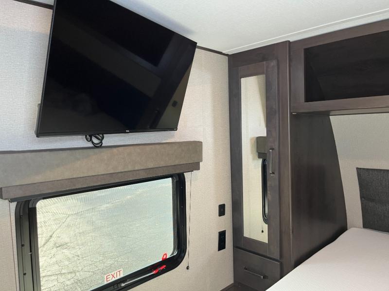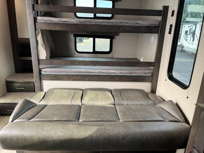 Are you ready to camp in comfort with your family or friends? This travel trailer allows you to do just that! There are double-size bunks in the back with step storage for books or board games. There is also a closet here to keep clothes wrinkle-free. The U-shaped dinette within the slide out can be switched out for the optional theatre seats, and the jackknife sofa will be the perfect spot to visit with your crew. This model features a walk-through bath that leads to the front master bedroom. You'll love the queen bed here, overhead storage, and your own exterior entry door for convenience.