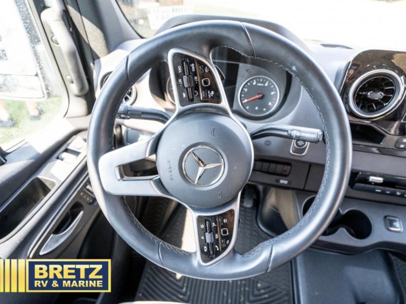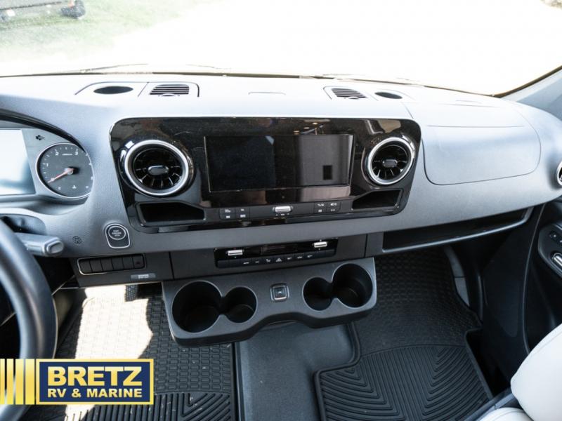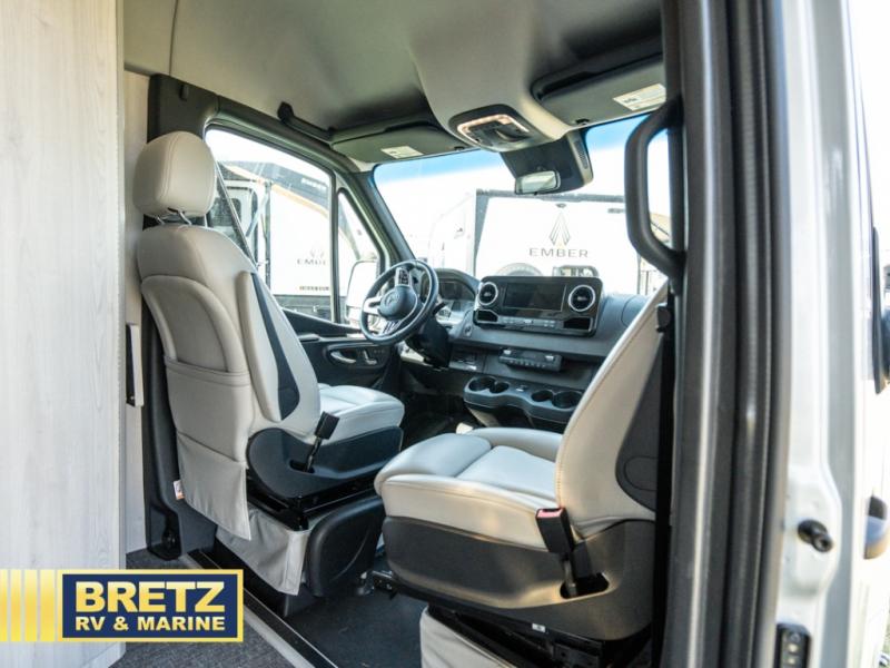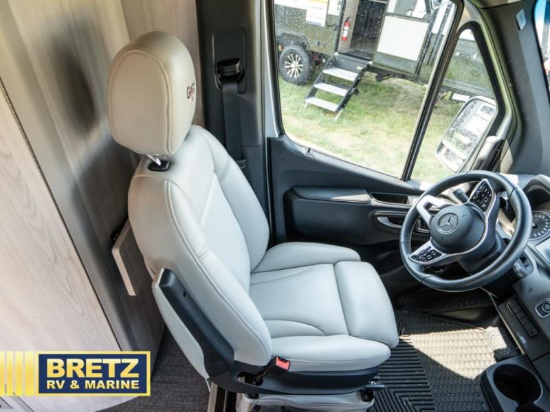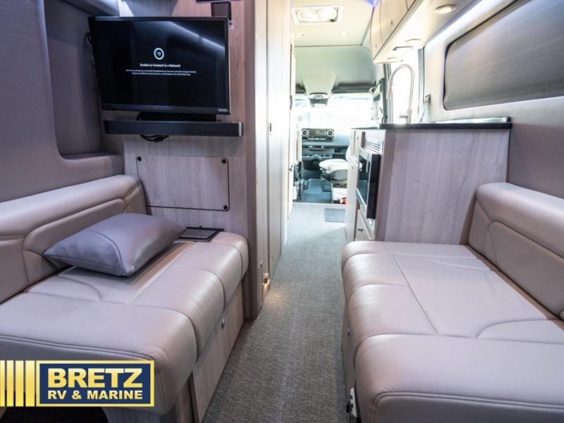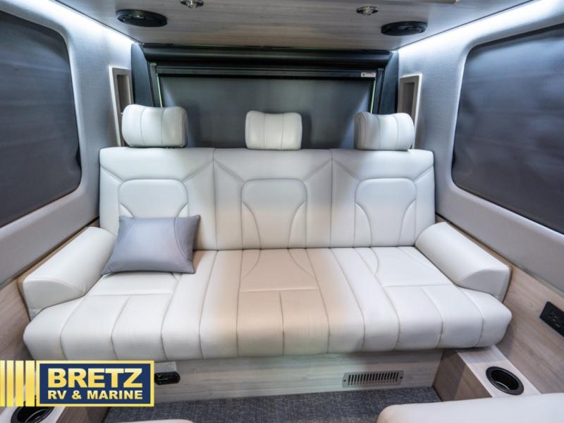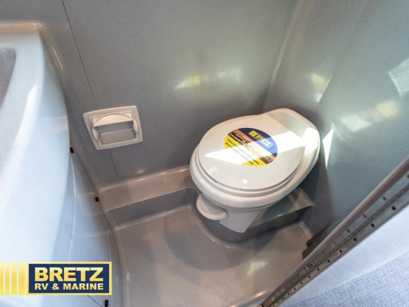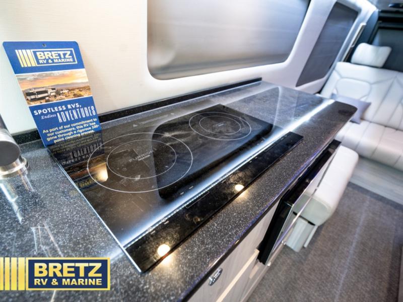 Luxury, functionality and sleeping for two is found in this versatile coach. There are seatbelts for seven for day trips with friends and a power sofa bed for couple's weekends. You will love the two captain's chairs that turn towards the rear for more seating once at your destination, and storage for your clothing is next to the wet bath. The private enclosed wet bath also includes a window and privacy shade. The cook can make meals using the galley kitchen with a farmhouse style sink, combo microwave/convection/air fryer and a two burner propane cooktop.