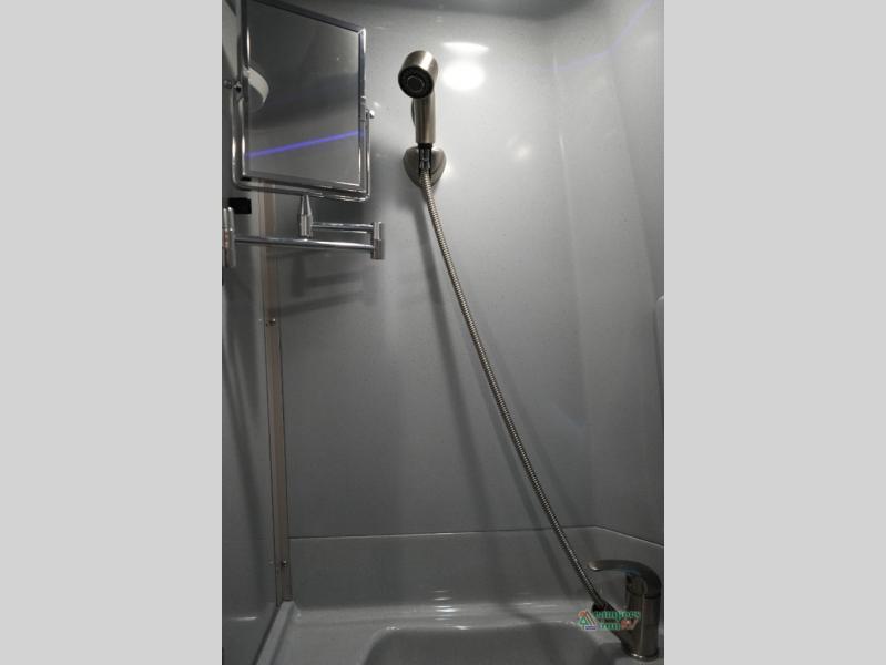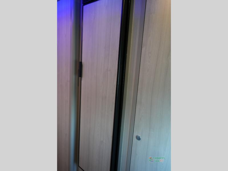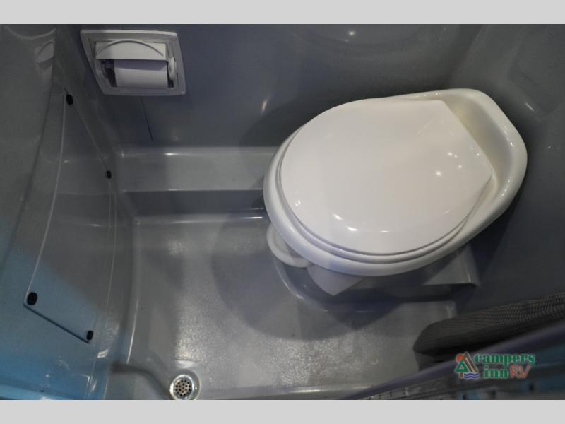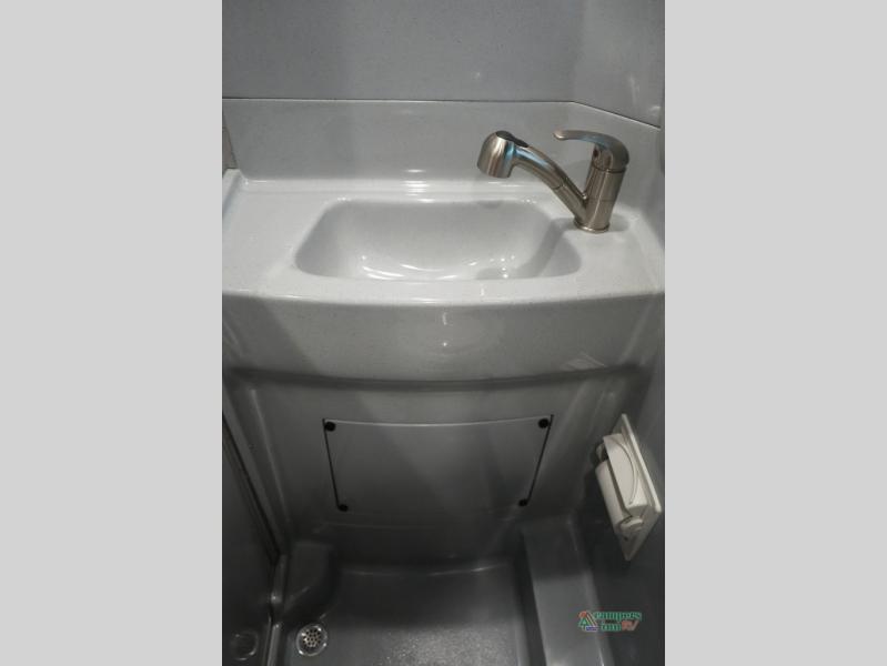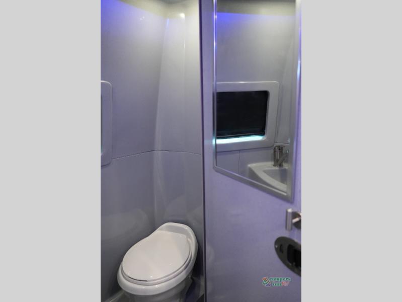 Fully Enclosed Wet Bath: Includes molded sink, vanity mirror, ceramic toilet, and retractable clothesline