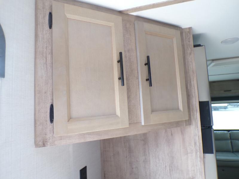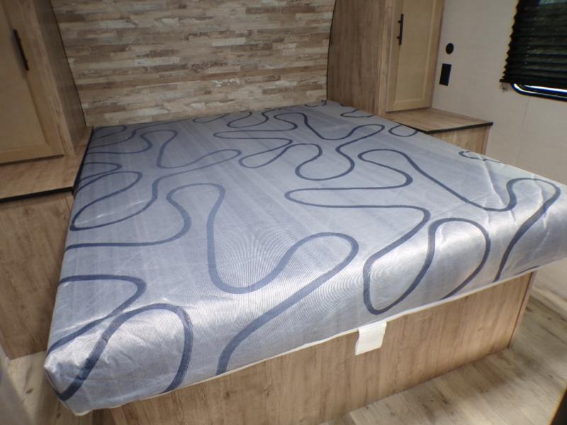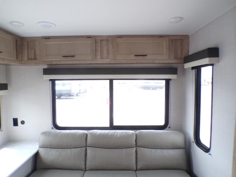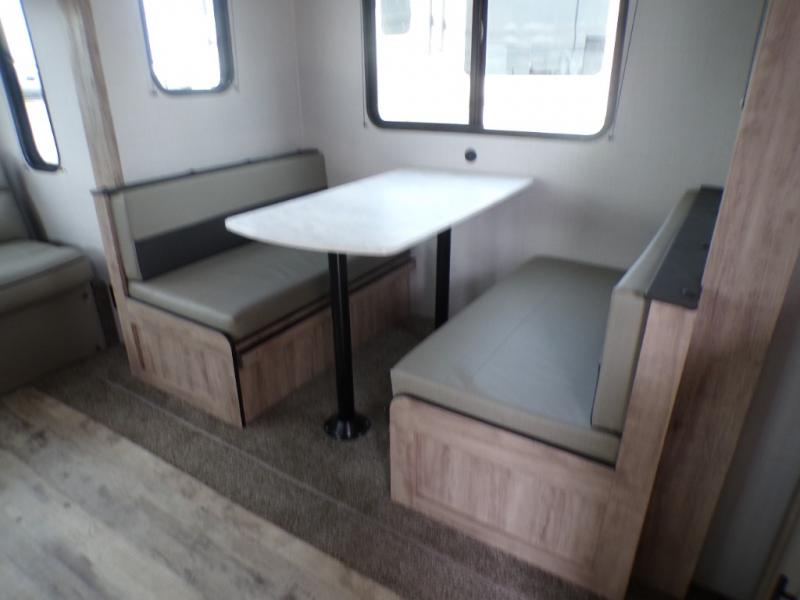 Camping with friends has never been so easy than in this cozy travel trailer. Once you arrive at your destination, prepare lunch on the three burner cooktop and you can dine at the booth dinette. Your guest can make this area their bed at night, along with the jack knife sofa. There is a front master bedroom with a queen bed that will feel just like home, and the two wardrobes provide a place for all your clothes. Head outside to find a pass-through storage, additional outside storage, plus an electric awning with LED lights!