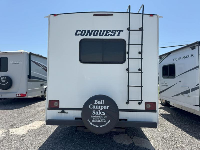As you look forward to your next getaway, think about the many different ways that this Conquest Class C gas motorhome will come in handy! When you're tired after a long day of hiking, you won't have to search out a local restaurant because you'll be able to easily make your own dinner on the three-burner range in the kitchen, grab some condiments from the double-door refrigerator, and wash up the dirty dishes in the double sink. When you just want to rest, you have quite a few choices for that too with the booth dinette, the jackknife sofa, the bunk above the cab, and the RV queen bed in the rear private bedroom.