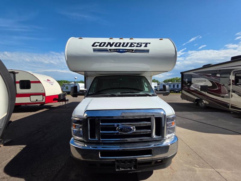 Each one of these Gulf Stream RV Conquest Class C gas motorhomes is built with a Cradle of Strength® on either the Ford E350 or E450 chassis depending on the model! Their construction also consists of a welded aluminum perimeter frame, a seamless EPDM rubber roof, and a high-gloss fiberglass exterior with Azdel synthetic substrate in the walls to prevent rotting. The included Conquest Luxury package comes with high-performance vinyl flooring throughout for an easier clean, all stainless steel appliances, and an AM/FM/CD stereo with built-in monitor and back-up camera. It also adds exterior conveniences like upgraded exterior lighting, upgraded exterior graphics, a friction-hinge entry door, and an electric awning with LED lights to relax under whether day or night!