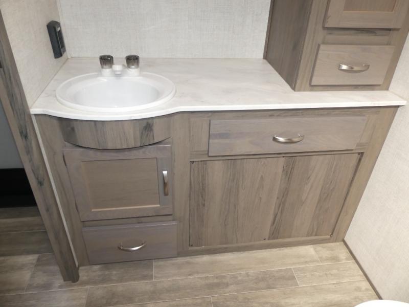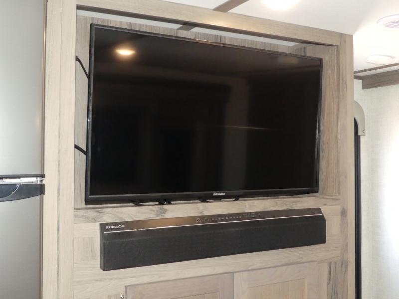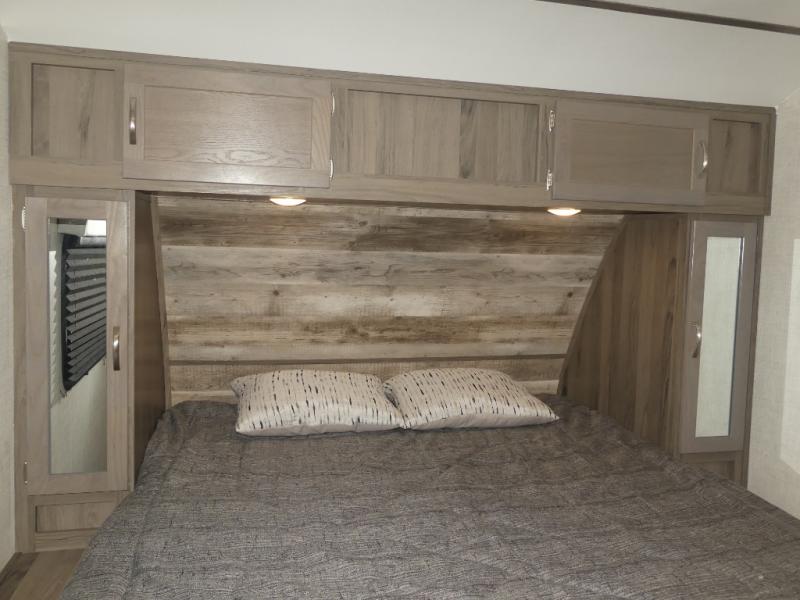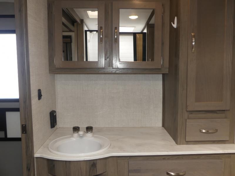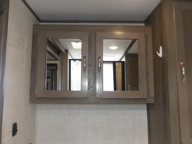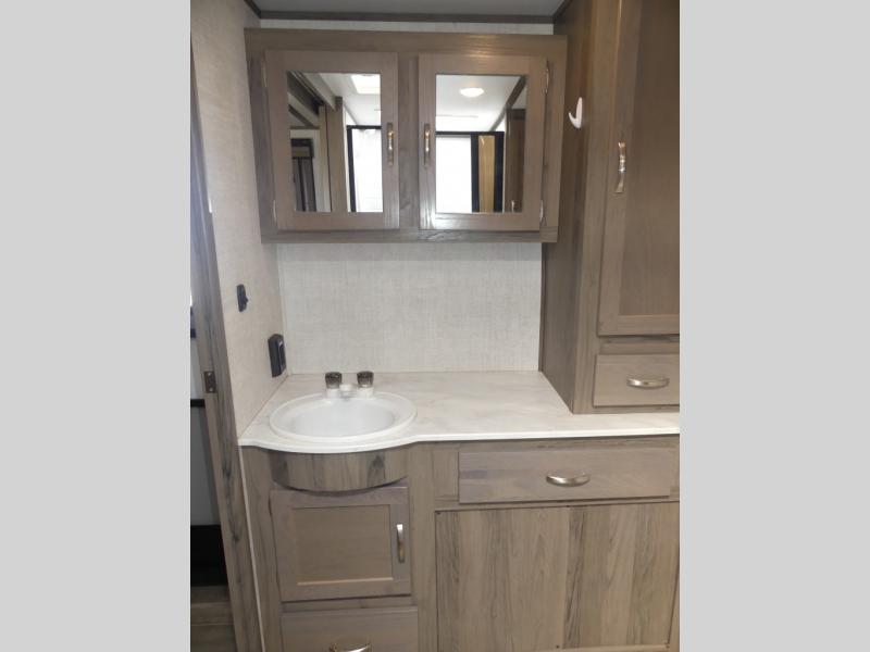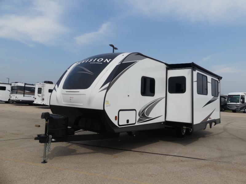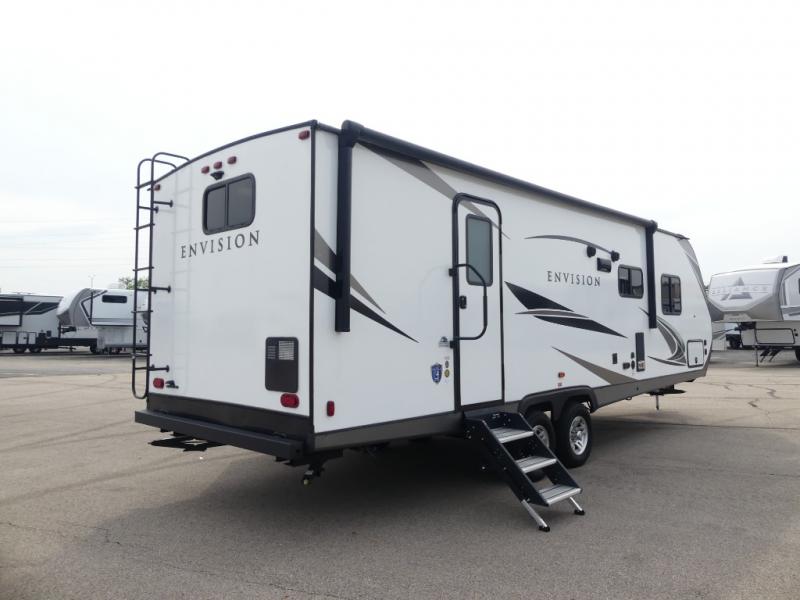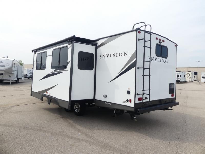 Each Envision travel trailer by Gulf Stream is constructed with fiberglass exterior sidewalls with Azdel, a molded fiberglass front cap with LED lights, and a one-piece vinyl roof for durability that lasts. The central command switch panel with a monitor panel lets you control your trailers functions in one easy location, and the new generation LED lighting will keep your space bright and open. Solid wood cabinetry, designer window treatments, and stainless steel appliances will make these models feel more like home, plus there's tons of storage space for your belongings. Some of the exterior features that will blow you away are the marine-grade exterior LED speakers, the power awning with LED lights, and the exterior docking station for your utility hookups. The Envision travel trailers are also prepped for solar, satellite, cable and back-up camera for hassle-free camping!