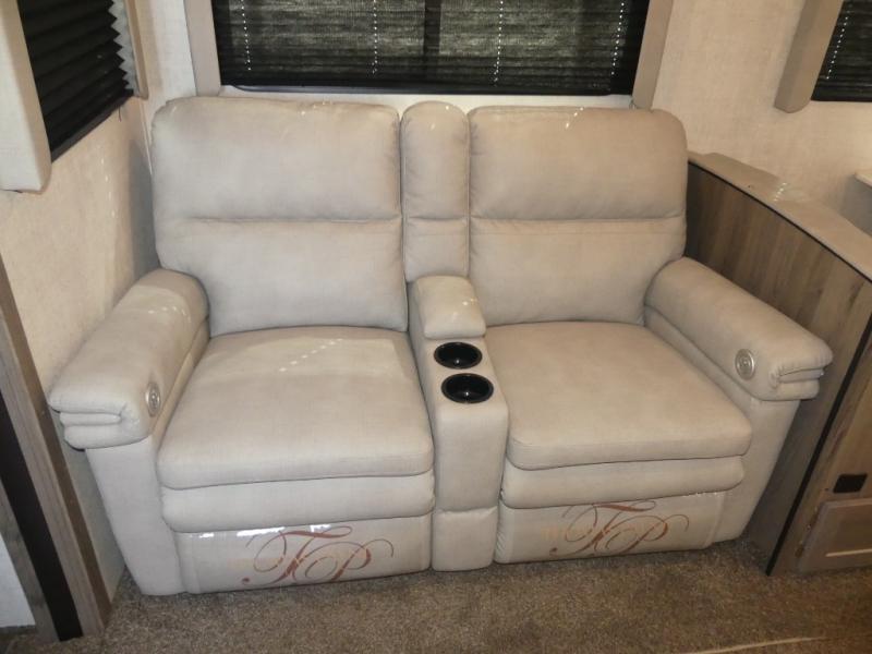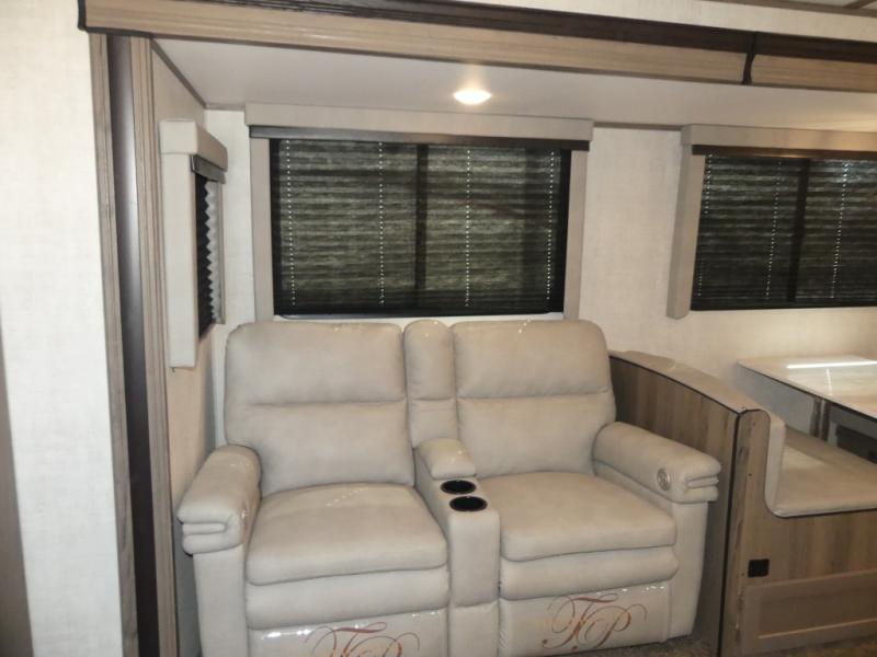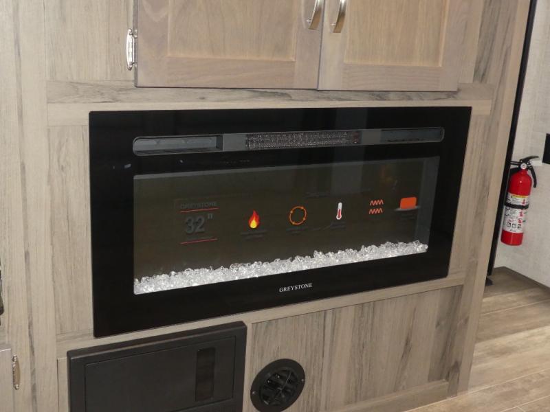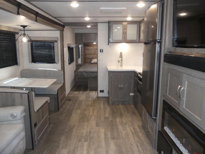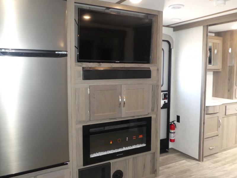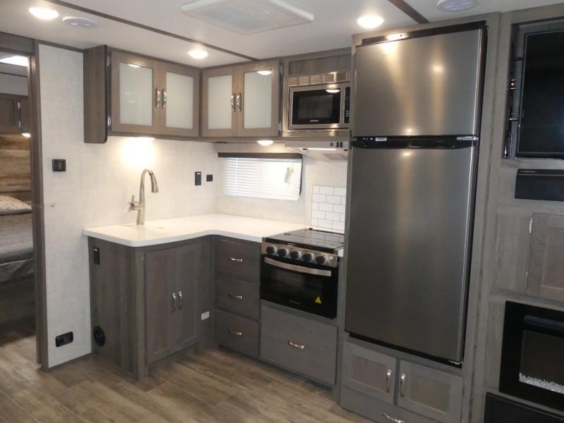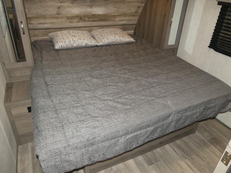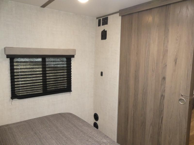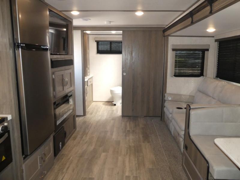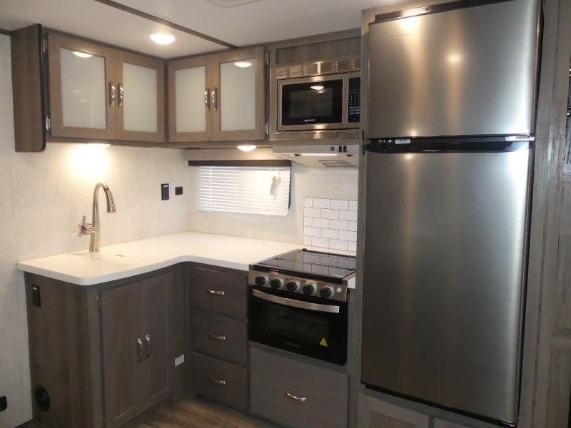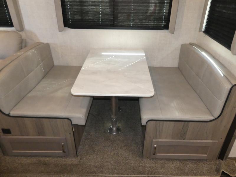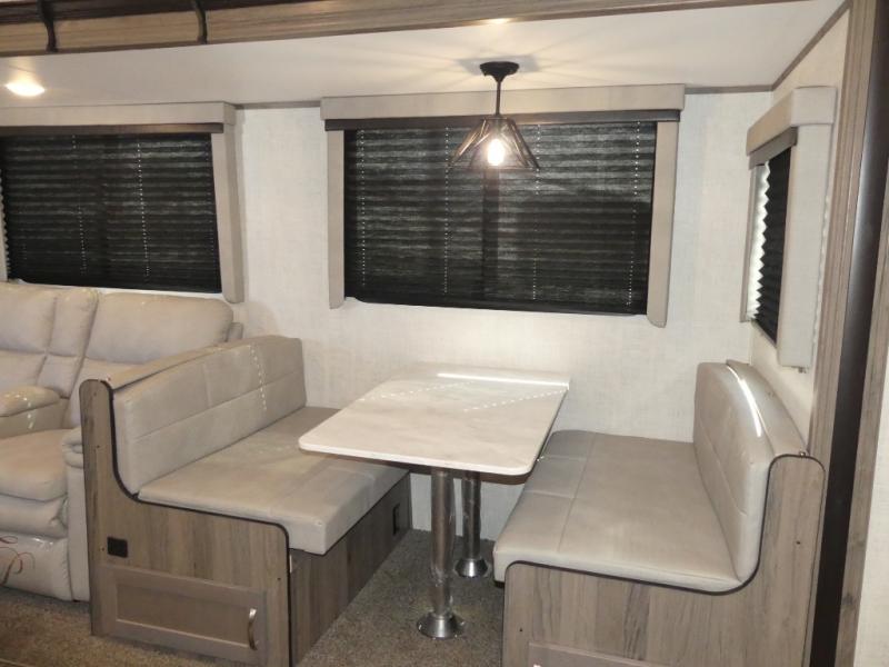 Trips to the lake are made complete with this travel trailer in tow! You will love the amount of interior space provided by the large slide out, and here you can dine at the booth dinette and relax on the theater seats. You will feel right at home in the front private bedroom that includes a queen bed, dual wardrobes, plus an under-bed shoe box. In the morning you can make breakfast on the stainless steel three burner cooktop, and there is a convenient dog dish drawer for your furry friends!
