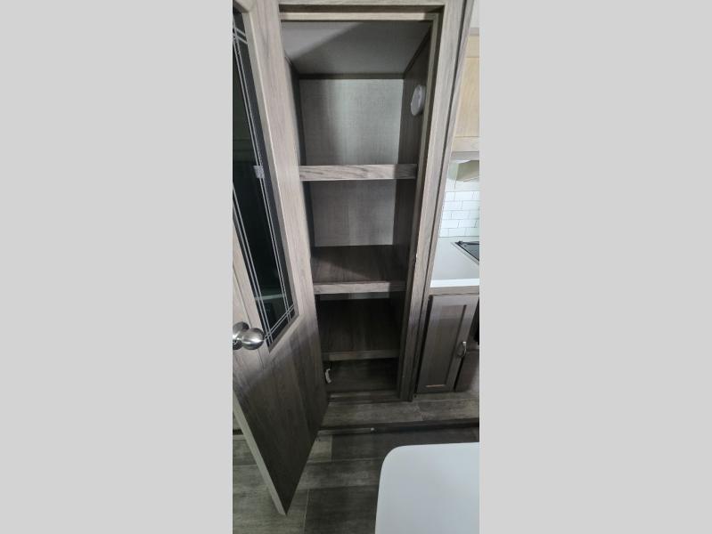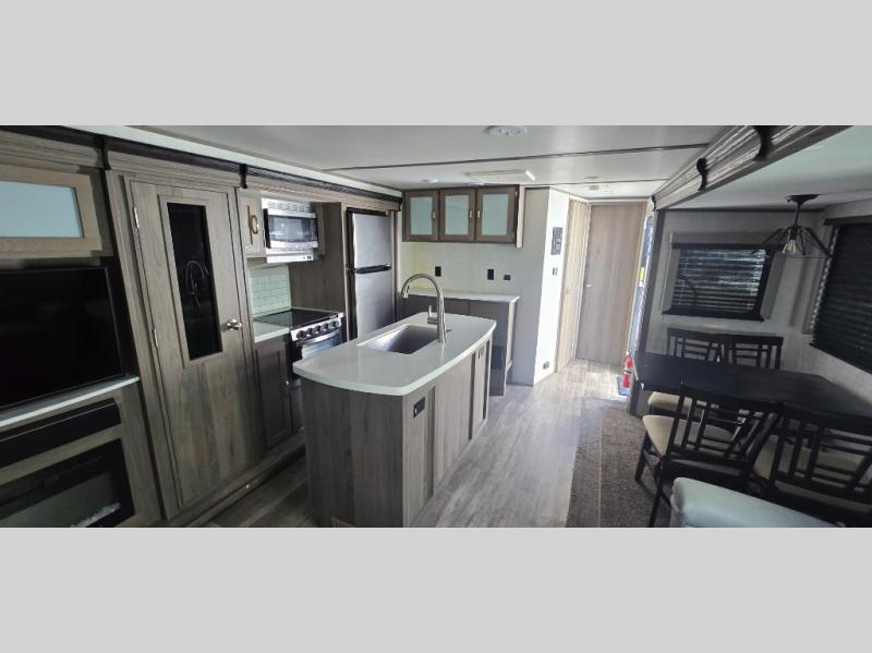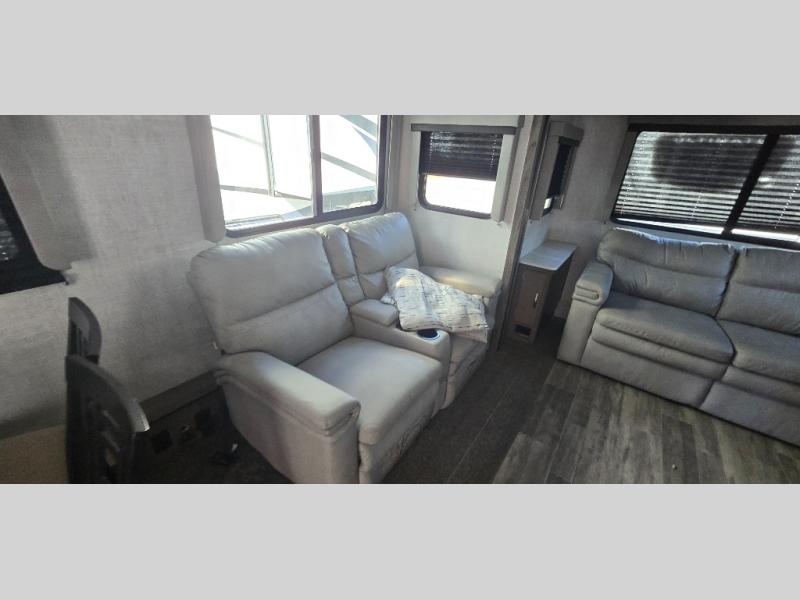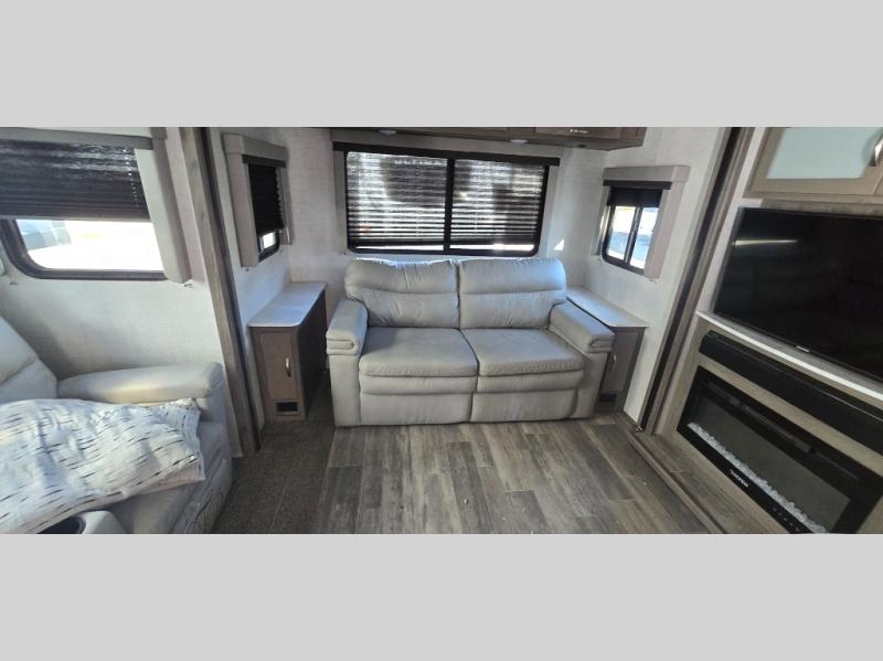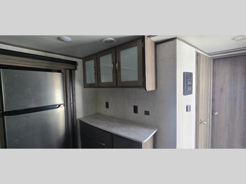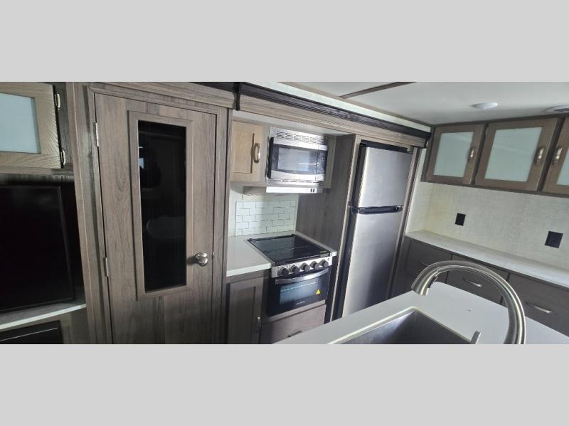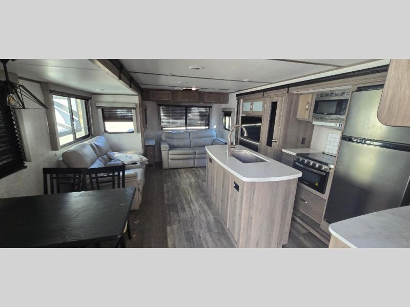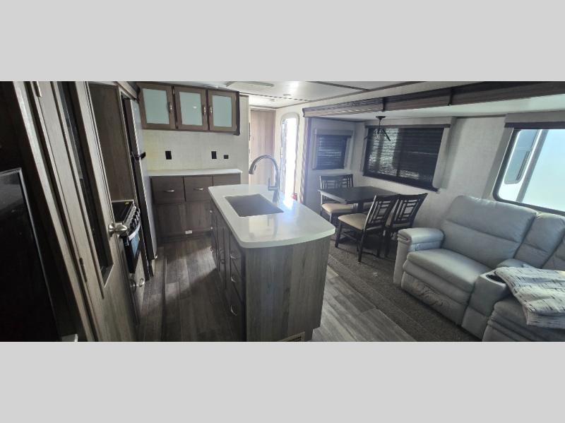 This travel trailer will feel more like home with its dual opposing slides for maximum space. The kitchen island will be a big plus with the chef of your group, plus there is an appliance center, a spacious pantry, and pull-down faucet with a sprayer for easy clean up. You'll find plenty of comfortable seating spaces on the two tri-fold sofas and the booth dinette, and you can even option one of the tri-fold sofas out for optional theater seats if you choose. Head to the front private bedroom after a day in the sun where you can grab your comfy clothes from the dual wardrobes and crash on the queen bed!