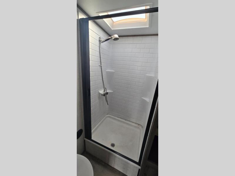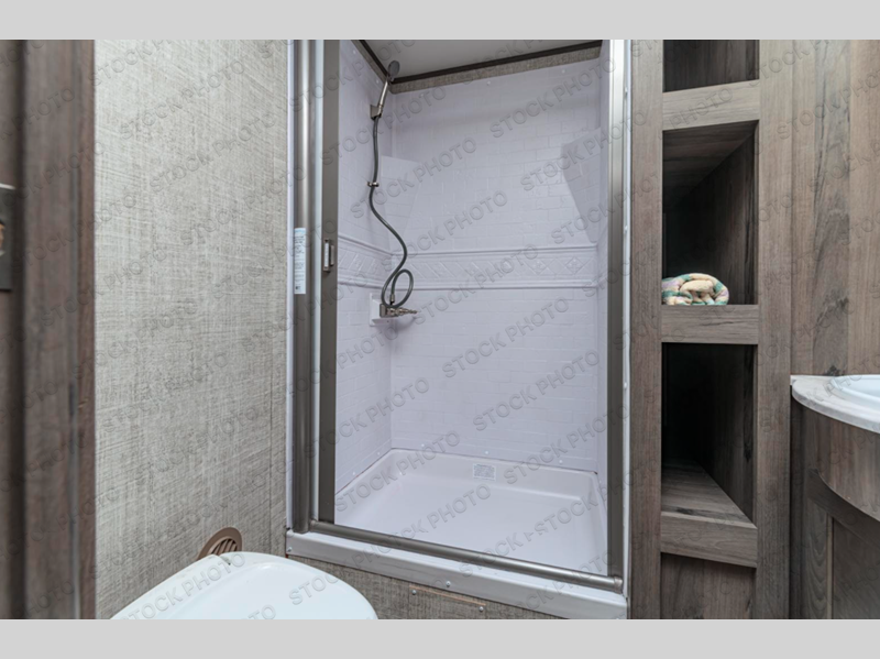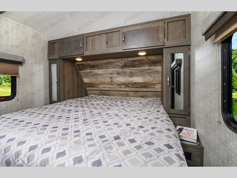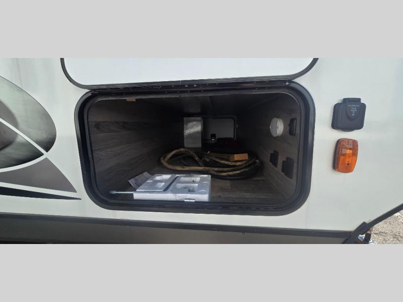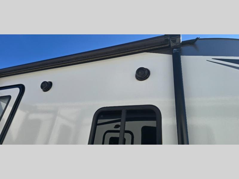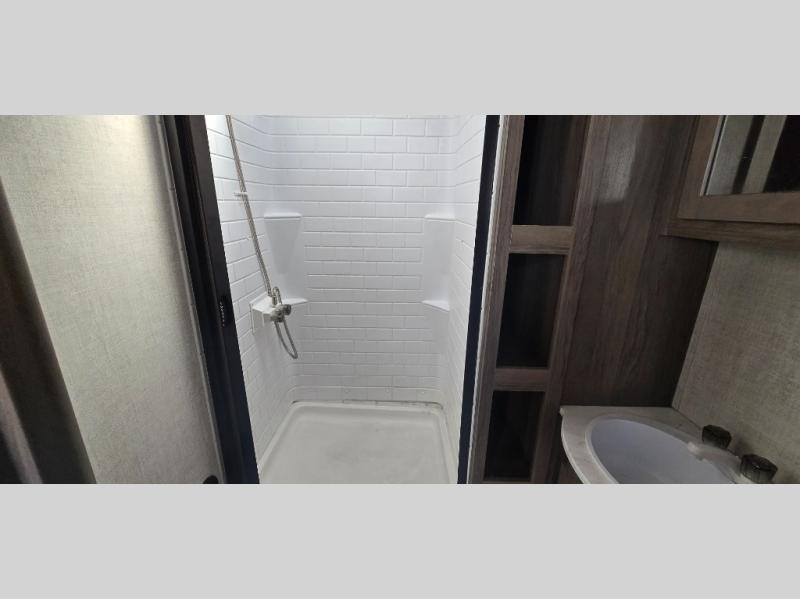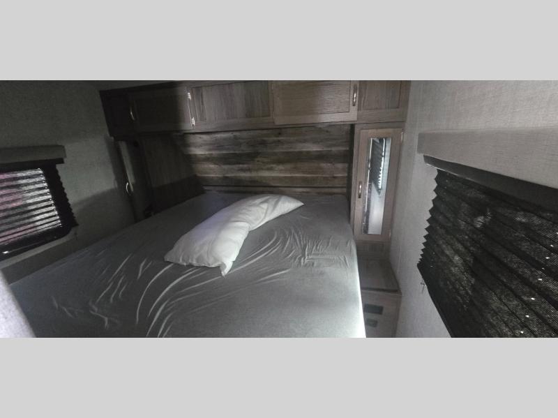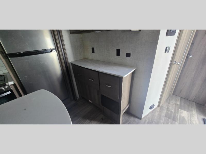 This travel trailer will feel more like home with its dual opposing slides for maximum space. The kitchen island will be a big plus with the chef of your group, plus there is an appliance center, a spacious pantry, and pull-down faucet with a sprayer for easy clean up. You'll find plenty of comfortable seating spaces on the two tri-fold sofas and the booth dinette, and you can even option one of the tri-fold sofas out for optional theater seats if you choose. Head to the front private bedroom after a day in the sun where you can grab your comfy clothes from the dual wardrobes and crash on the queen bed!