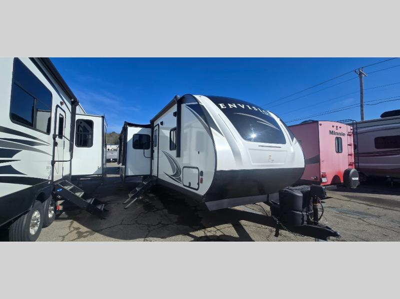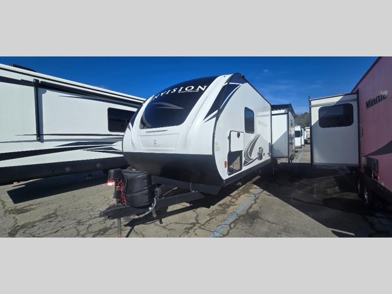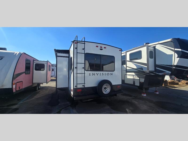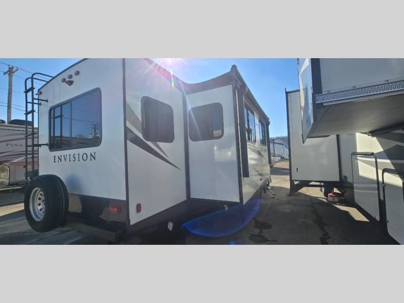 Each Envision travel trailer by Gulf Stream is constructed with fiberglass exterior sidewalls with Azdel, a molded fiberglass front cap with LED lights, and a one-piece vinyl roof for durability that lasts. The central command switch panel with a monitor panel lets you control your trailers functions in one easy location, and the new generation LED lighting will keep your space bright and open. Solid wood cabinetry, designer window treatments, and stainless steel appliances will make these models feel more like home, plus there's tons of storage space for your belongings. Some of the exterior features that will blow you away are the marine-grade exterior LED speakers, the power awning with LED lights, and the exterior docking station for your utility hookups. The Envision travel trailers are also prepped for solar, satellite, cable and back-up camera for hassle-free camping!