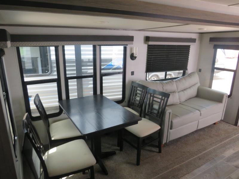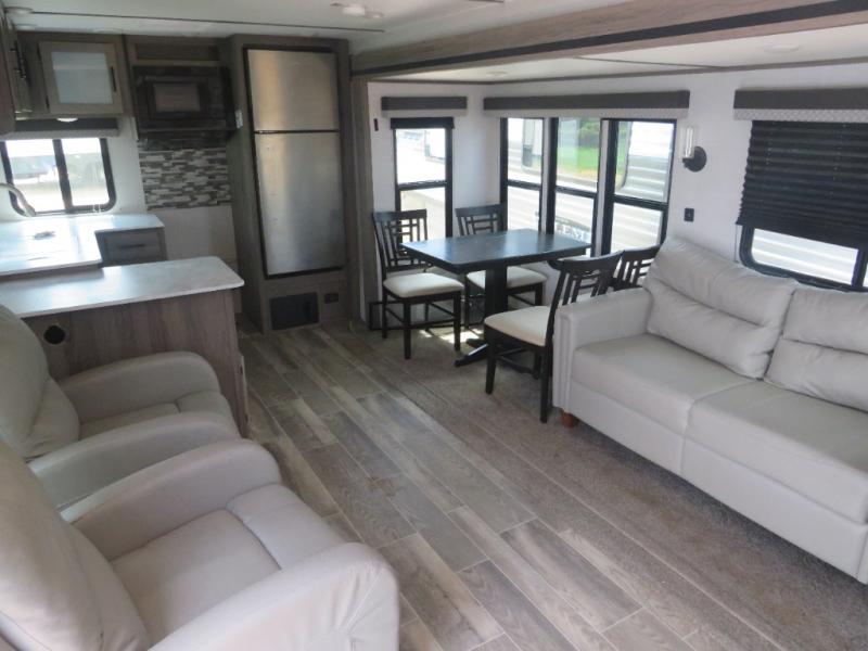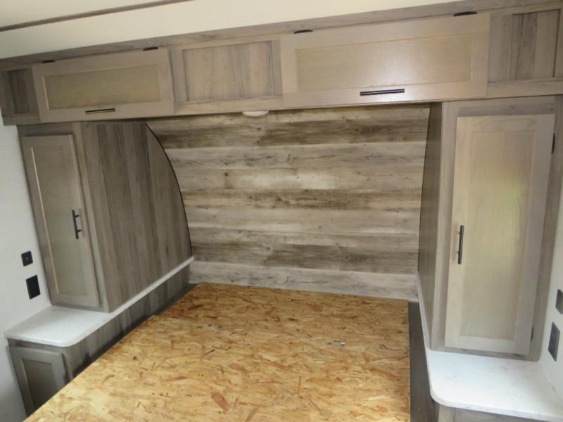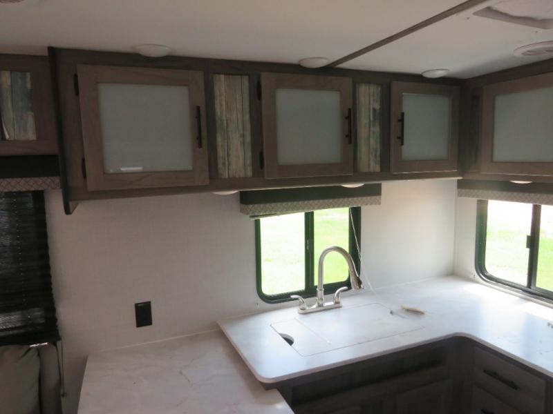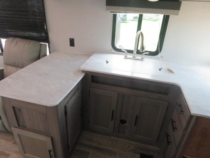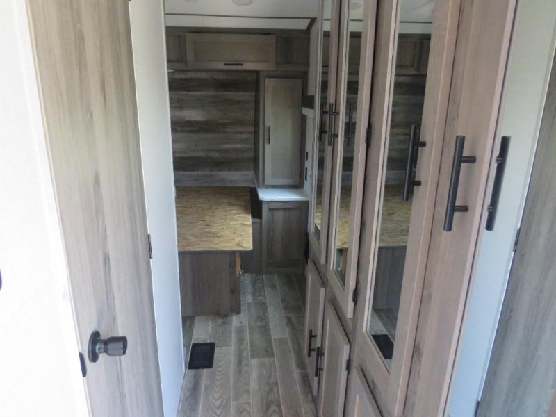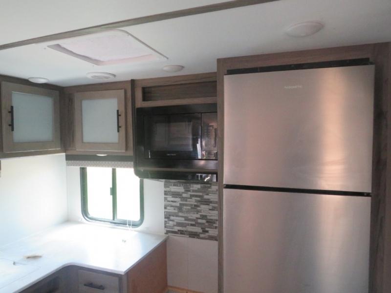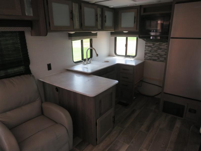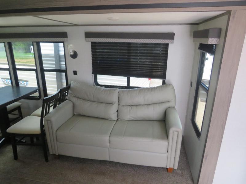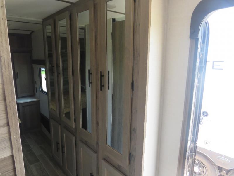 Where ever you camp, you will be comfortable in this trailer that offers a spacious private bedroom with a space saving sliding door, a walk-around queen-size bed, and clothing storage. The hallway provides a unique wardrobe that you can offer your guests, or store more items for yourself for those longer trips. The full bathroom provides linen storage as well. The main living and kitchen area is spacious with a slide out that includes a tri-fold sofa bed and booth dinette, or choose the table and chairs option, plus there are two lounge chairs to relax in. And the rear kitchen includes appliances and extra counter space that wraps around the other wall offering a U-shaped area so you have plenty of space to prepare and serve meals.