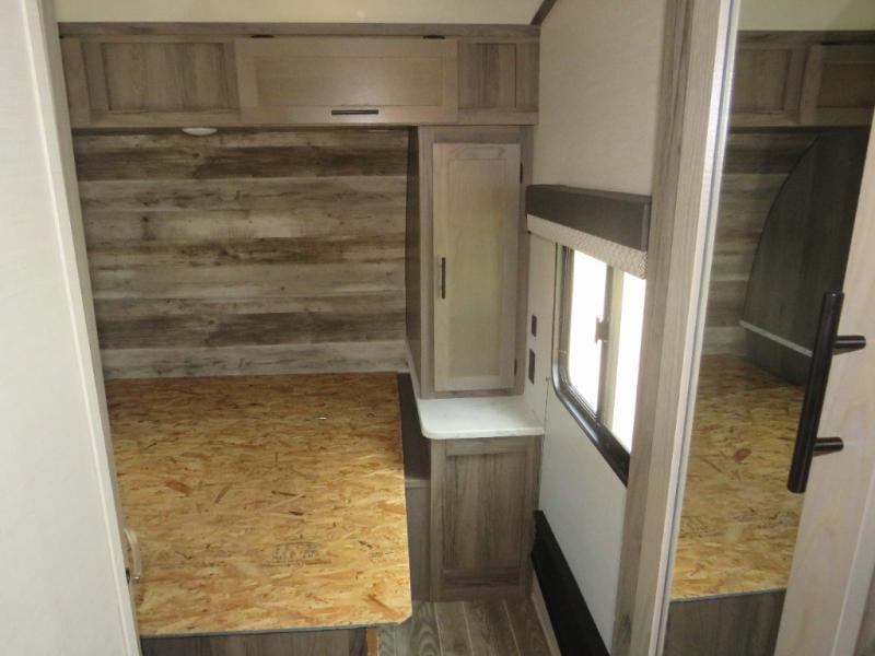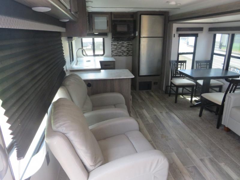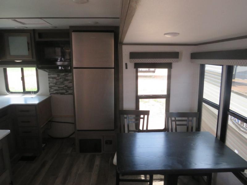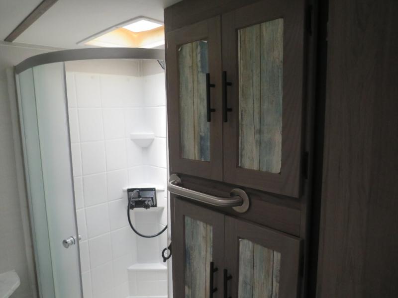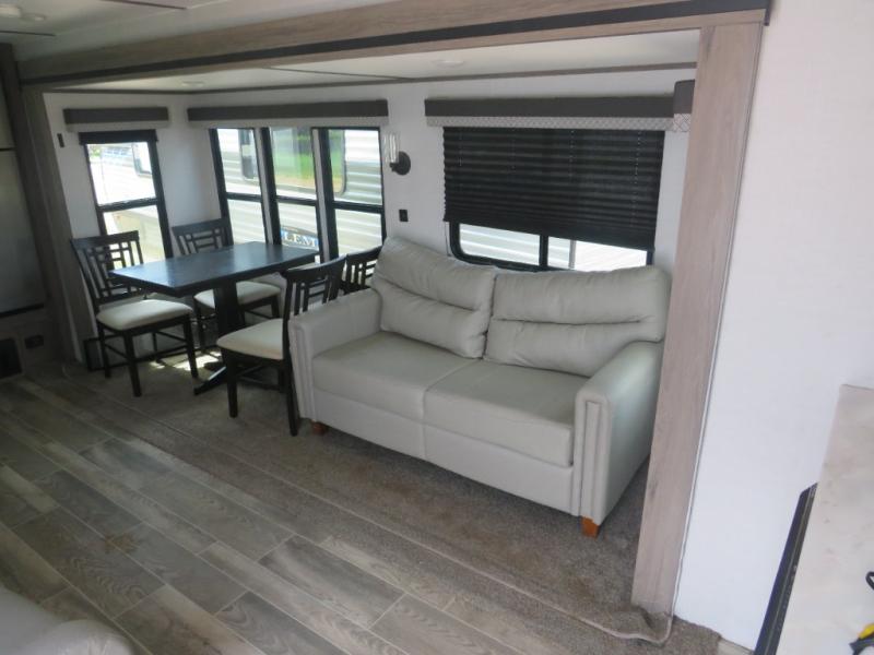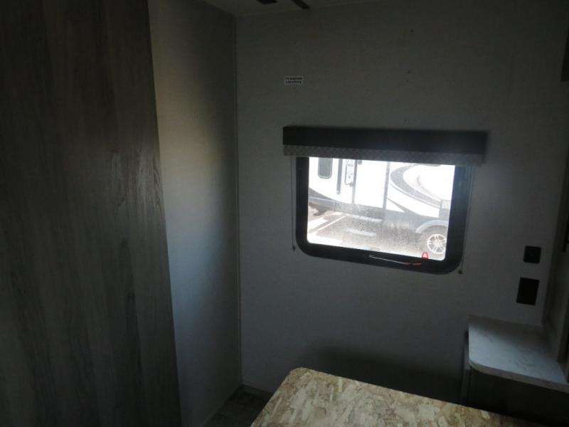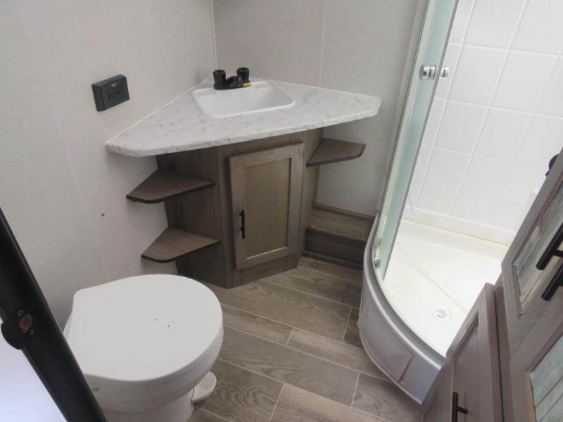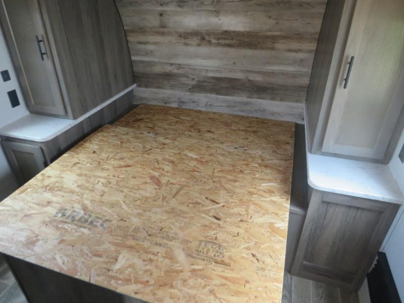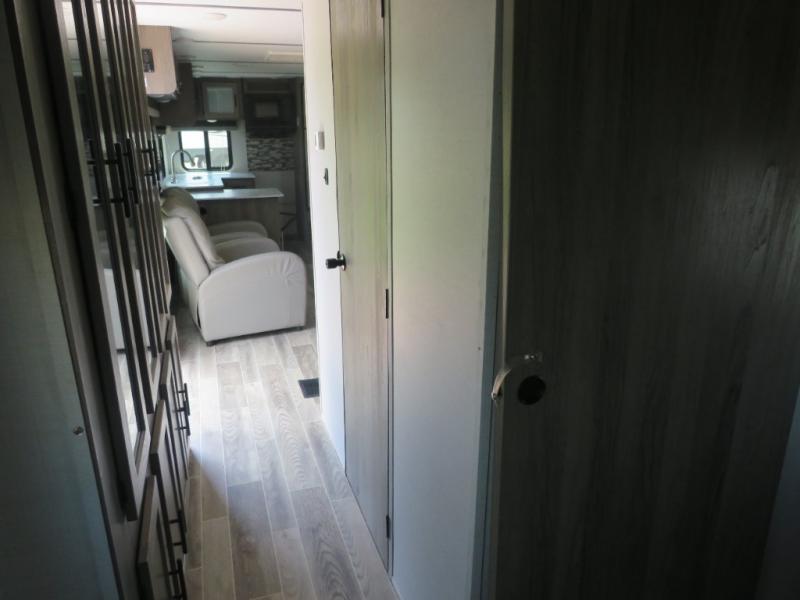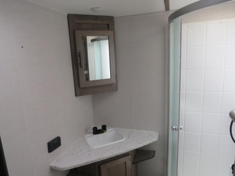 Where ever you camp, you will be comfortable in this trailer that offers a spacious private bedroom with a space saving sliding door, a walk-around queen-size bed, and clothing storage. The hallway provides a unique wardrobe that you can offer your guests, or store more items for yourself for those longer trips. The full bathroom provides linen storage as well. The main living and kitchen area is spacious with a slide out that includes a tri-fold sofa bed and booth dinette, or choose the table and chairs option, plus there are two lounge chairs to relax in. And the rear kitchen includes appliances and extra counter space that wraps around the other wall offering a U-shaped area so you have plenty of space to prepare and serve meals.