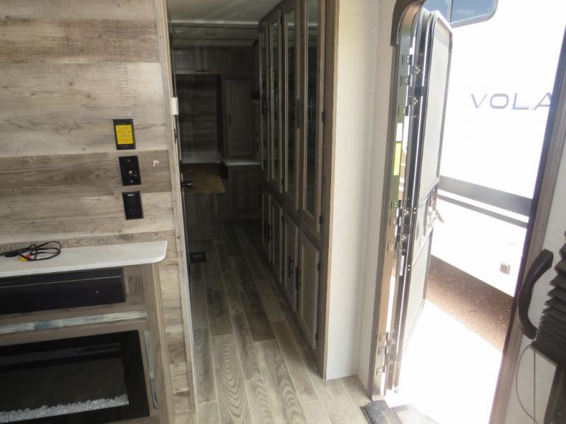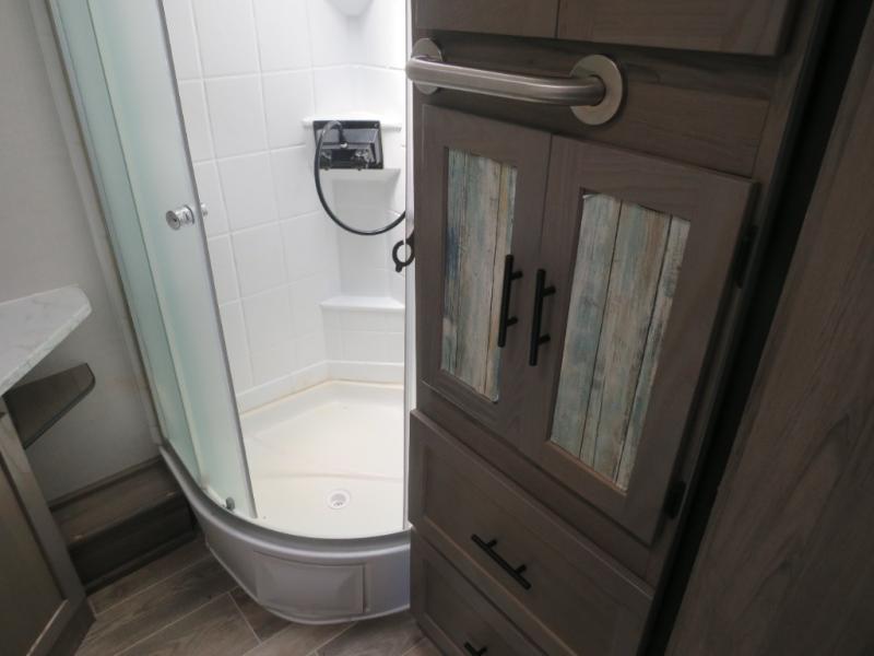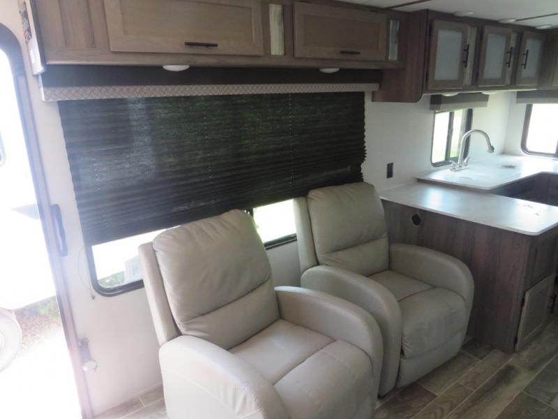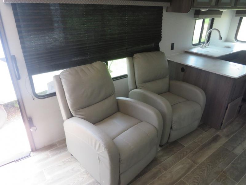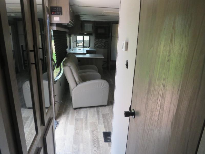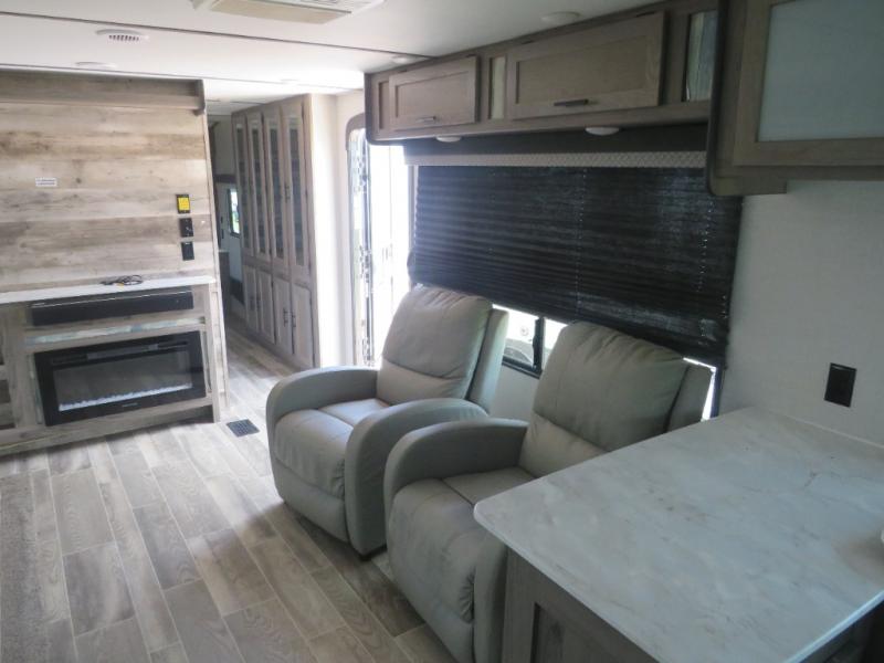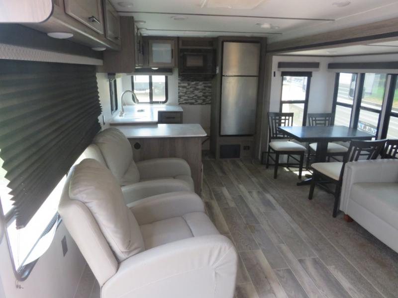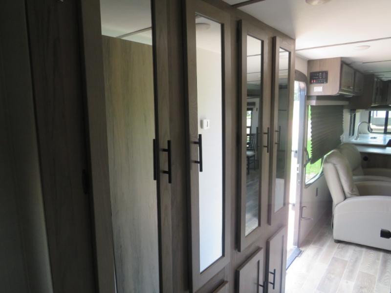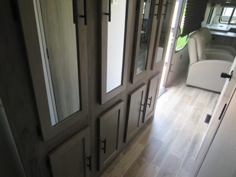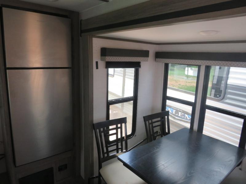 Where ever you camp, you will be comfortable in this trailer that offers a spacious private bedroom with a space saving sliding door, a walk-around queen-size bed, and clothing storage. The hallway provides a unique wardrobe that you can offer your guests, or store more items for yourself for those longer trips. The full bathroom provides linen storage as well. The main living and kitchen area is spacious with a slide out that includes a tri-fold sofa bed and booth dinette, or choose the table and chairs option, plus there are two lounge chairs to relax in. And the rear kitchen includes appliances and extra counter space that wraps around the other wall offering a U-shaped area so you have plenty of space to prepare and serve meals.