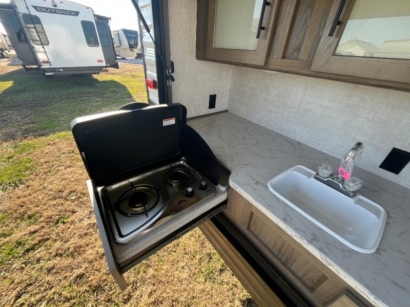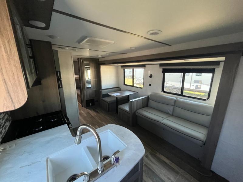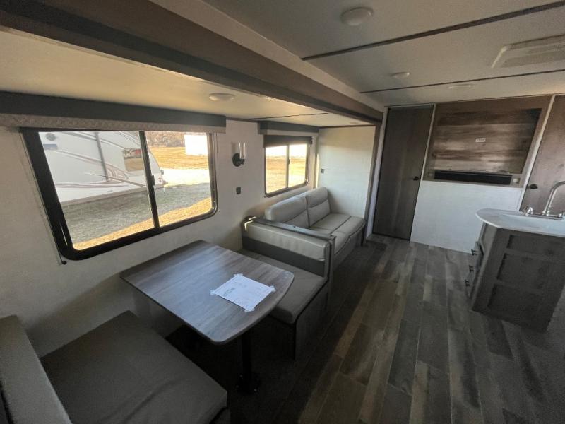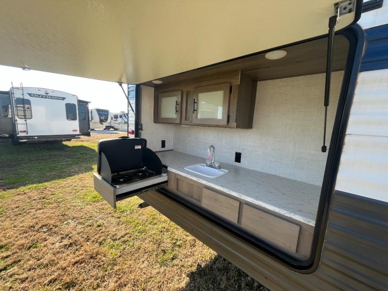 Calling all groups that need sleeping space for nine and outdoor fun! This trailer is perfect for a bigger group of friends or a larger family thanks to rear private bunkhouse with four bunks, a furniture slide out with a booth dinette and sofa, plus a private bedroom with a queen-size bed. Even on a rainy day, everyone will have their own space in one of the rooms. The chef will have full amenities to make meals, plus you might like to add the optional outside kitchen for more choices at meal time. The outside also offers a pass-through compartment for larger items and more gear, and the electric awning with LED lights provides an outdoor living area to enjoy.
