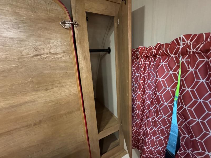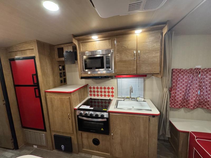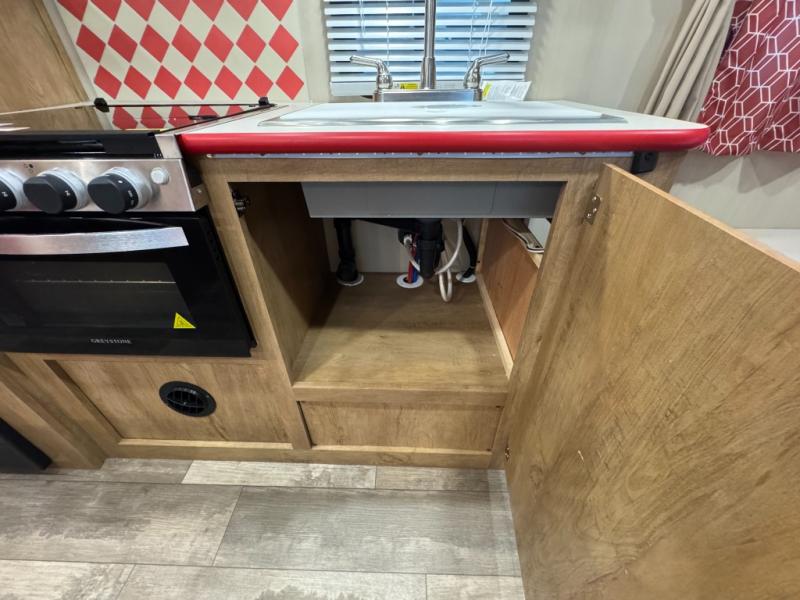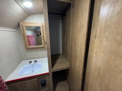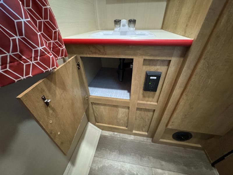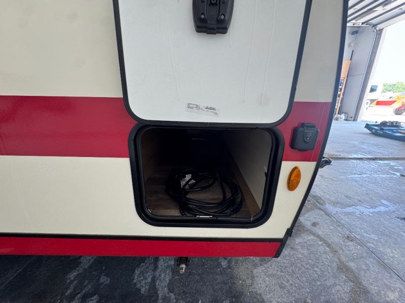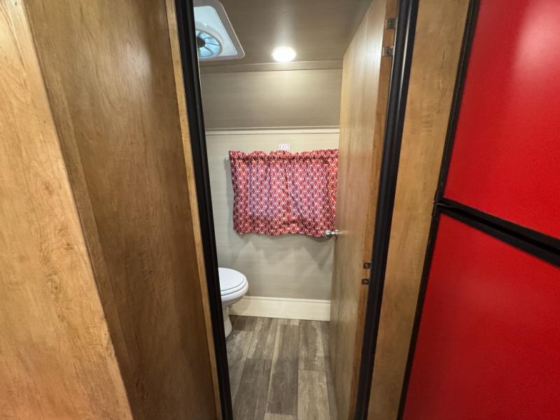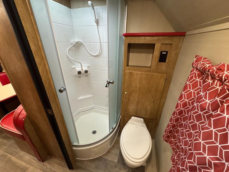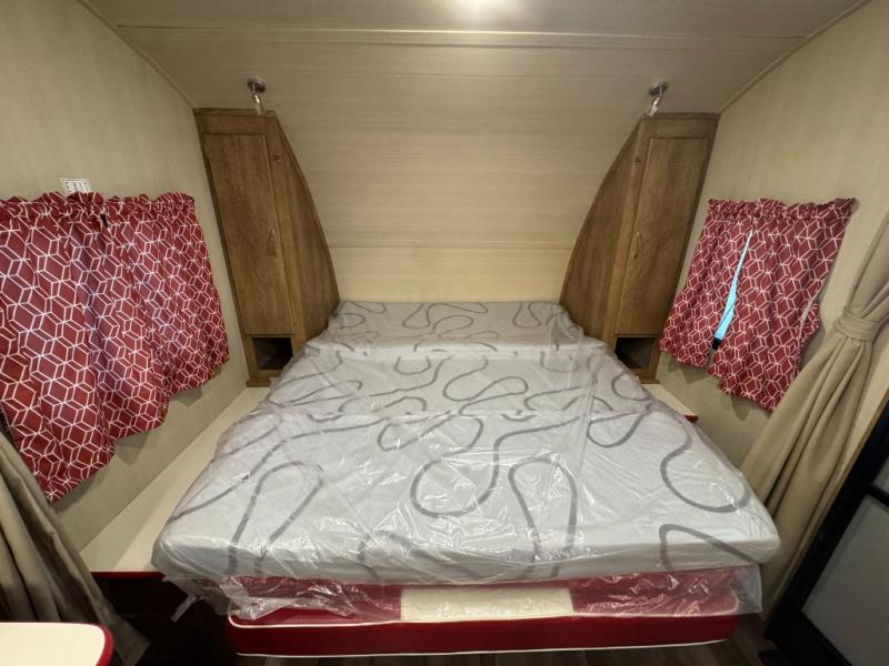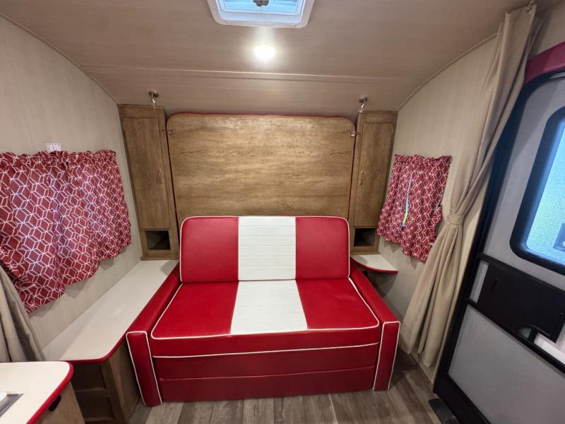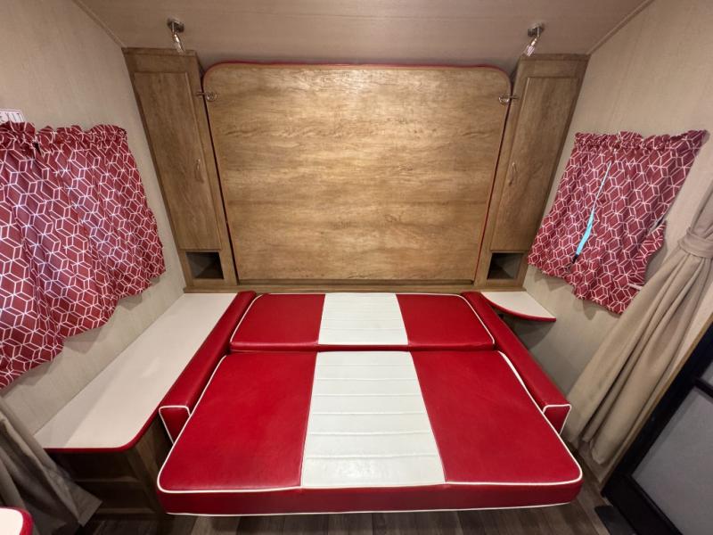Versatility comes standard in this travel trailer thanks to the jack knife sofa up front that converts to an RV queen Murphy bed. There is a privacy curtain here as well for some privacy, and dual shirt closets for your belongings. Once breakfast is made on the two burner cooktop, you can dine at the booth dinette or take your plate outdoors to sit under the electric awning with LED lights. You won't have to leave anything behind since this model includes ample storage inside, plus an exterior pass-through storage for fishing poles, tackle boxes, and lawn chairs!