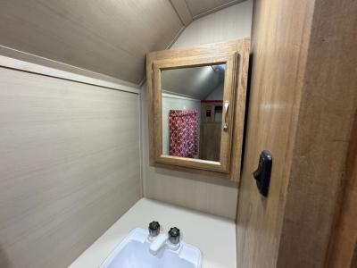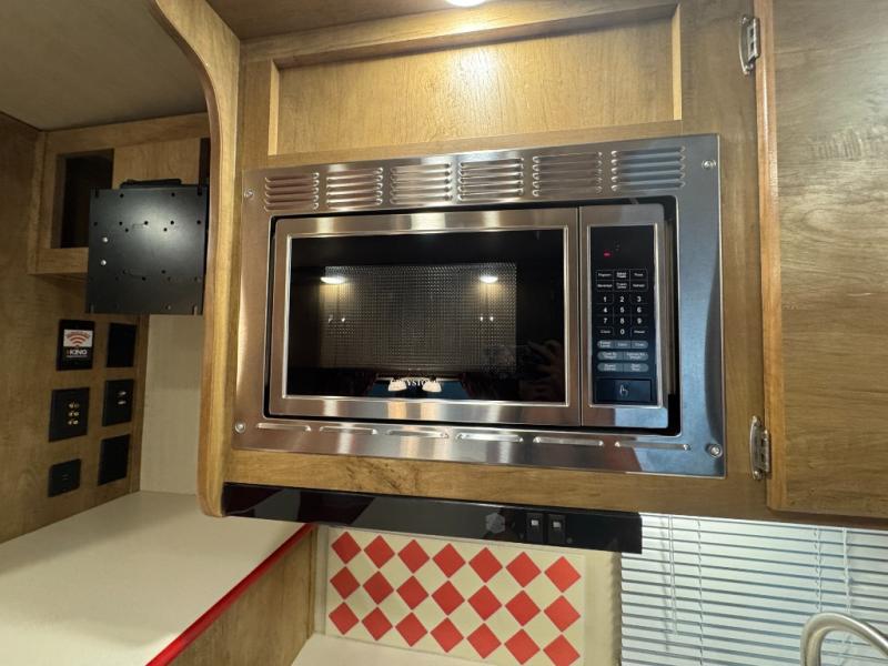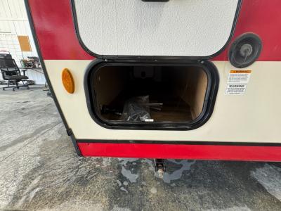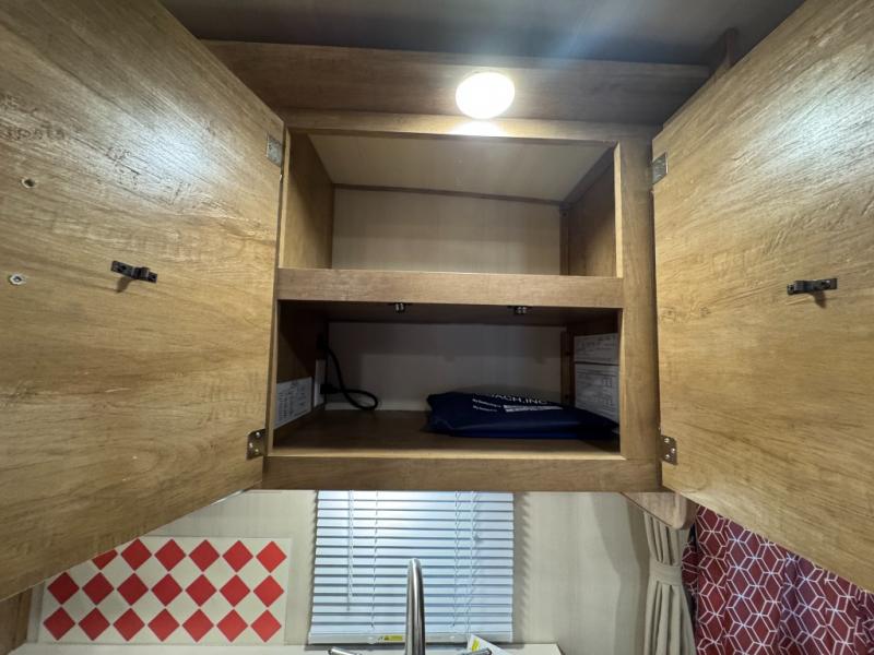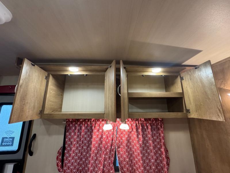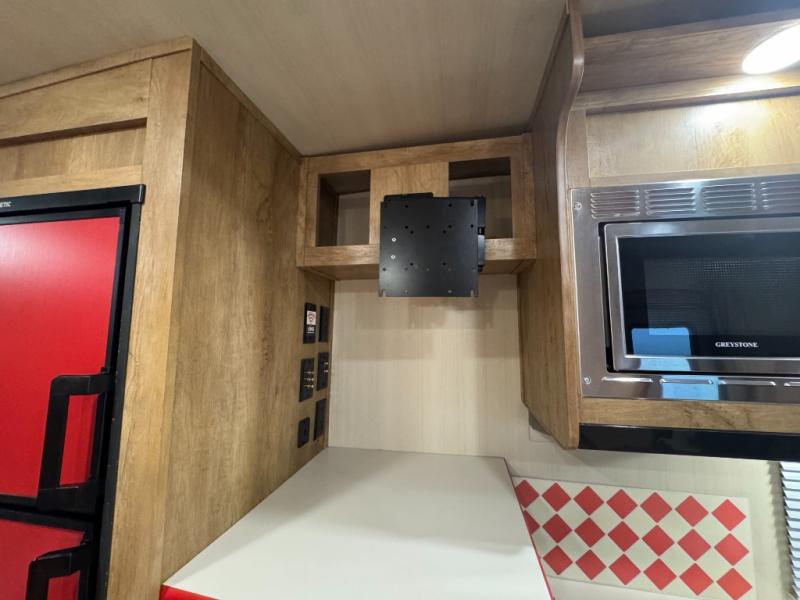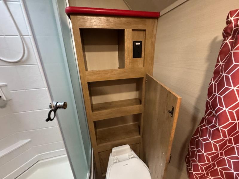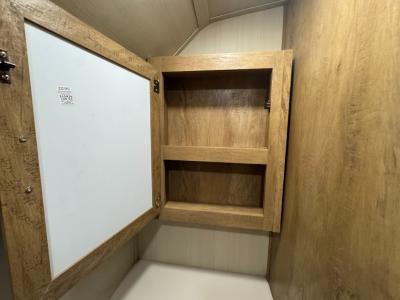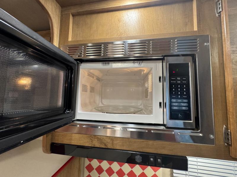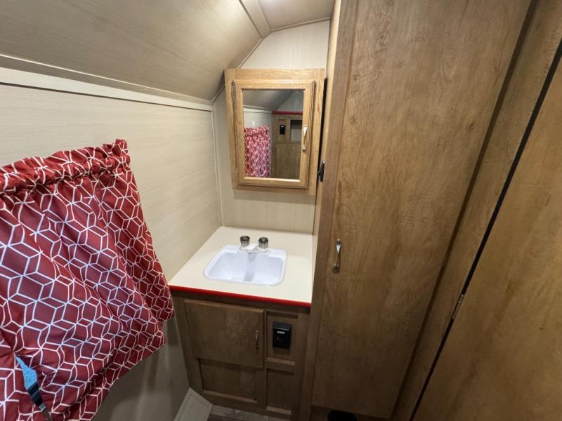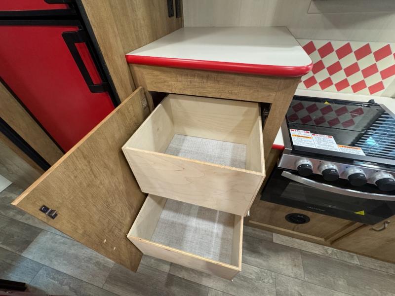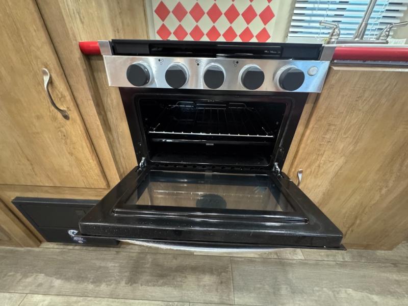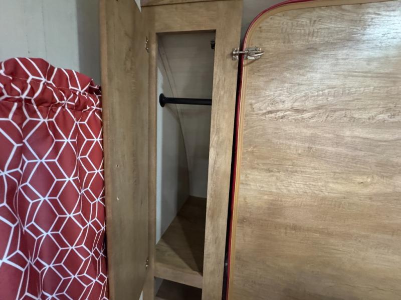 Versatility comes standard in this travel trailer thanks to the jack knife sofa up front that converts to an RV queen Murphy bed. There is a privacy curtain here as well for some privacy, and dual shirt closets for your belongings. Once breakfast is made on the two burner cooktop, you can dine at the booth dinette or take your plate outdoors to sit under the electric awning with LED lights. You won't have to leave anything behind since this model includes ample storage inside, plus an exterior pass-through storage for fishing poles, tackle boxes, and lawn chairs!