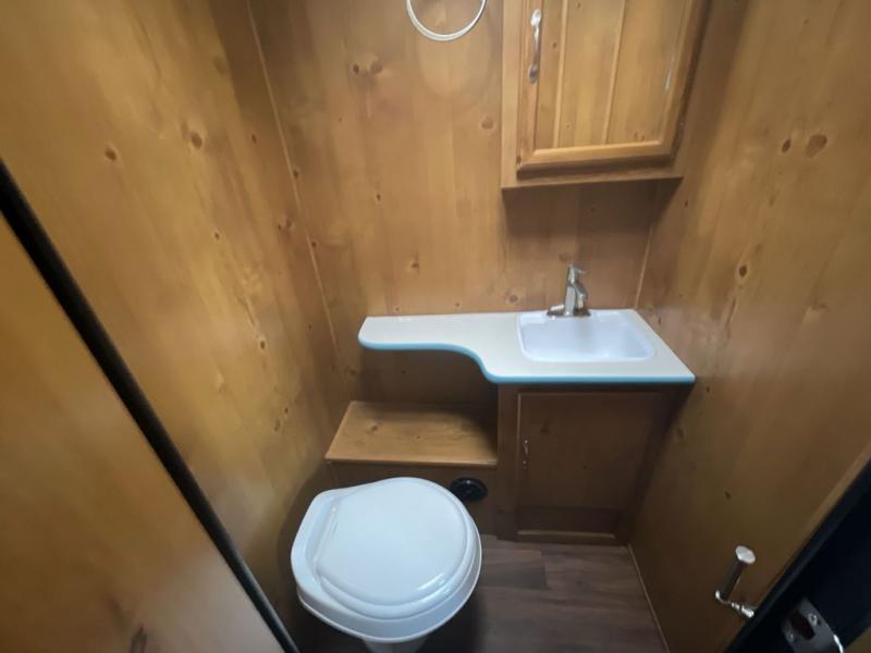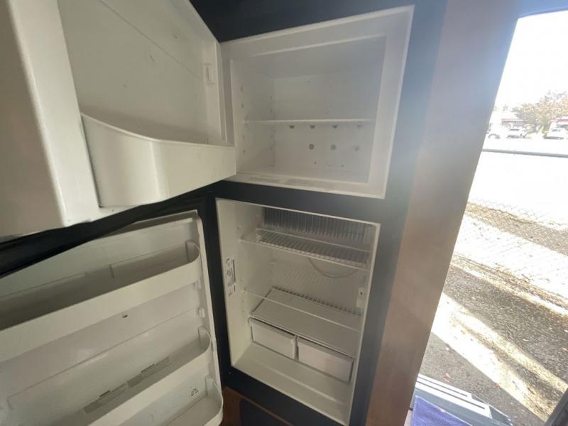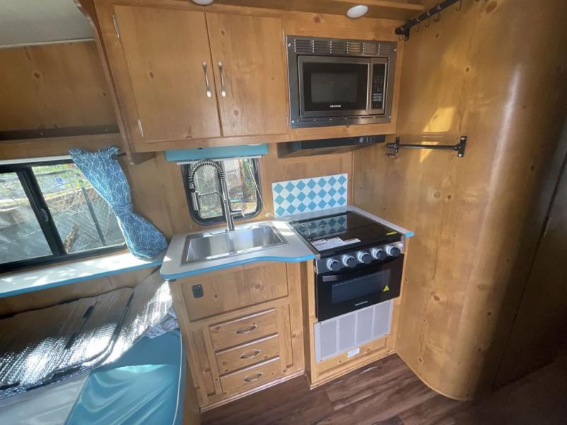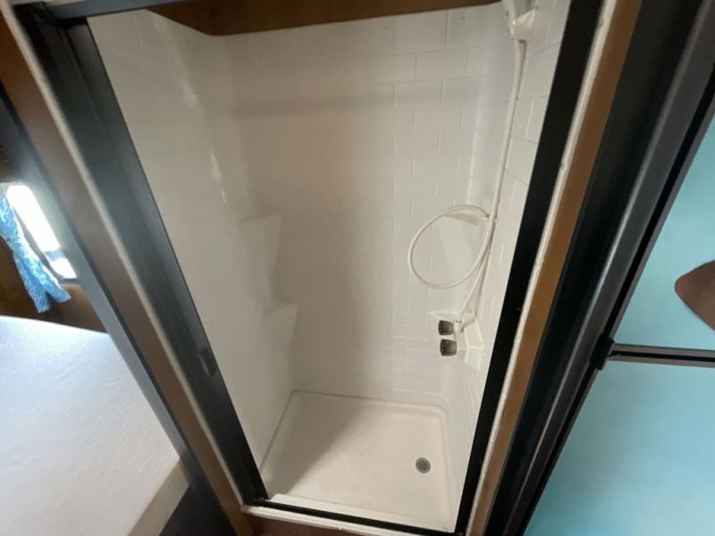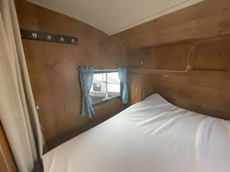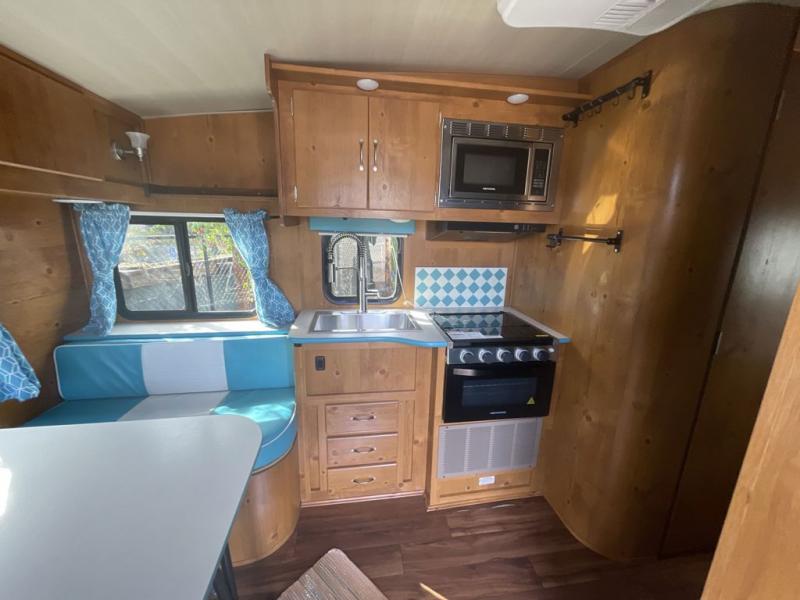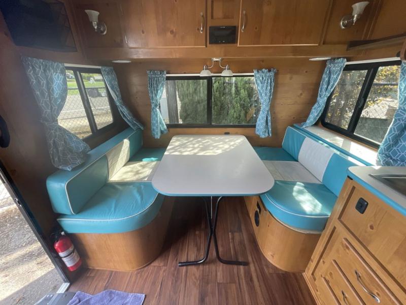 This travel trailer has the same layout as model 18MBS, but you'll enjoy a fixed RV queen bed up front instead of the Murphy bed. The full rear bath includes a linen closet and a wardrobe to keep your necessities organized, and you'll find additional storage throughout this model for your belongings. The vintage booth dinette will be the perfect place to dine at after dinner is made on the two burner cooktop. There is also a microwave oven for quick meals and a 6 cu. ft. double door refrigerator for cold drinks and perishables. And don't forget about the exterior pass-through storage for your larger camp gear!