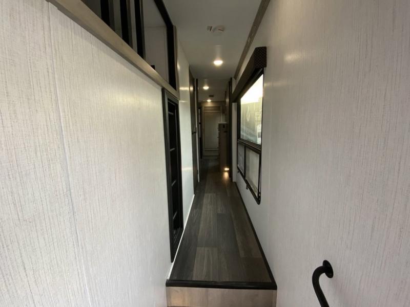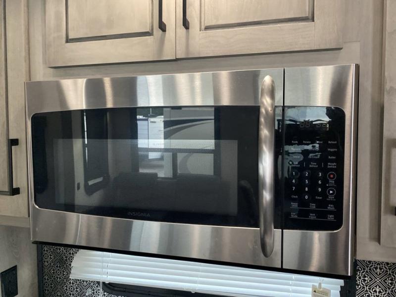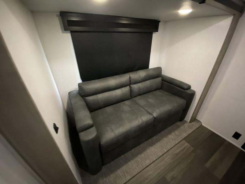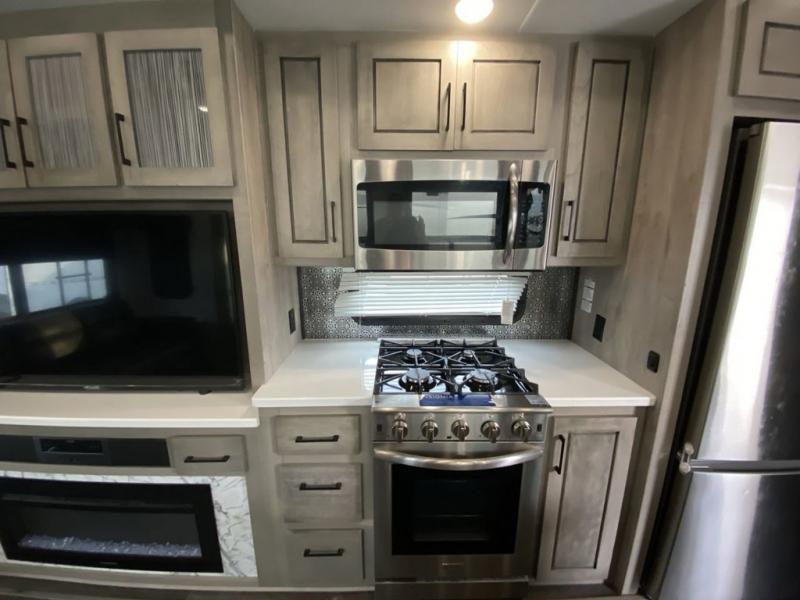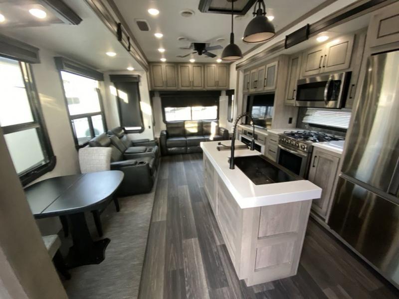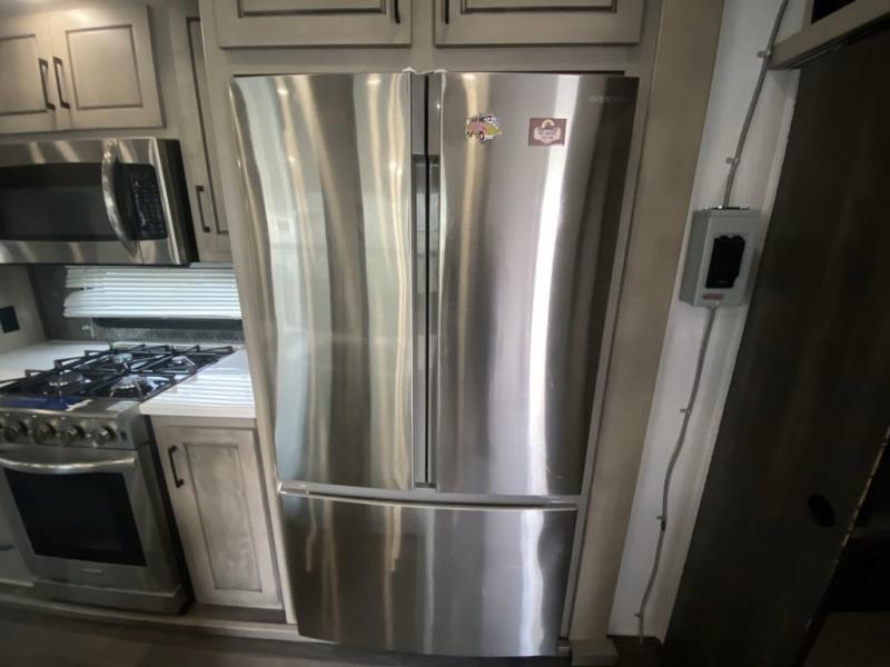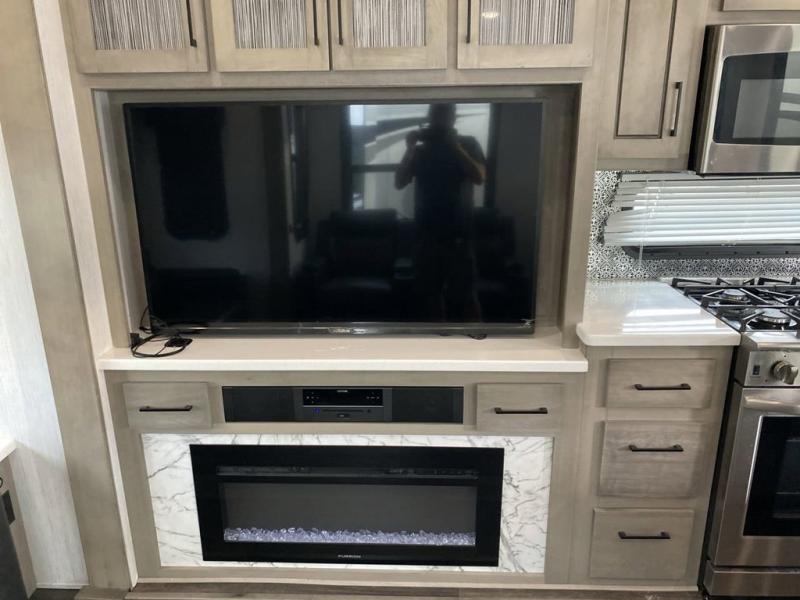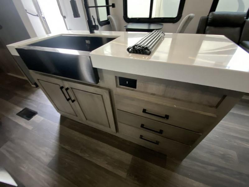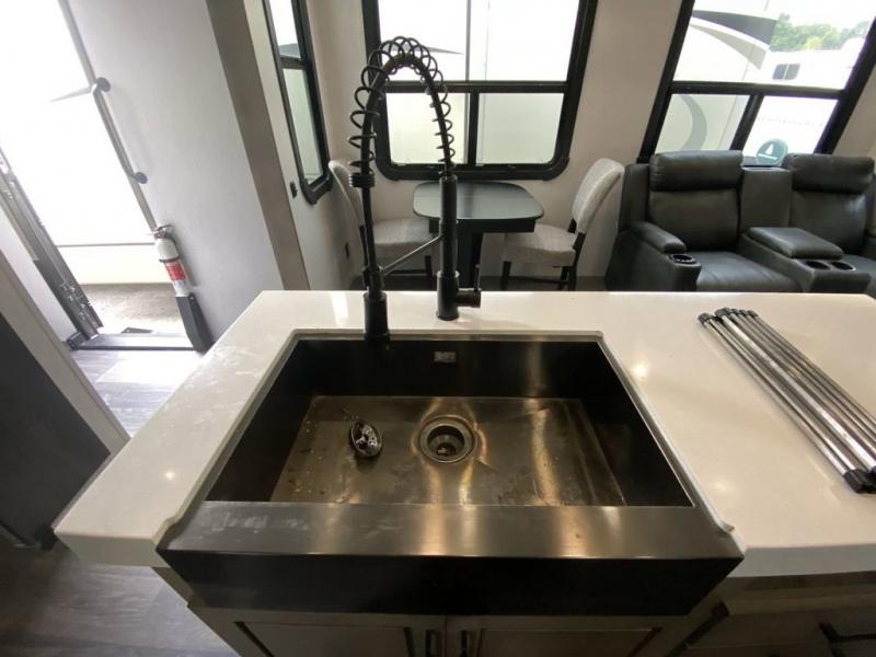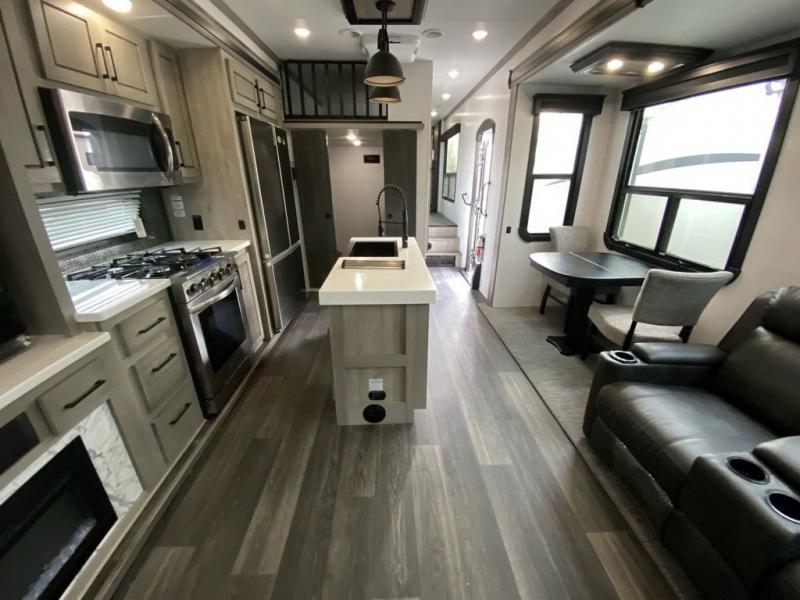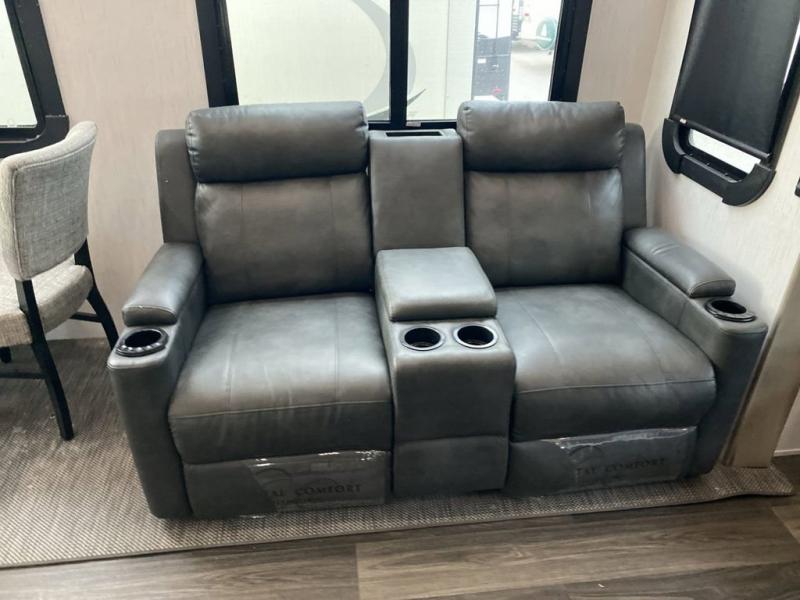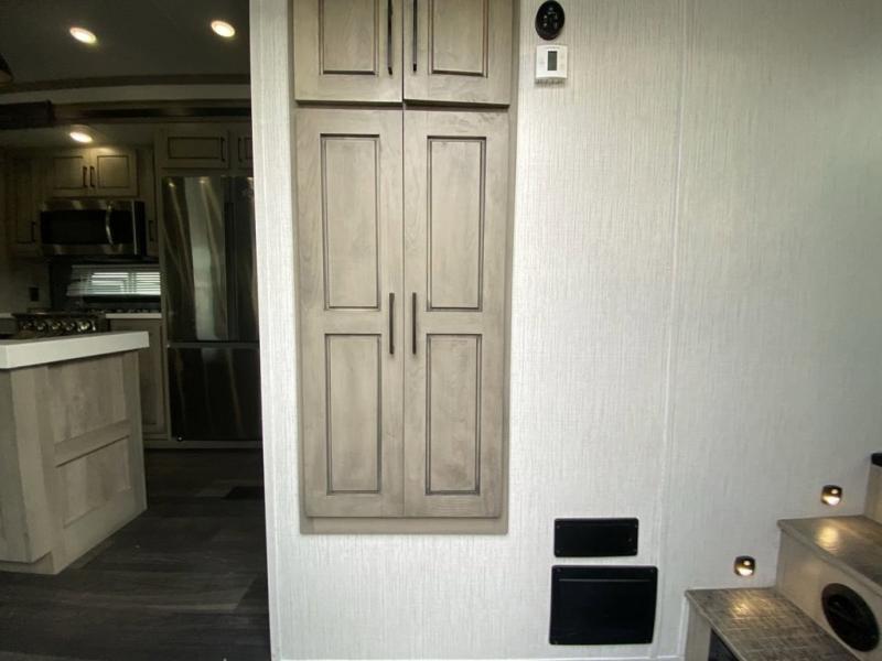 When you travel to see new places and sometimes have to work while away, this fifth wheel gives you a private office with a desk that can also be utilize as a second living area and bedroom thanks to the sofa slide and storage. There is a loft above for more sleeping space and storage that can be accessed using the ladder in the hallway. The double entry bathroom is convenient, and the front bedroom offers a king bed slide, lots of clothing storage, plus a space prepped for a washer/dryer option. The main living and kitchen area is spacious as well with dual slides, and you can relax on the tri-fold sleeper sofa or in the theater seats with heat and massage. There is also a 55" big screen TV and a built-in 40" electric fireplace to add more coziness. The cook will love the stainless steel appliances, the farm style sink, the full-size pantry and being able to dine at the free-standing dinette.