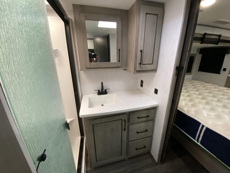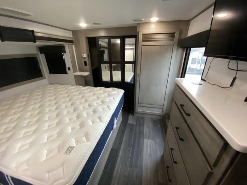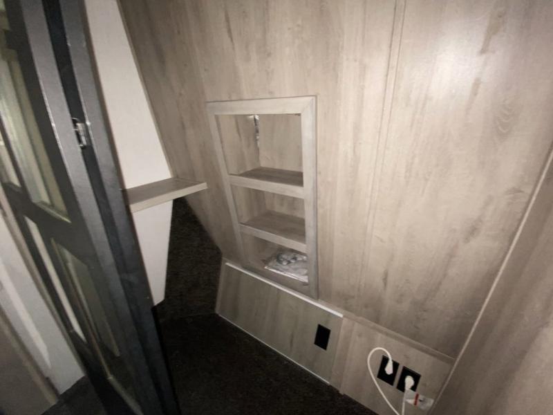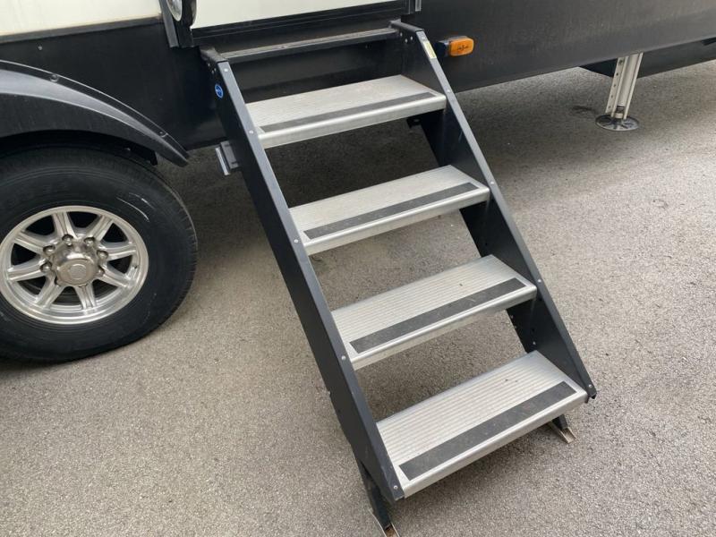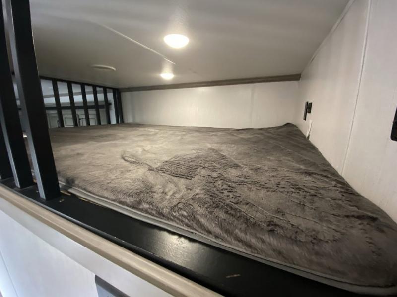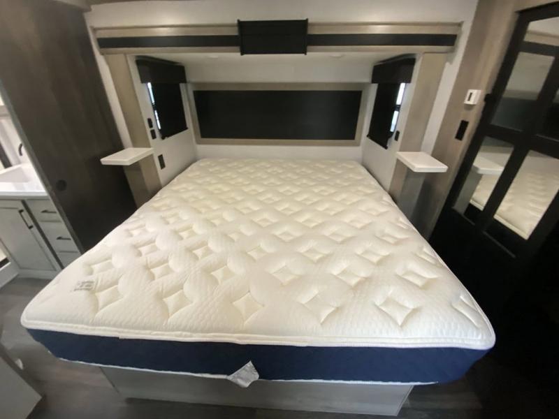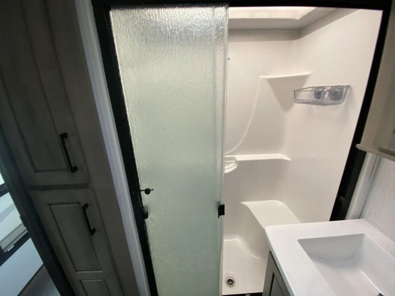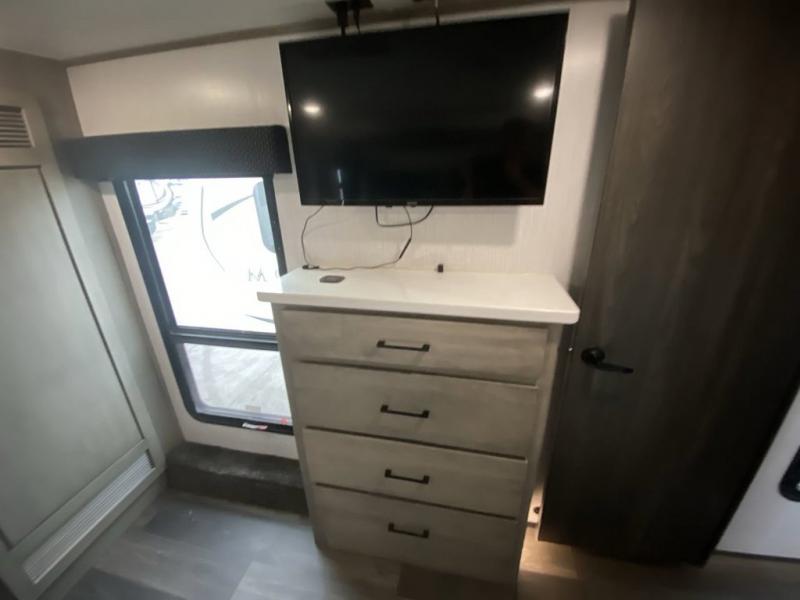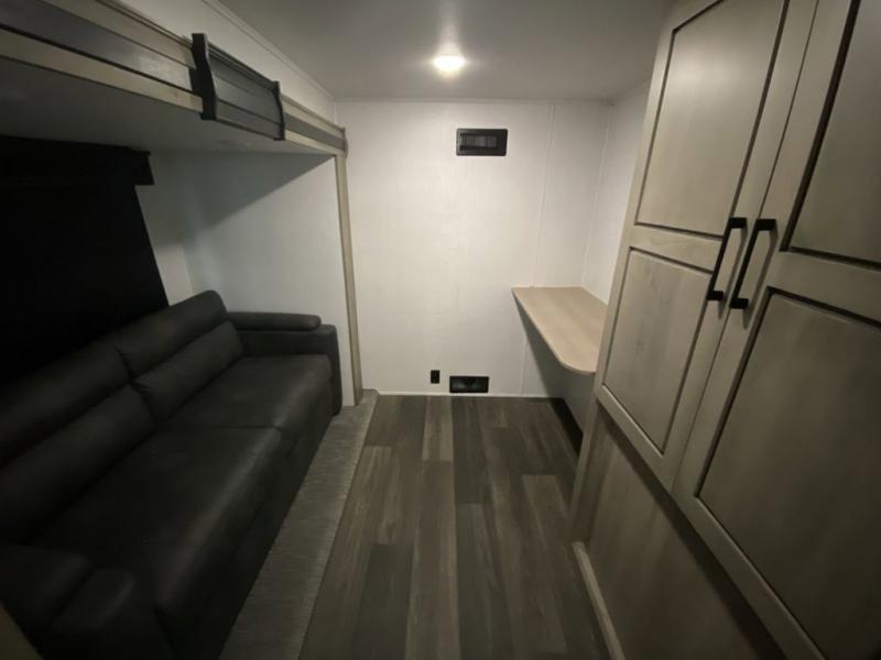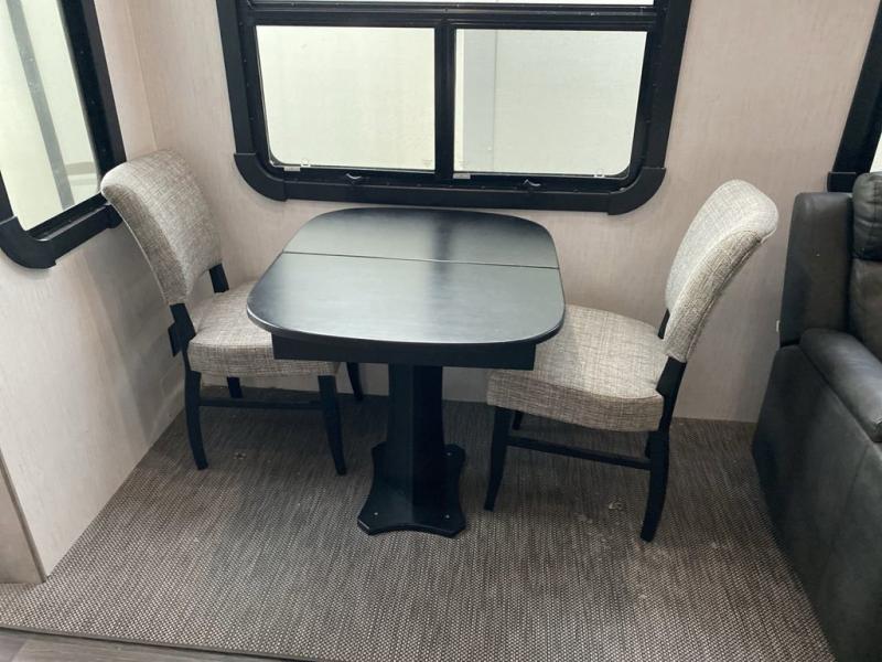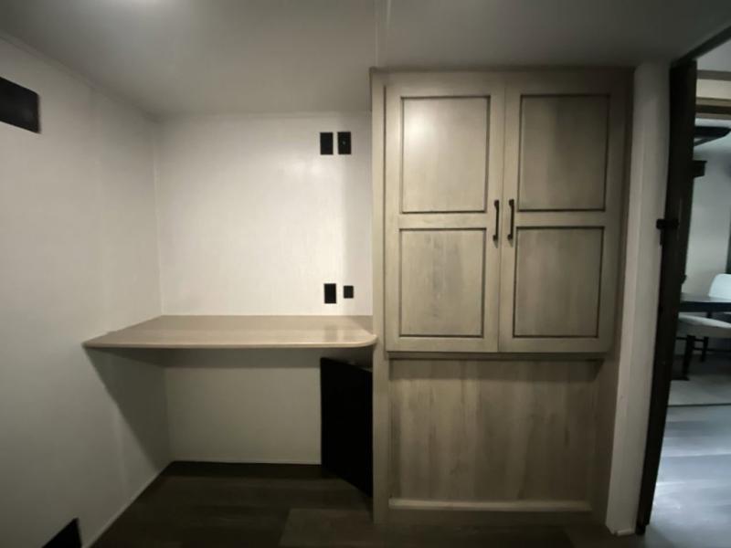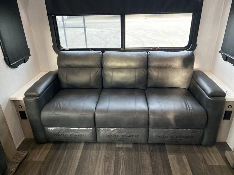 When you travel to see new places and sometimes have to work while away, this fifth wheel gives you a private office with a desk that can also be utilize as a second living area and bedroom thanks to the sofa slide and storage. There is a loft above for more sleeping space and storage that can be accessed using the ladder in the hallway. The double entry bathroom is convenient, and the front bedroom offers a king bed slide, lots of clothing storage, plus a space prepped for a washer/dryer option. The main living and kitchen area is spacious as well with dual slides, and you can relax on the tri-fold sleeper sofa or in the theater seats with heat and massage. There is also a 55" big screen TV and a built-in 40" electric fireplace to add more coziness. The cook will love the stainless steel appliances, the farm style sink, the full-size pantry and being able to dine at the free-standing dinette.