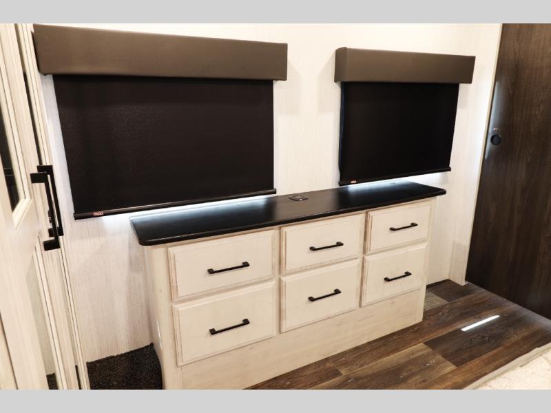 Bedroom Retreat: Front king bed (72×80), under-bed storage, dual LED reading lights, TV prep, and blackout shades.
