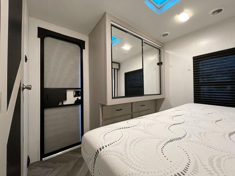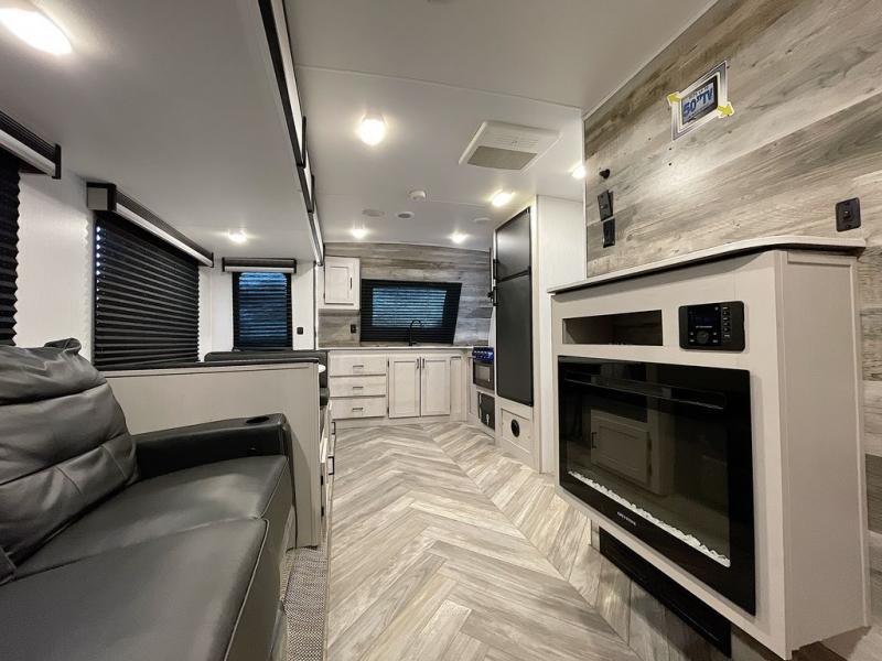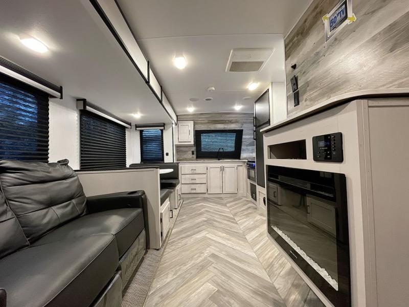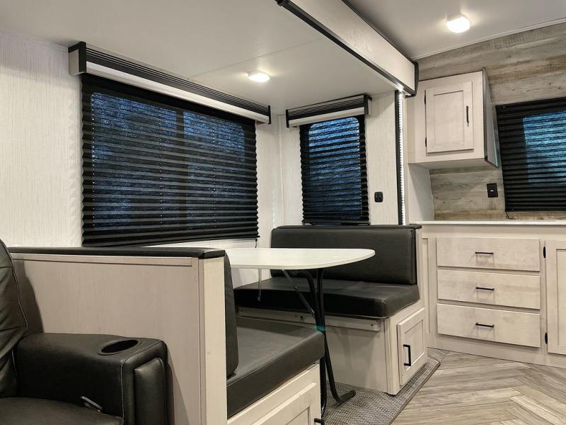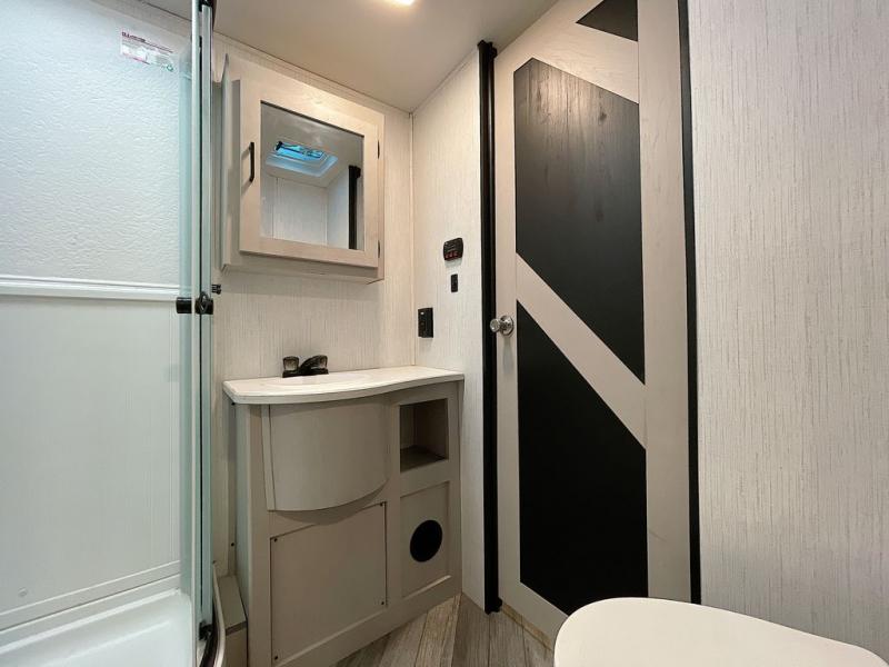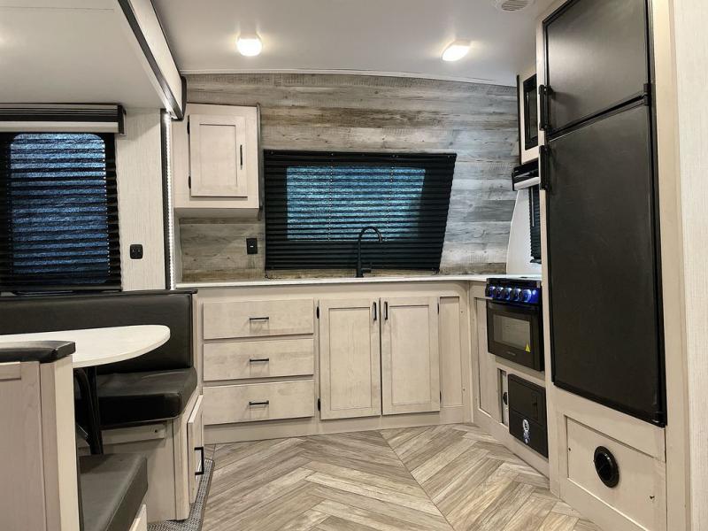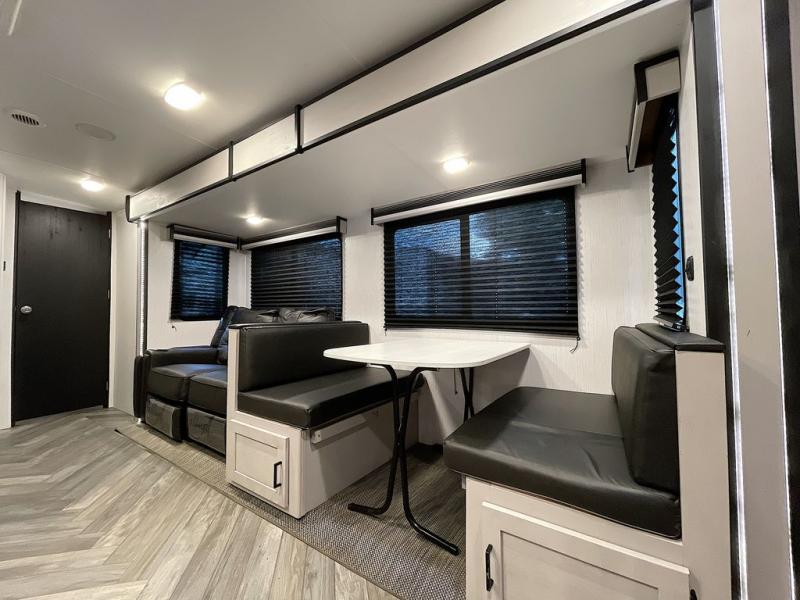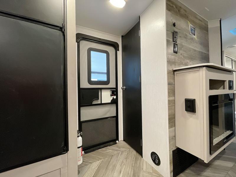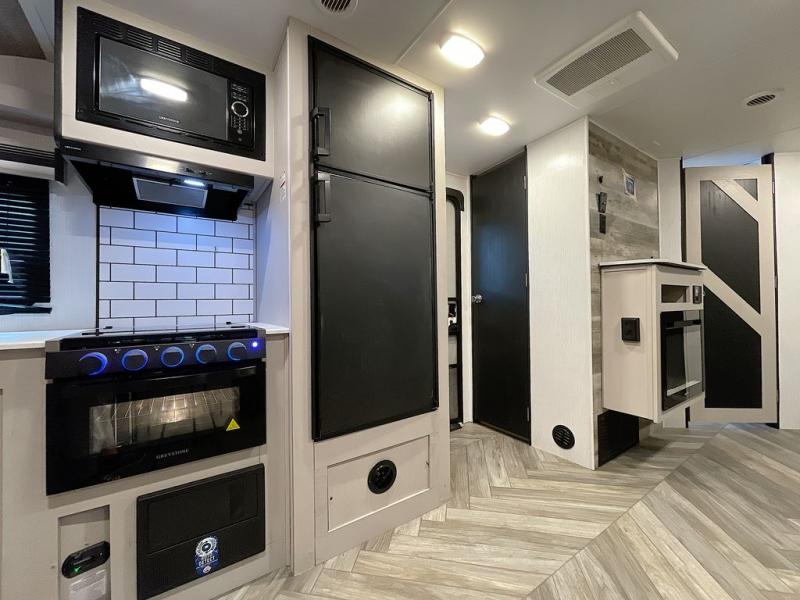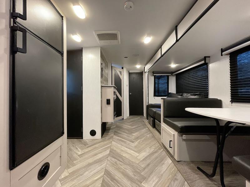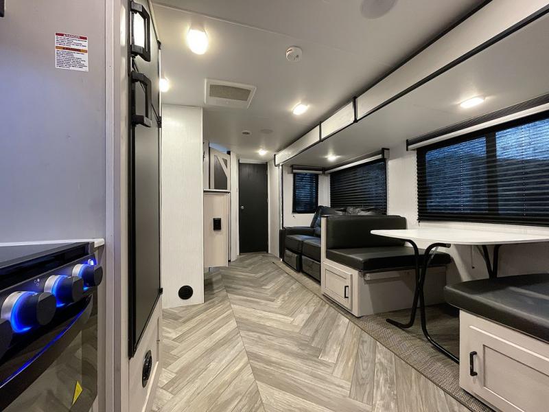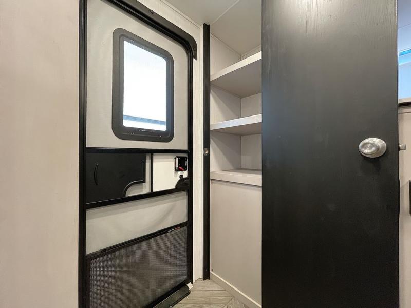 Dual entry doors in this travel trailer will allow you to enter in through the main living area/kitchen, or the rear master bedroom. You will love having a king bed to rest on each night, a wardrobe and closet to store your clothes, and a dual entry bath. After you've spent the day outdoors hiking or biking, plan to spend your evening relaxing on the sofa or playing a game at the booth dinette. The front kitchen includes plenty of counter space, two pantries, plus a three burner cooktop to cook meals on.