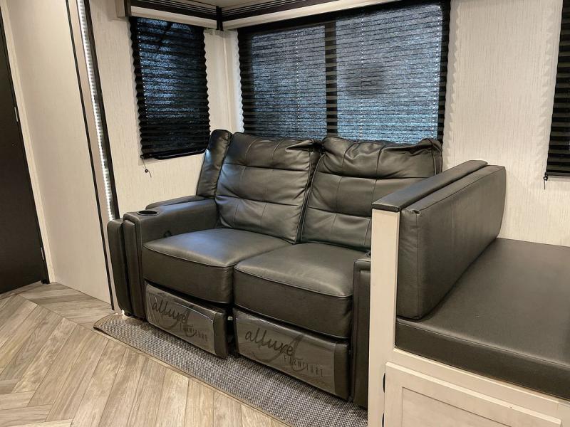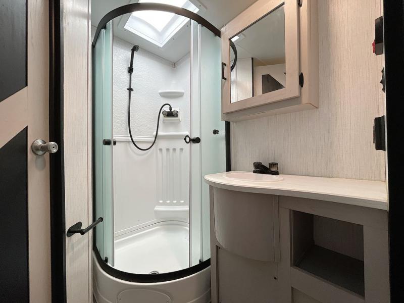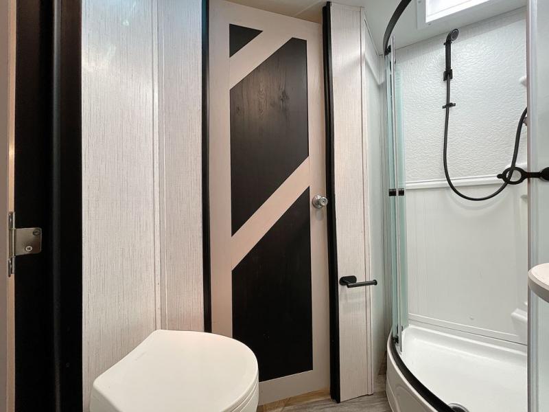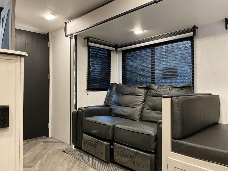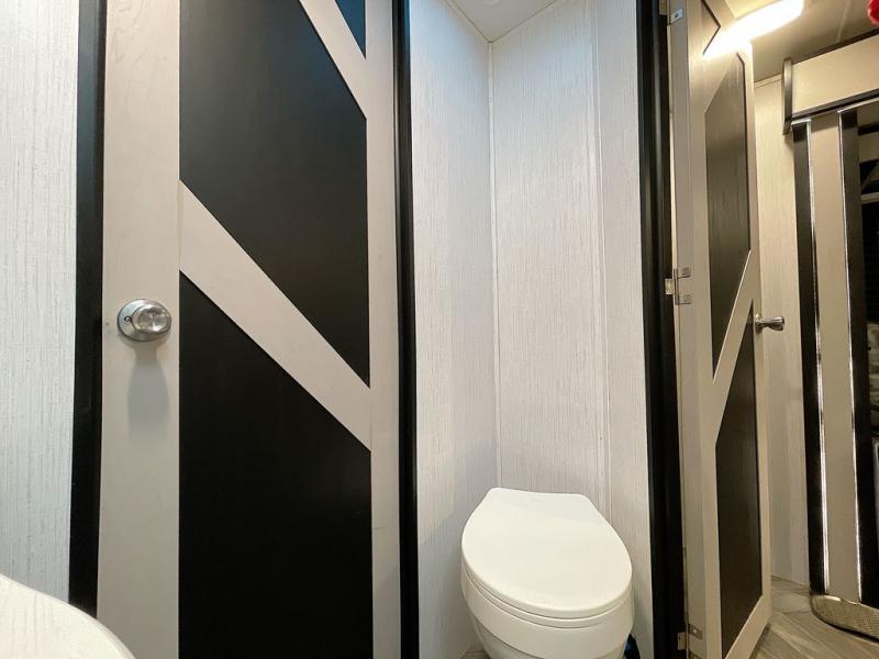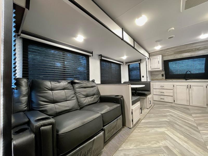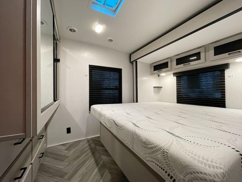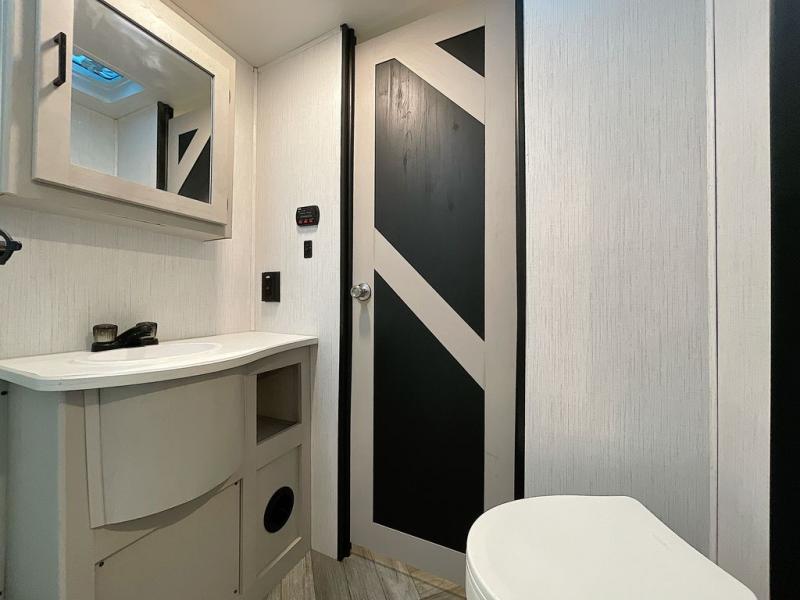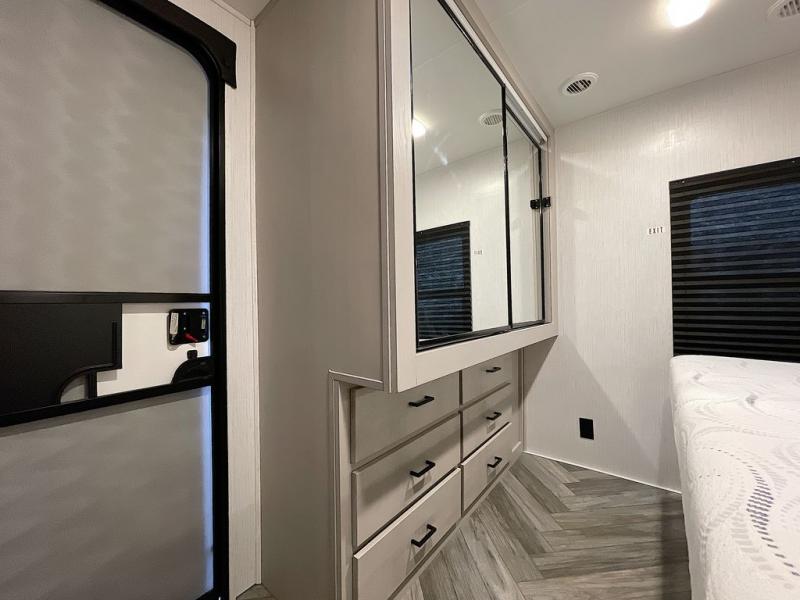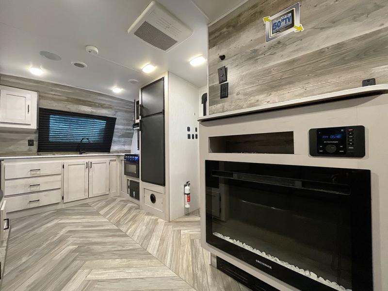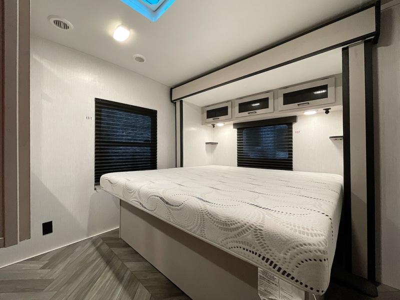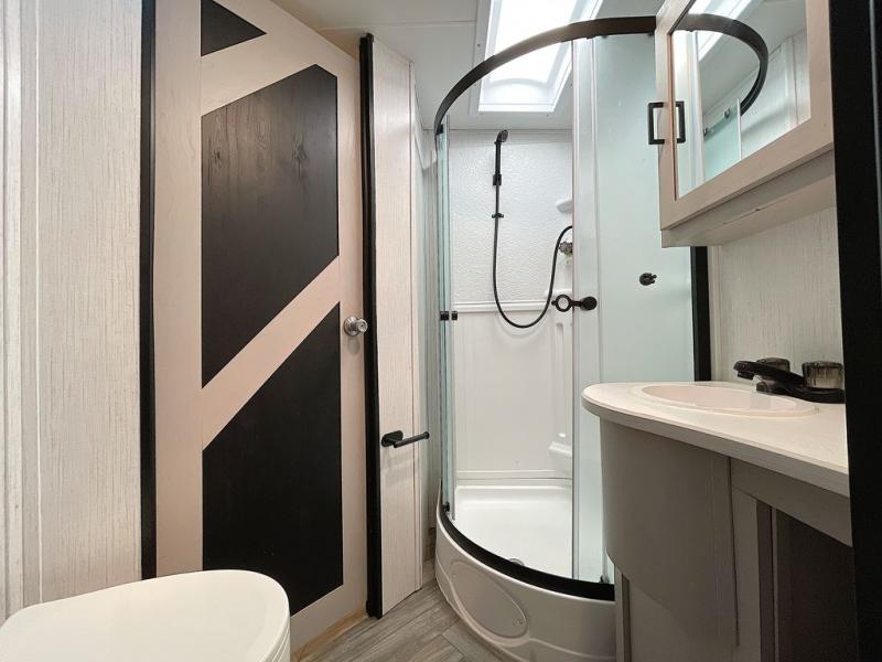 Dual entry doors in this travel trailer will allow you to enter in through the main living area/kitchen, or the rear master bedroom. You will love having a king bed to rest on each night, a wardrobe and closet to store your clothes, and a dual entry bath. After you've spent the day outdoors hiking or biking, plan to spend your evening relaxing on the sofa or playing a game at the booth dinette. The front kitchen includes plenty of counter space, two pantries, plus a three burner cooktop to cook meals on.