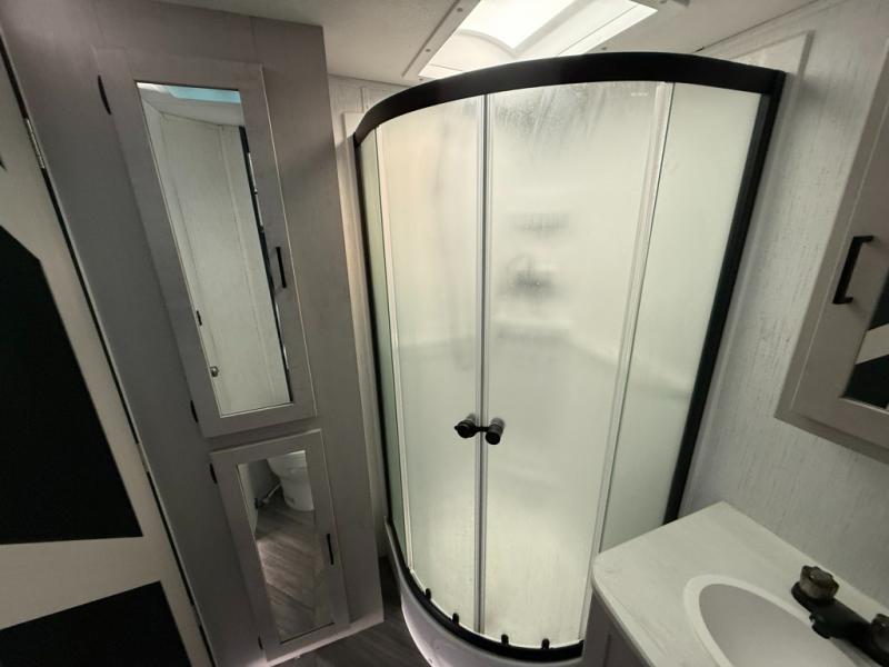 You will not be able to get enough of this Mallard travel trailer! It features a kitchen island to help make your meal prep and clean-up easier and a rear living area with everything you will need for a relaxing time like a sofa, theater seating with cupholders, and an entertainment center. Plus, there is a free-standing table with chairs next to the theater seating for you to play a card game at while you wait for dinner to be ready. You will also enjoy all of the conveniences that the front private bedroom has to offer, like the entrance into the double-entry bath, the king bed, and the large walk-in wardrobe with sliding glass doors so that you can see how well you've dressed each day! You will also find washer and dryer prep here too if plan to go full-time!