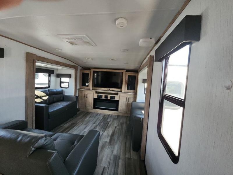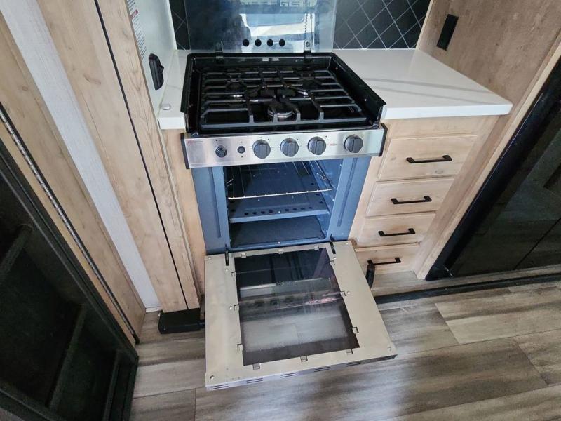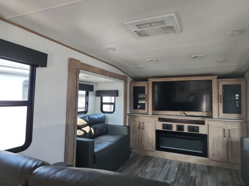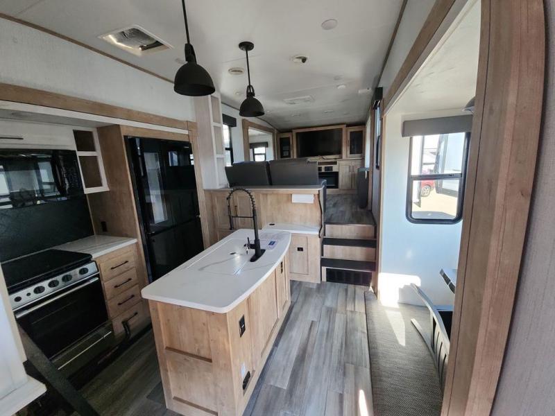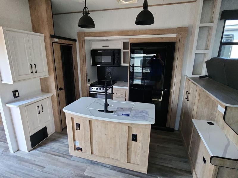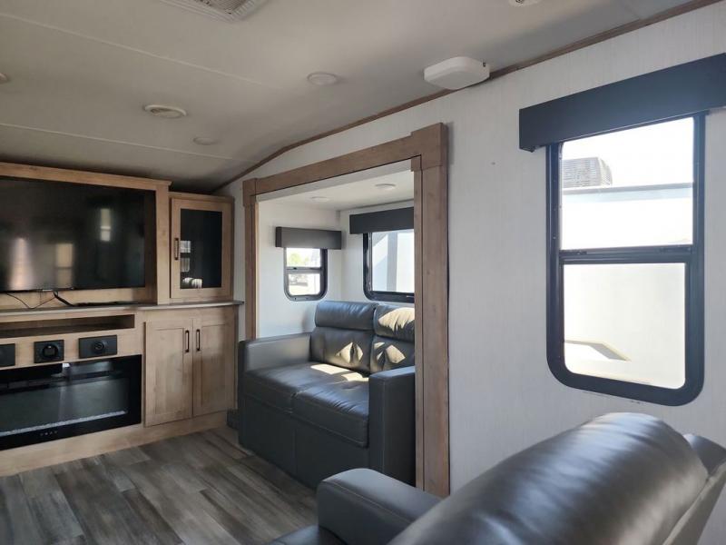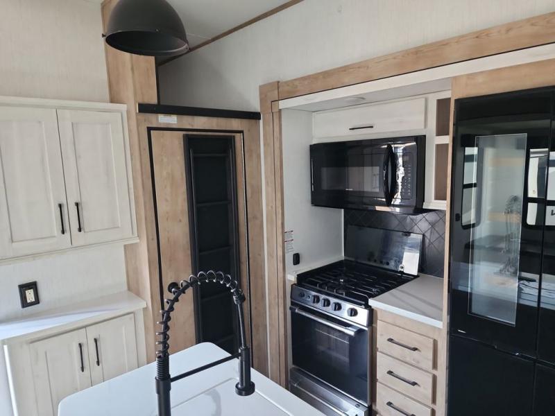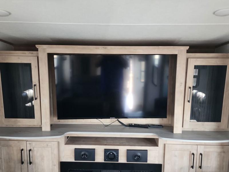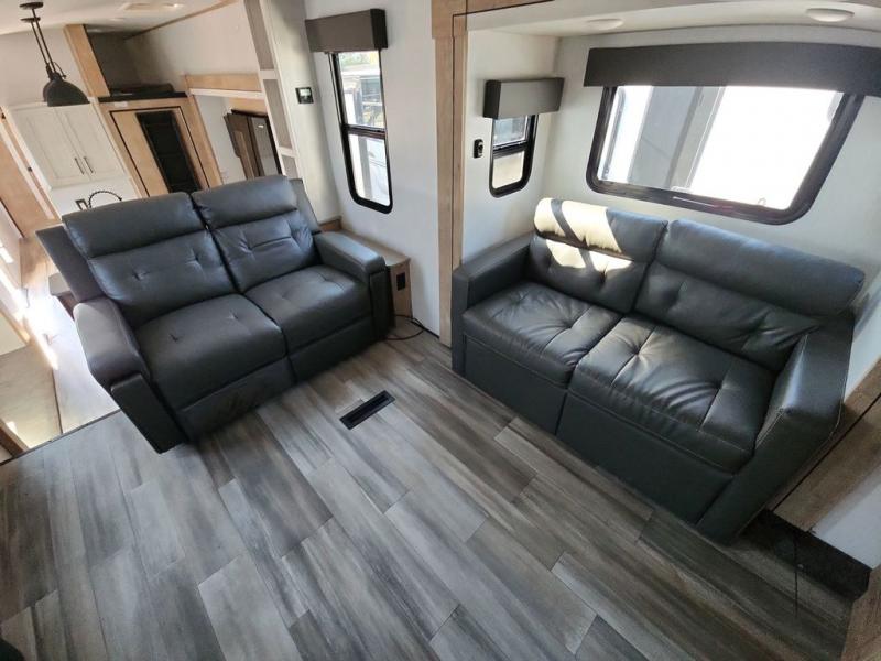 You'll be able to see the country in full luxury with this Milestone fifth wheel! There is a private bedroom in the back with a king-size bed where you can sleep comfortably each evening. The middle bunkhouse offers a comfortable sleeping area for two other tired travelers, and there is even a loft above the bunkhouse too. The separate living room replicates your living room back at home with its opposing sofas, theater seating, and Smart TV with a JBL sound system. You'll be very happy to find a fully functional kitchen that offers all of the essentials, like a three-burner cooktop, 21" large RV oven, 30" over-the-range microwave, and 10.7-cubic foot refrigerator.