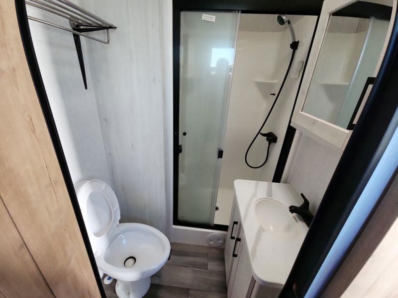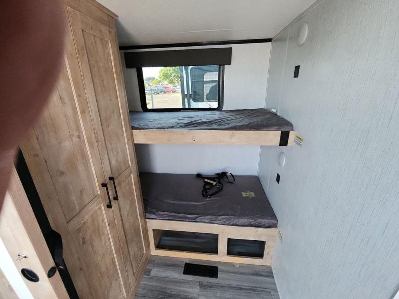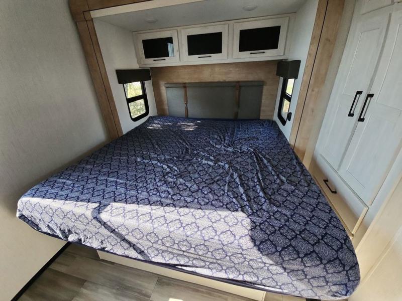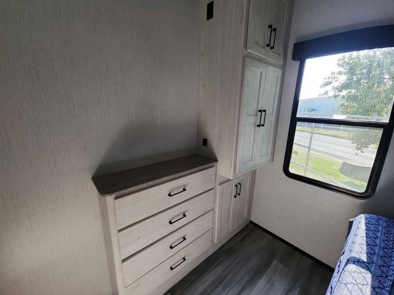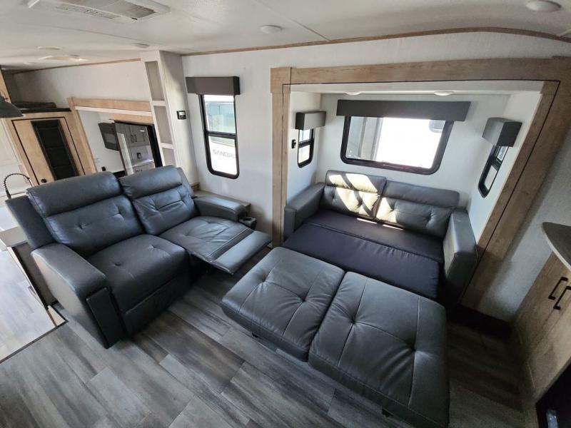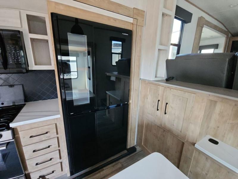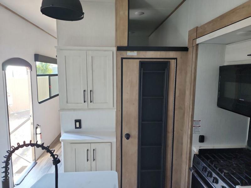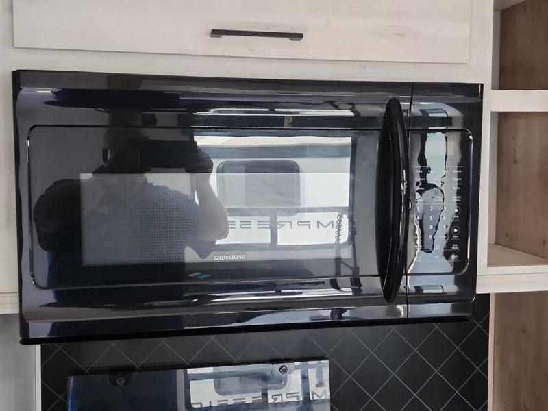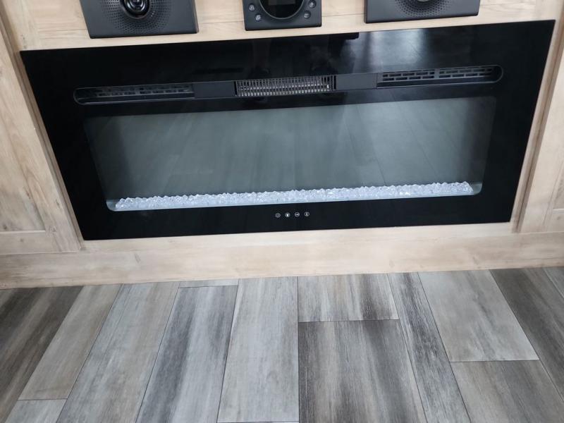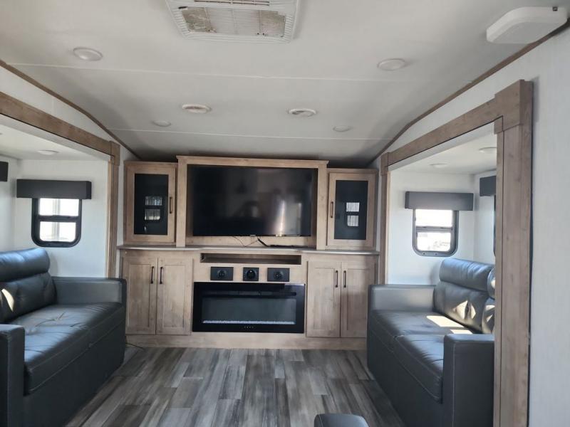 You'll be able to see the country in full luxury with this Milestone fifth wheel! There is a private bedroom in the back with a king-size bed where you can sleep comfortably each evening. The middle bunkhouse offers a comfortable sleeping area for two other tired travelers, and there is even a loft above the bunkhouse too. The separate living room replicates your living room back at home with its opposing sofas, theater seating, and Smart TV with a JBL sound system. You'll be very happy to find a fully functional kitchen that offers all of the essentials, like a three-burner cooktop, 21" large RV oven, 30" over-the-range microwave, and 10.7-cubic foot refrigerator.