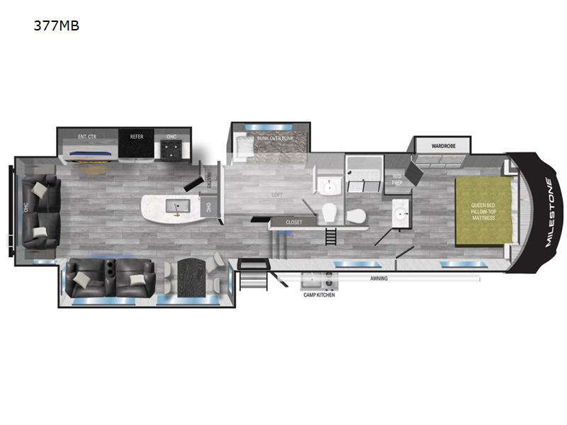 The Heartland Milestone is a full-profile luxury fifth wheel that is ready to help you make the most of your adventures! You will find an anti-chucking Rota-flex 2" receiver hitch to help you tow like a pro, and the Sol-380 with two 190 watt solar panels will let you go off-grid when the adventure calls for it. The upgraded MORryde solid step with quick-adjust system will help you enter your unit with ease, and auto-leveling comes standard to help you keep your unit secure while camping. The interior kitchen has some great features, like anti-microbial solid-surface countertops and a refrigerator with a wine cooler, and there is Wi-Fi prep with wireless charging ports throughout each unit.