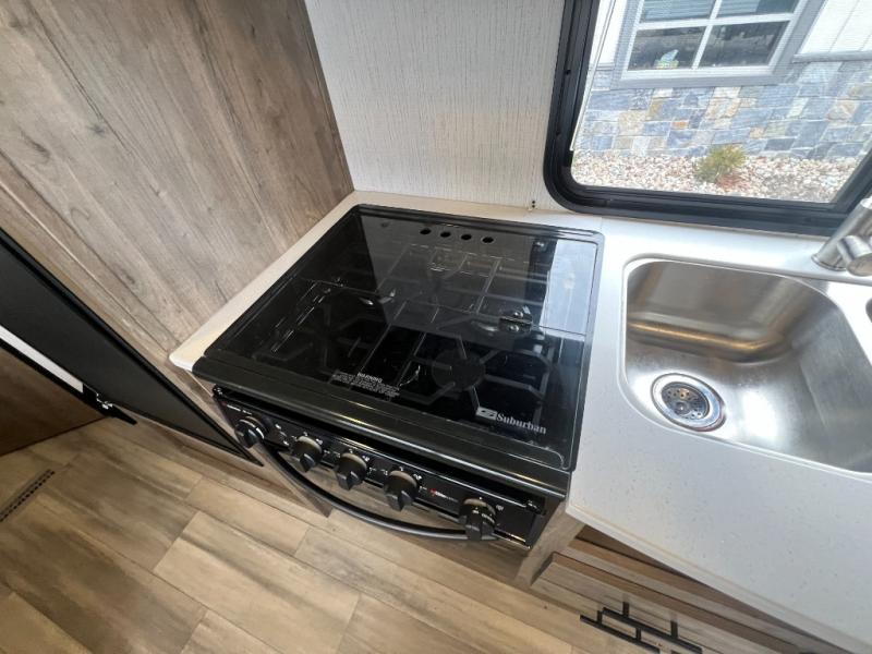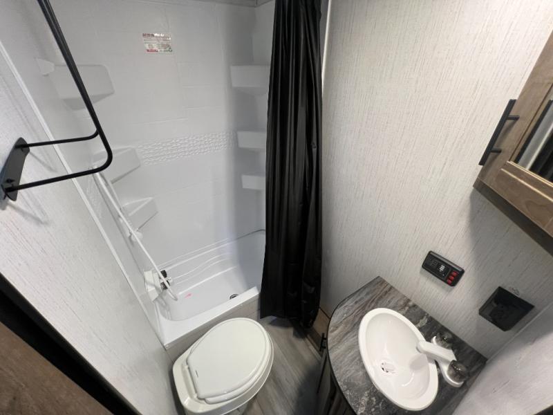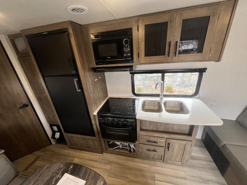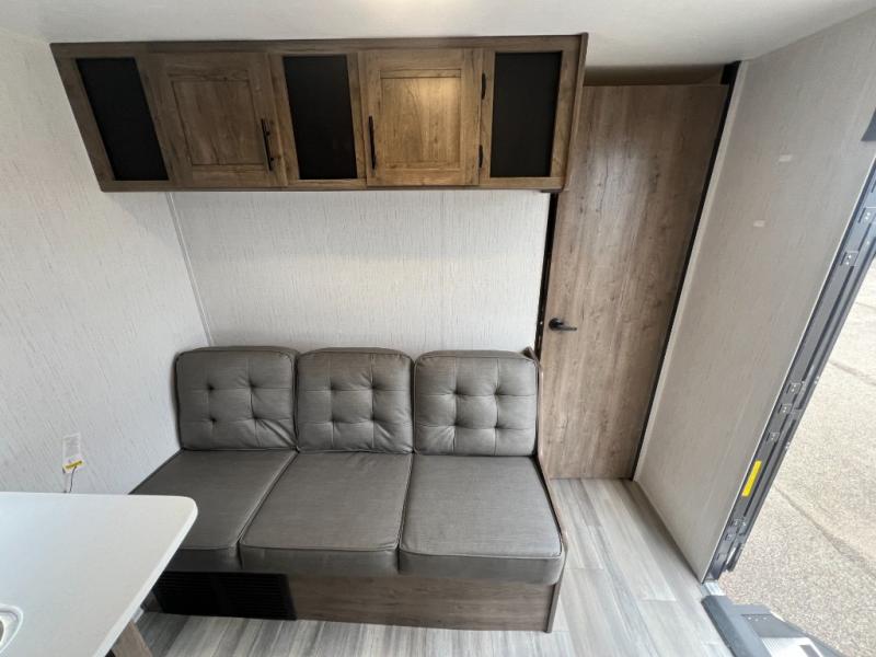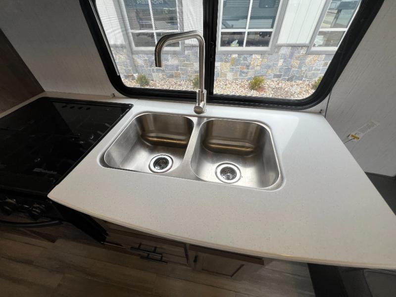 This Pioneer allows the kids their own space on the double-size bunks while you have your own space in the front private bedroom with a queen bed and storage. There is seating in the main living and kitchen area on the sofa and booth dinette, plus both of these furnishings provide sleeping space when needed. The cook will have a three-burner cooktop and a microwave to make warm meals, and an 8 cu. ft. refrigerator to store lots of cold food and drinks. You will find overhead cabinets and more storage throughout for your games, snacks, and such, plus there is a full bathroom to keep everyone clean.