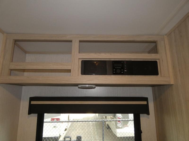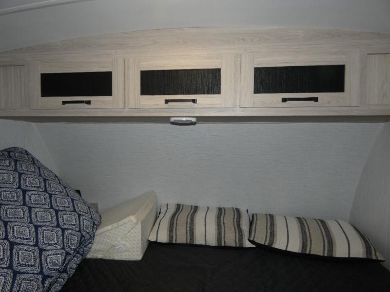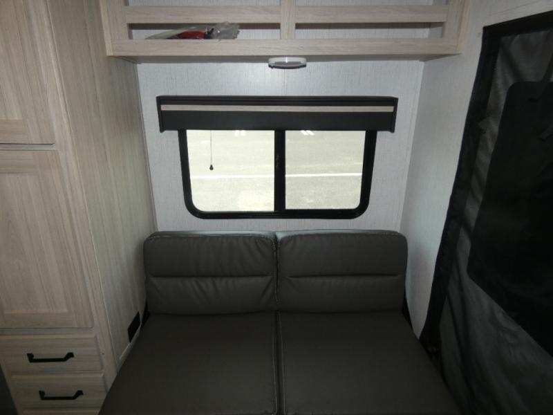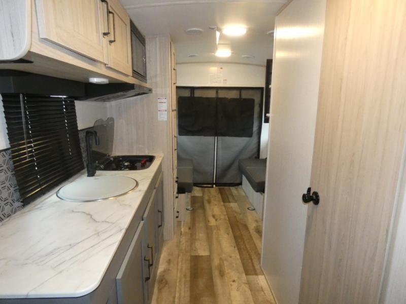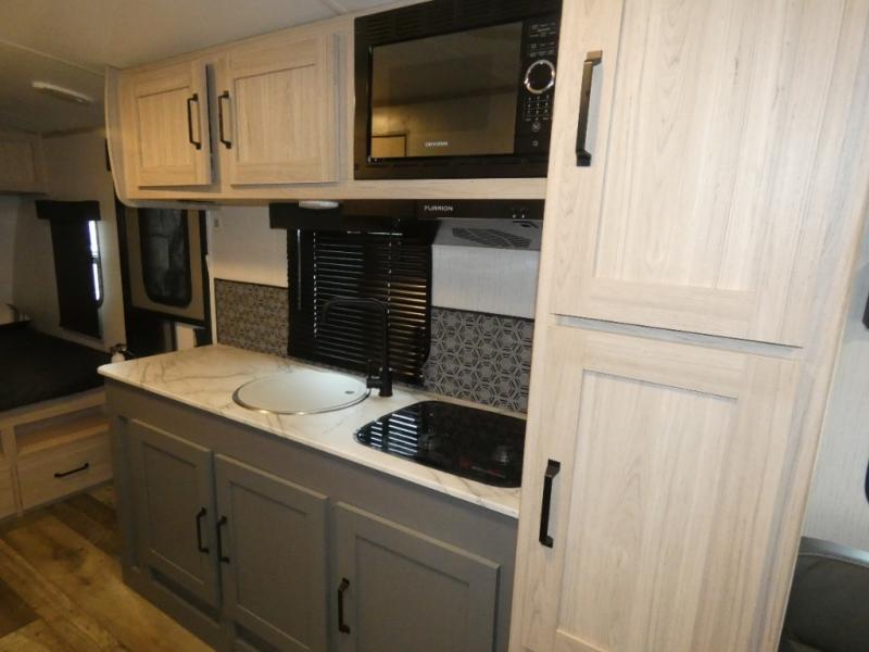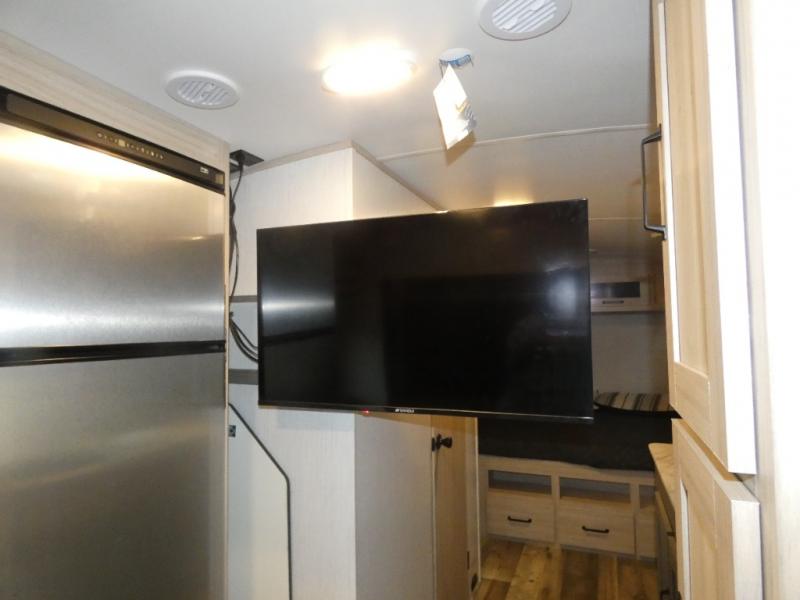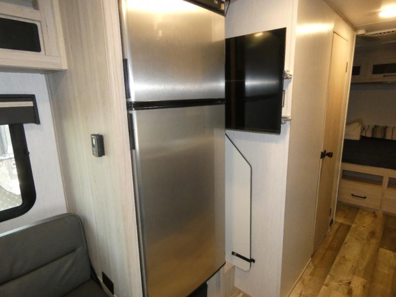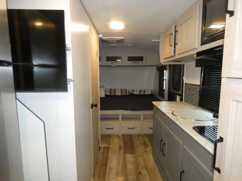 Weekends at the lake just got sweeter with this travel trailer in tow! You will love the flip-up back hatch baggage door that opens fully so you can easily load luggage, bikes, and kayaks. The free-standing dinette table provides more space for these items, and if you have guests they can sleep on the dinette seats once they're folded down. This model includes a two burner range in the kitchen, along with a 12V residential refrigerator, plus a slide out TV that rotates all the way around for better viewing. When you're ready to settle down for the night, the full bath will allow you to clean up, and the queen bed up front is sure to bring a great night's rest. There is even a bedroom closet to keep your clothes tidy!