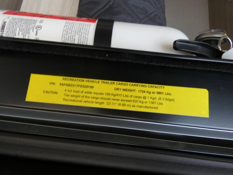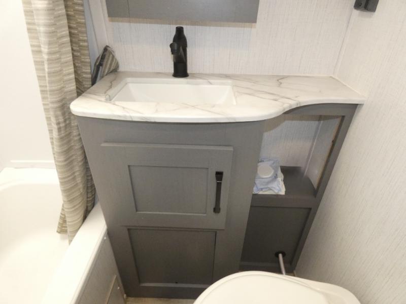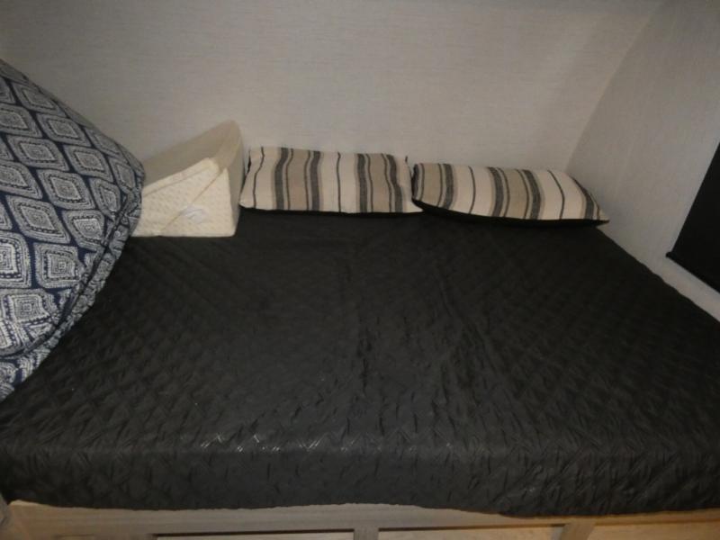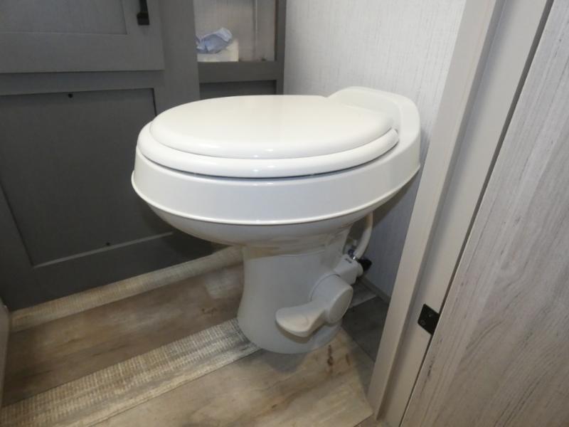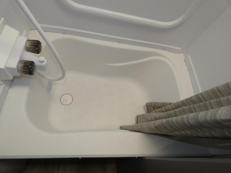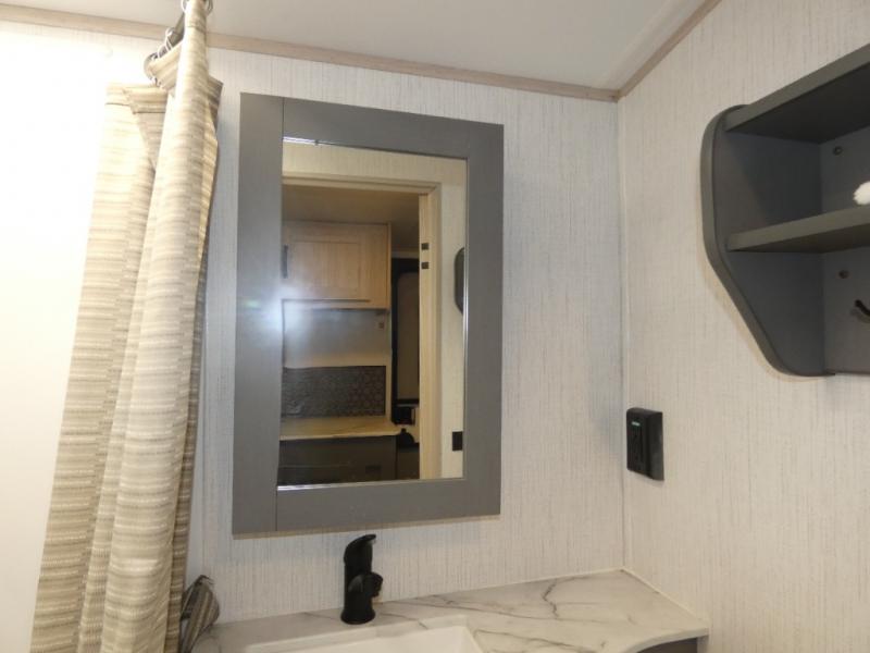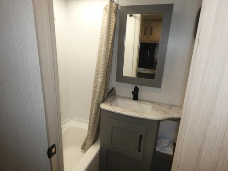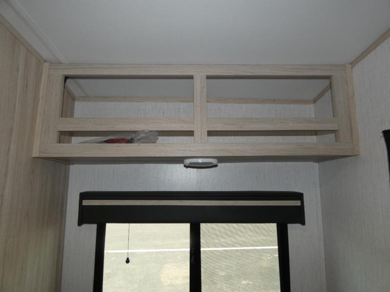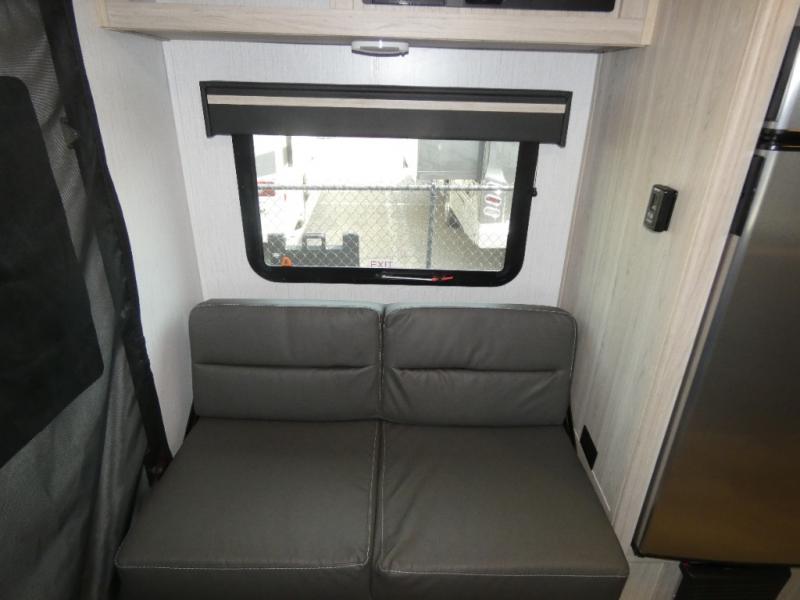 Weekends at the lake just got sweeter with this travel trailer in tow! You will love the flip-up back hatch baggage door that opens fully so you can easily load luggage, bikes, and kayaks. The free-standing dinette table provides more space for these items, and if you have guests they can sleep on the dinette seats once they're folded down. This model includes a two burner range in the kitchen, along with a 12V residential refrigerator, plus a slide out TV that rotates all the way around for better viewing. When you're ready to settle down for the night, the full bath will allow you to clean up, and the queen bed up front is sure to bring a great night's rest. There is even a bedroom closet to keep your clothes tidy!
