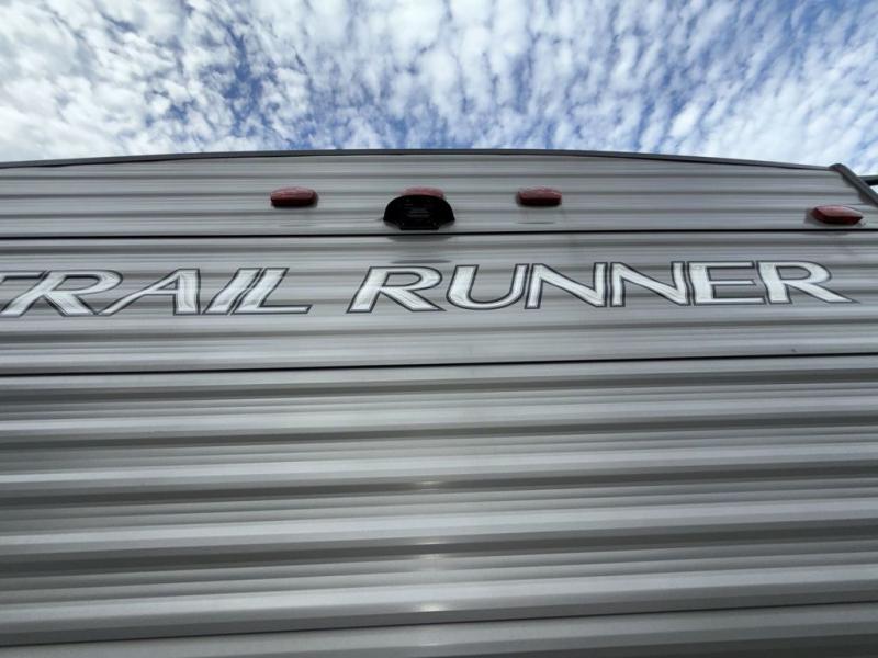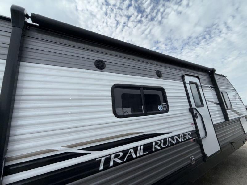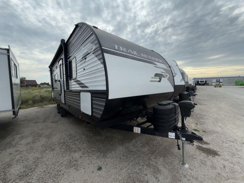 Paradise awaits at the end of the trail with one of these Heartland Trail Runner travel trailers! Experience better wind and water deflection, added strength, and a reduction of tongue weight with the hybrid aluminum front profile that has an aerodynamic radius front cage. A cambered structural steel I-beam frame holds them together and a heated enclosed underbelly protects the units vitals. There is an industry leading mammoth storage space of 57 cu. ft. pass-through storage so you can bring all of your outdoor gear with you. Roller shades in the main living area, woven flooring in all slide rooms, master suites with CPAP storage, and upgraded pressed counters give you the at-home feel you desire. Come find the perfect model for you today!
