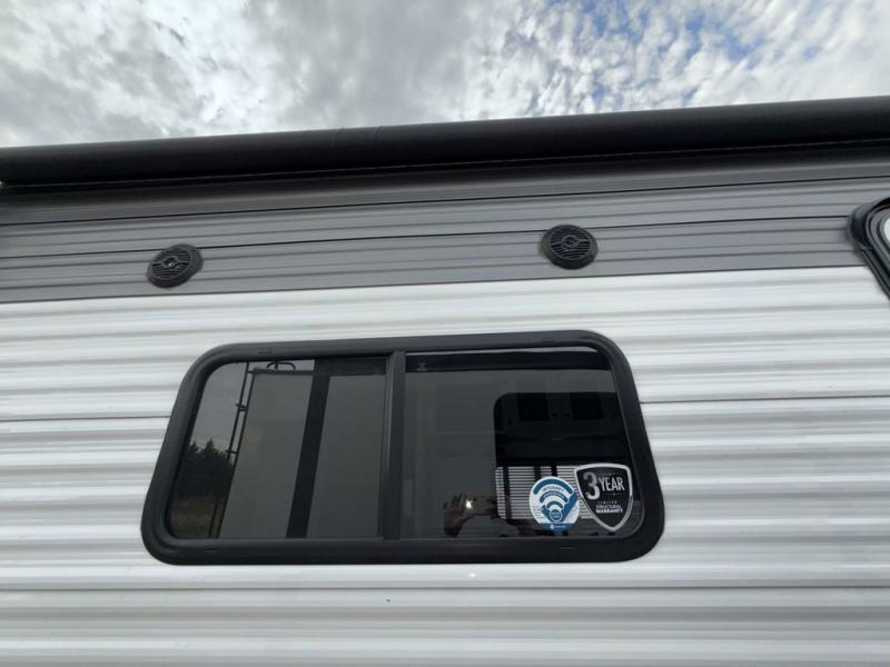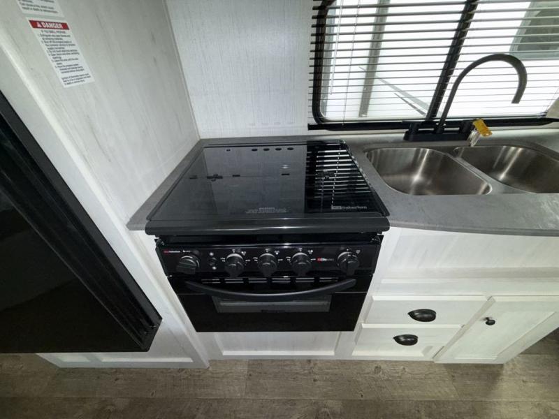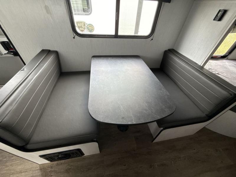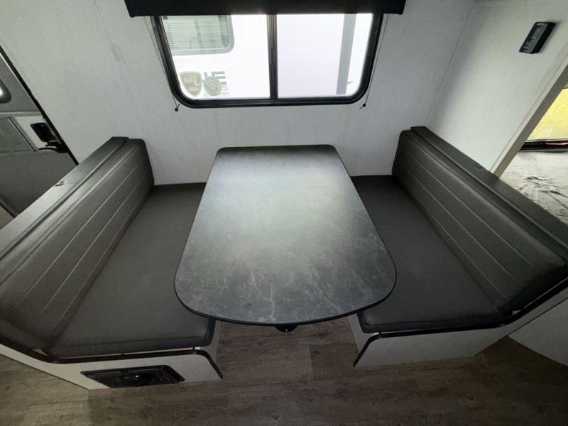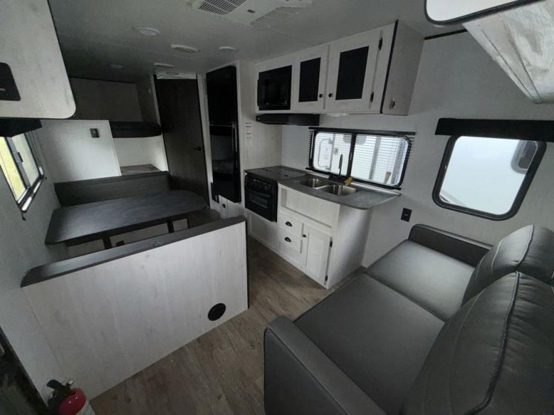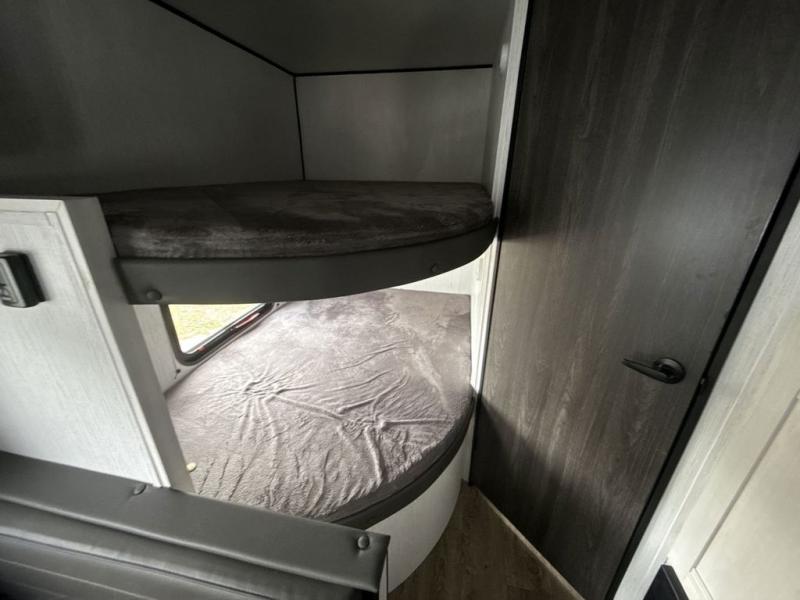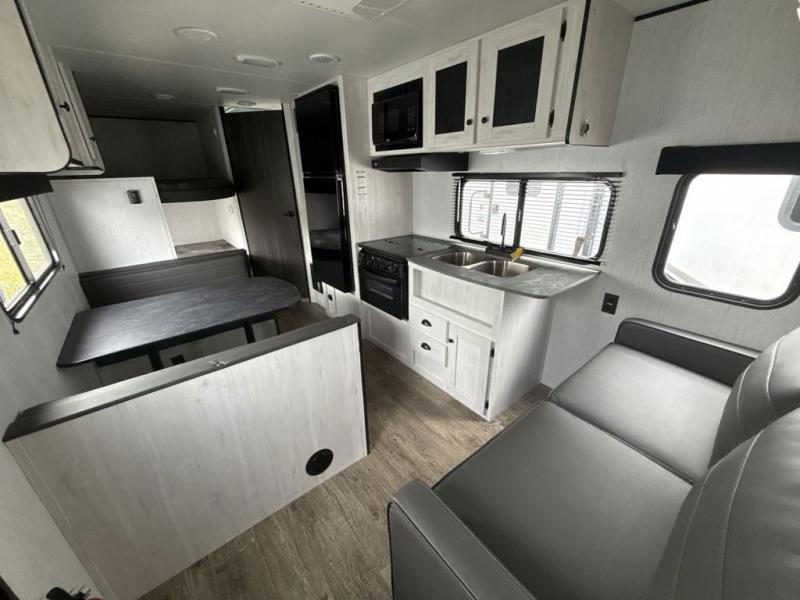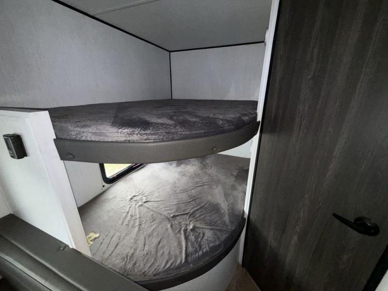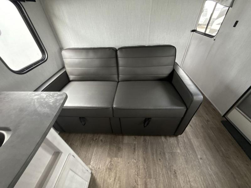 The whole family will love camping in this travel trailer! It has everything you need from a set of double bunk beds to a 14' power awning with LED light strip and outside shower. The front queen bed has under-bed storage to keep extra blankets or suitcases out of the way. After getting a good night's rest, head to the rear corner bathroom to freshen up in the ABS tub/shower surround with skylight above and then fry some eggs up on the three burner cooktop. You can enjoy your meals at the booth dinette and even convert it into an extra sleeping space, plus there is a sofa to take an afternoon nap!
