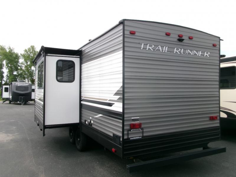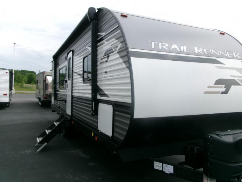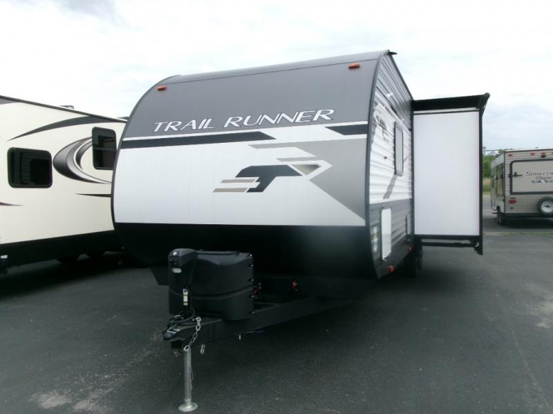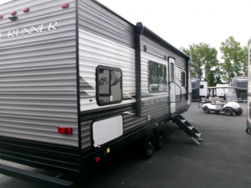 Paradise awaits at the end of the trail with one of these Heartland Trail Runner travel trailers! Experience better wind and water deflection, added strength, and a reduction of tongue weight with the hybrid aluminum front profile that has an aerodynamic radius front cage. A cambered structural steel I-beam frame holds them together and a heated enclosed underbelly protects the units vitals. There is an industry leading mammoth storage space of 57 cu. ft. pass-through storage so you can bring all of your outdoor gear with you. Roller shades in the main living area, woven flooring in all slide rooms, master suites with CPAP storage, and upgraded pressed counters give you the at-home feel you desire. Come find the perfect model for you today!