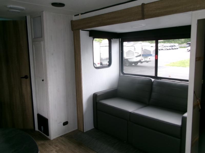 Enjoy family time at the campground with this travel trailer! The kiddos can sleep on the set of double bunk beds and you will have your own privacy with the front private bedroom which has a queen bed with under-bed storage and wireless cell charging stations for one less thing to bring with you. The chef can whip up their best meals with the three burner cooktop and everyone can enjoy them together at the booth dinette then play a card game or two. If you're not big into card games then you can relax on the sofa while you enjoy a cold drink stored in the 10 cu. ft. stainless steel refrigerator. Freshen up each day in the rear corner bathroom with the ABS tub/shower surround with a skylight above it!