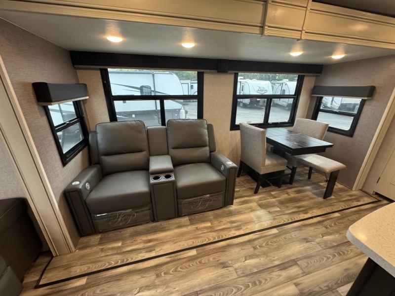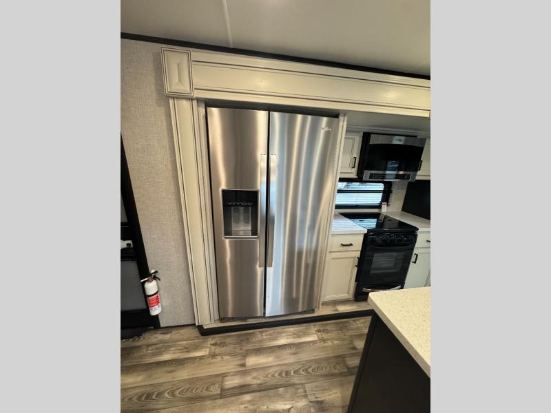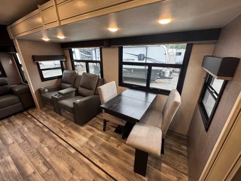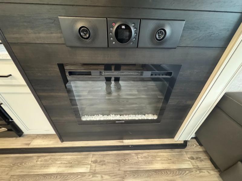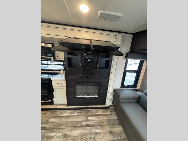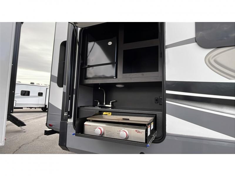 Living in this trailer is made easy with all the conveniences and comforts found throughout! So pick your destination, hitch up and head out! The private bedroom is up front and includes a mirrored wardrobe, a queen bed slide, or choose the king option, a dresser, a space prepped for a washer/dryer option plus access to the double entry full bath. The main living and kitchen area is spacious with dual opposing slides and offers the cook full amenities including a kitchen island and large pantry, plus you can dine at the booth dinette or choose a free standing table and chairs in its place. The theater seats and tri-fold sofa with adjustable headrests allow you to relax while watching the 39" LED HDTV with a fireplace below. And don't forget about the outside kitchen when making meals and the two power awnings providing protection from the elements.
