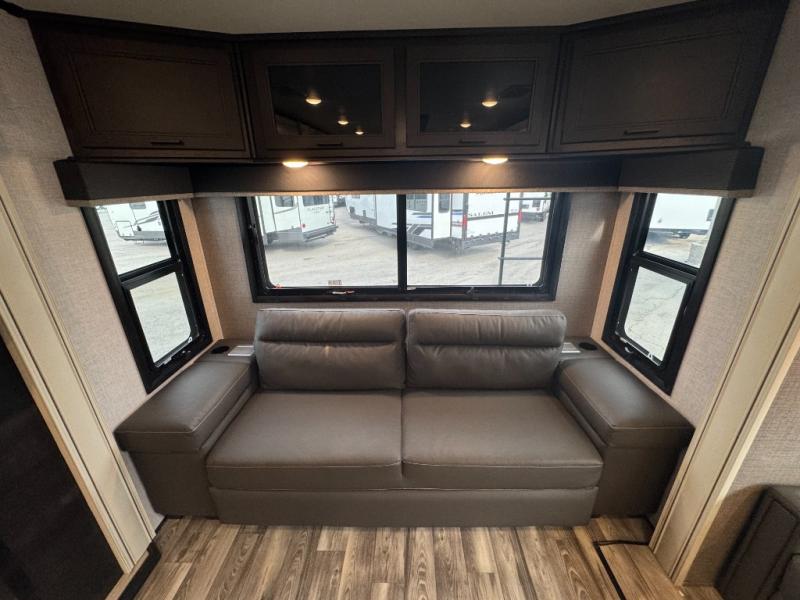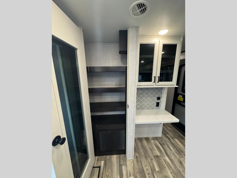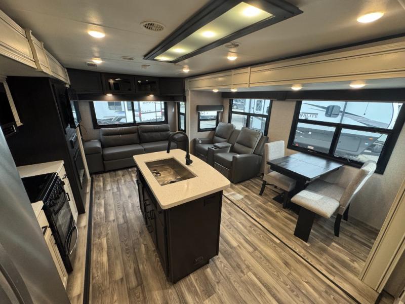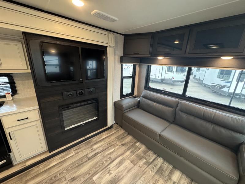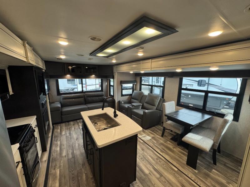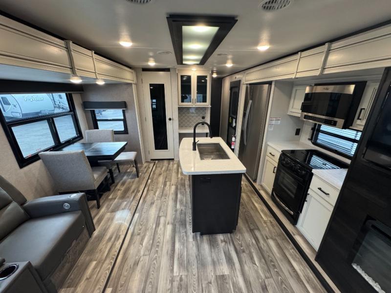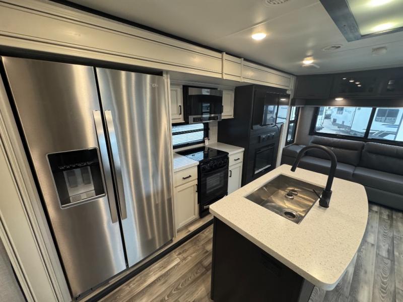 Living in this trailer is made easy with all the conveniences and comforts found throughout! So pick your destination, hitch up and head out! The private bedroom is up front and includes a mirrored wardrobe, a queen bed slide, or choose the king option, a dresser, a space prepped for a washer/dryer option plus access to the double entry full bath. The main living and kitchen area is spacious with dual opposing slides and offers the cook full amenities including a kitchen island and large pantry, plus you can dine at the booth dinette or choose a free standing table and chairs in its place. The theater seats and tri-fold sofa with adjustable headrests allow you to relax while watching the 39" LED HDTV with a fireplace below. And don't forget about the outside kitchen when making meals and the two power awnings providing protection from the elements.