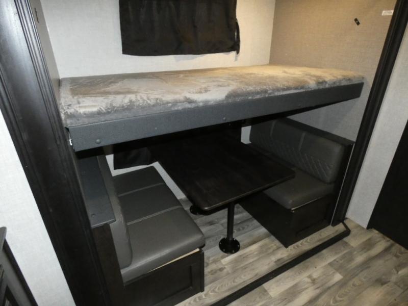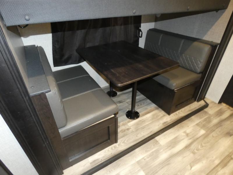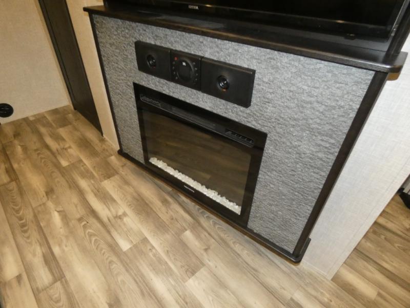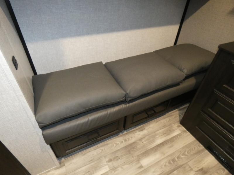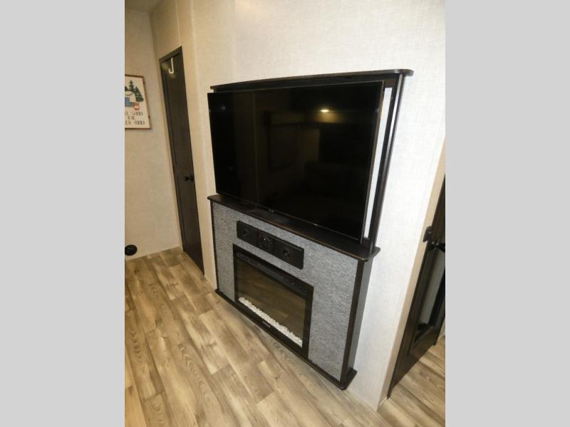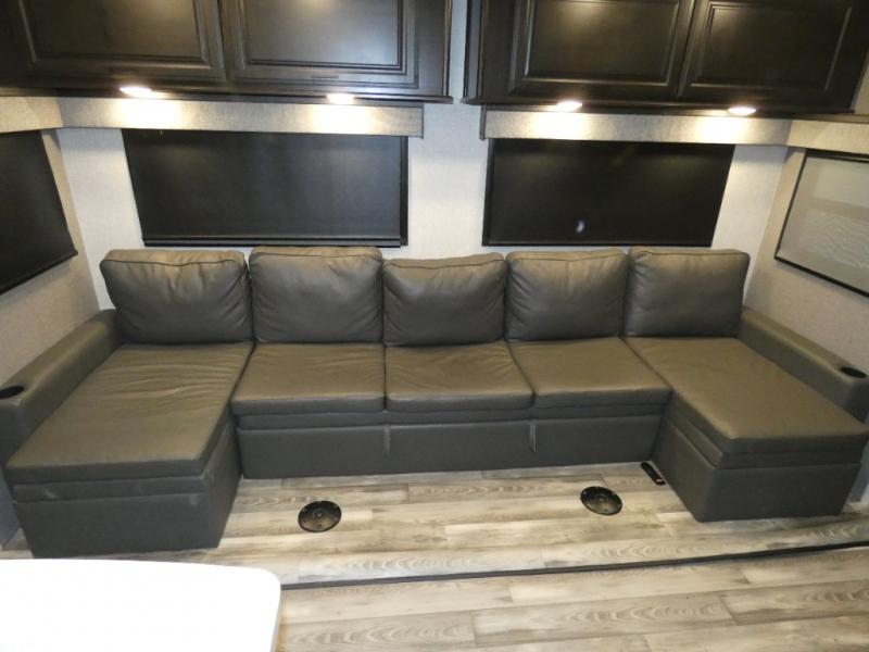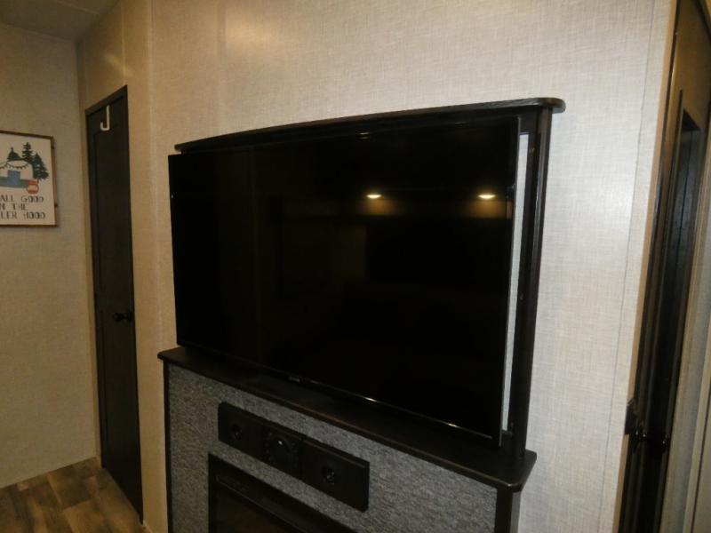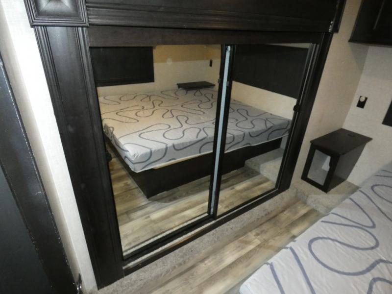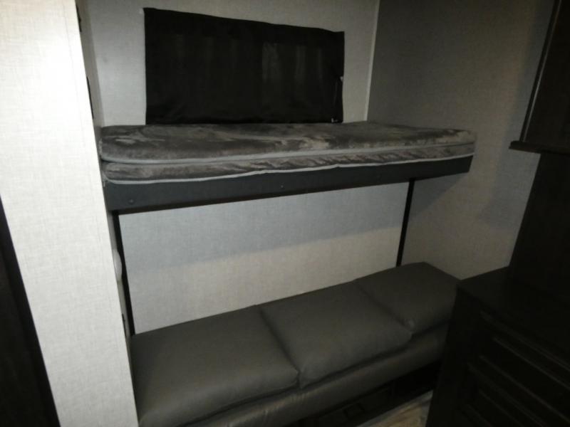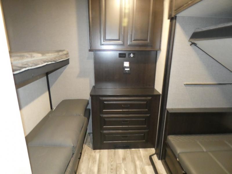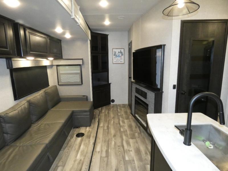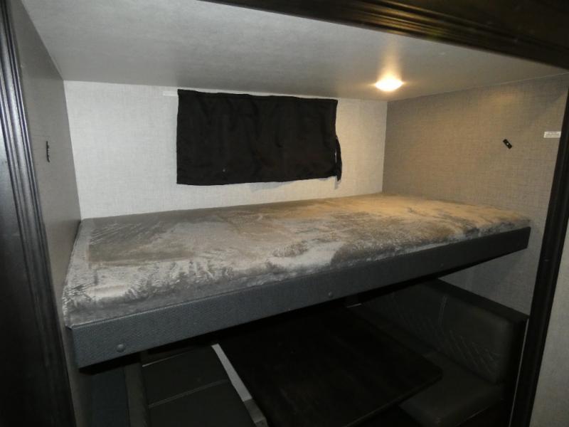 Whether you live in this fifth wheel full-time or enjoy long trips, you will have plenty of space to invite the grandkids or whomever you like to enjoy their own space in the rear bunkhouse. This room offers a dinette, bench seating and two bunk beds, plus a dresser and a half bath! The master suite is up front on the opposite side of the fifth wheel and includes a slide out mirrored wardrobe, a walk-around queen bed plus access to the full double entry bathroom. Everyone can gather in the main living and kitchen area to make meals with full amenities such as the residential convection microwave and four burner range, plus they can dine and play games at the U-Lounge with two tables and watch the 50" LED HDTV with a fireplace below. The cook can also use the outside kitchen while everyone relaxes under the two awnings.