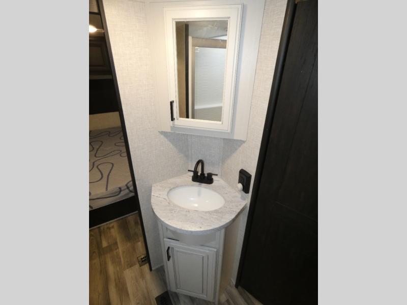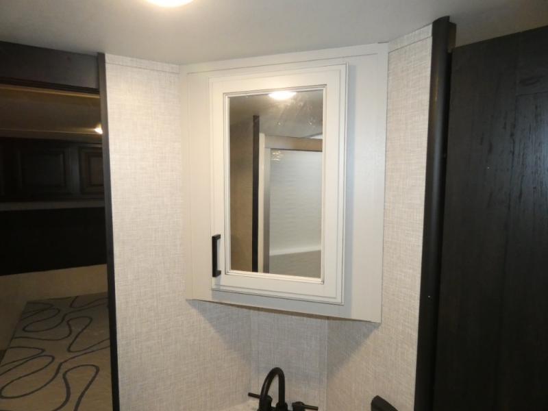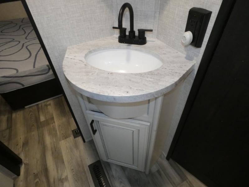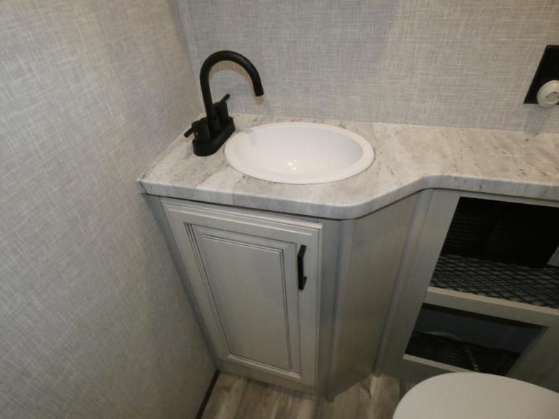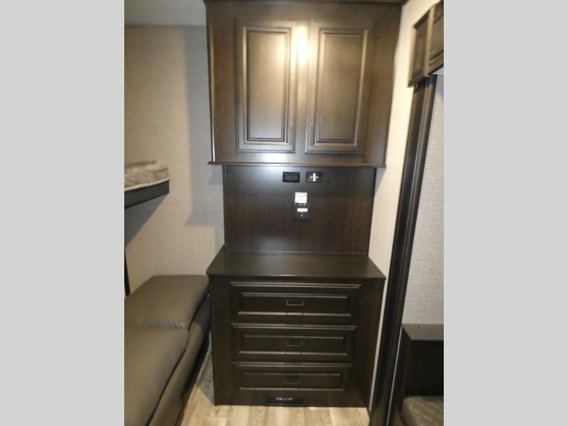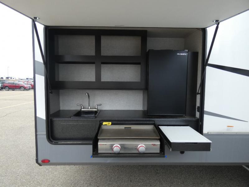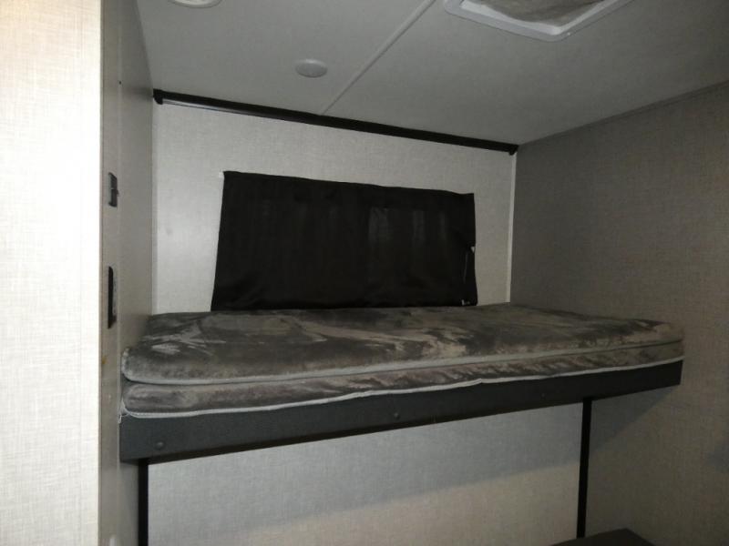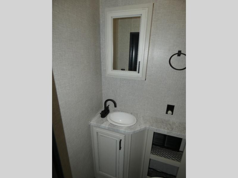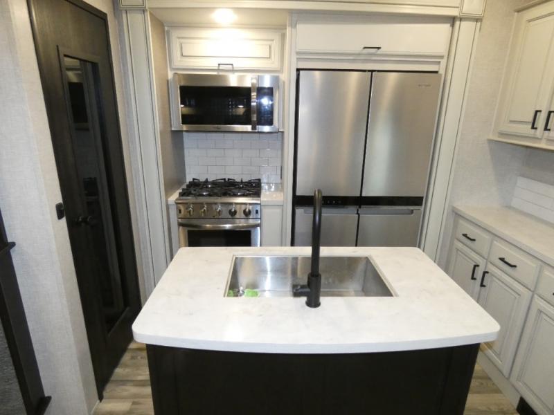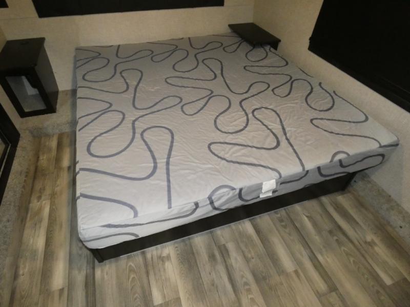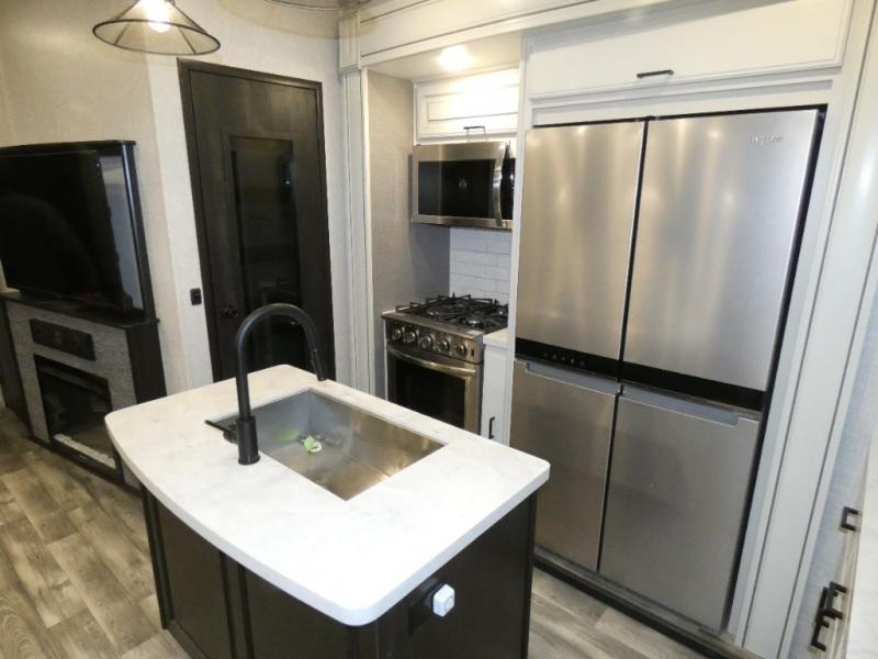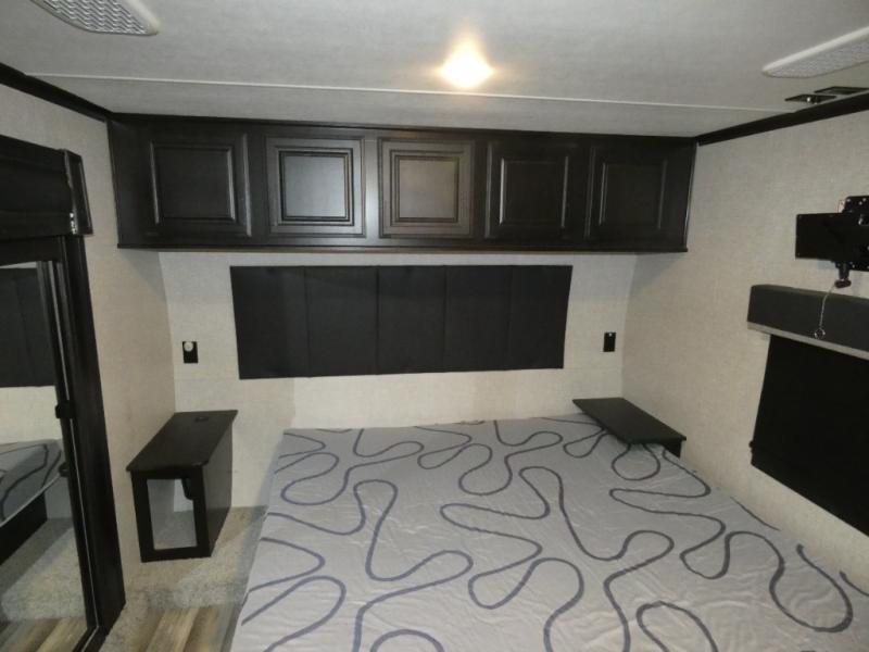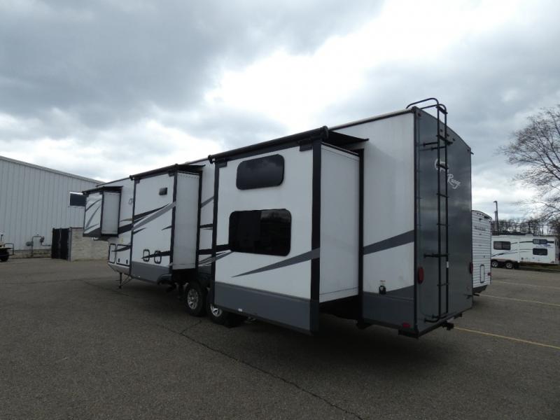 Whether you live in this fifth wheel full-time or enjoy long trips, you will have plenty of space to invite the grandkids or whomever you like to enjoy their own space in the rear bunkhouse. This room offers a dinette, bench seating and two bunk beds, plus a dresser and a half bath! The master suite is up front on the opposite side of the fifth wheel and includes a slide out mirrored wardrobe, a walk-around queen bed plus access to the full double entry bathroom. Everyone can gather in the main living and kitchen area to make meals with full amenities such as the residential convection microwave and four burner range, plus they can dine and play games at the U-Lounge with two tables and watch the 50" LED HDTV with a fireplace below. The cook can also use the outside kitchen while everyone relaxes under the two awnings.