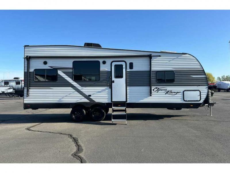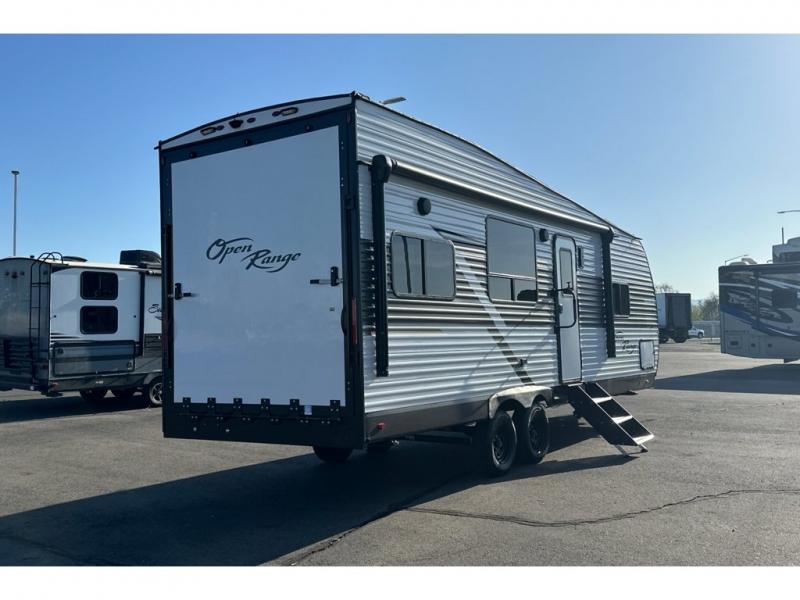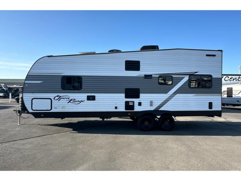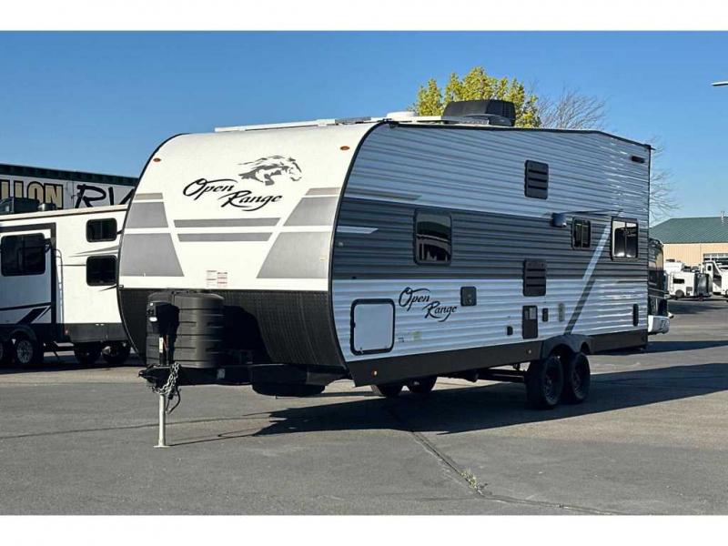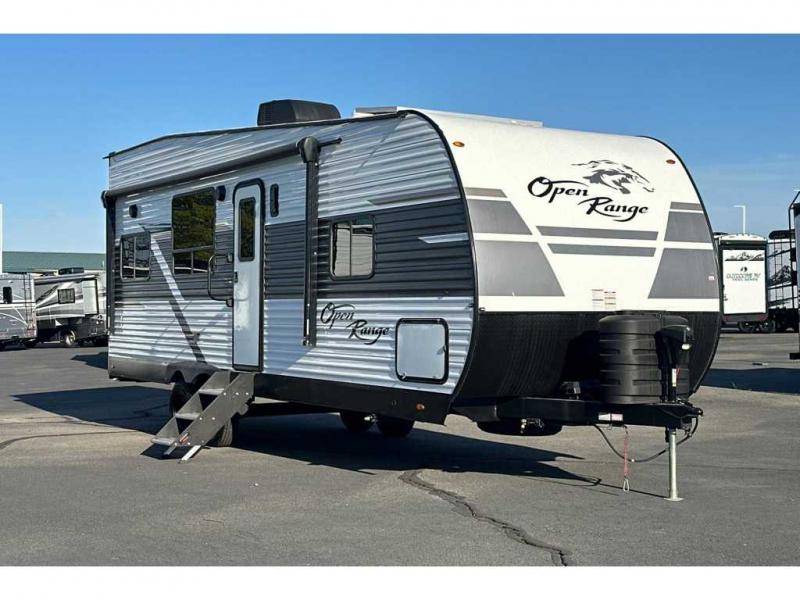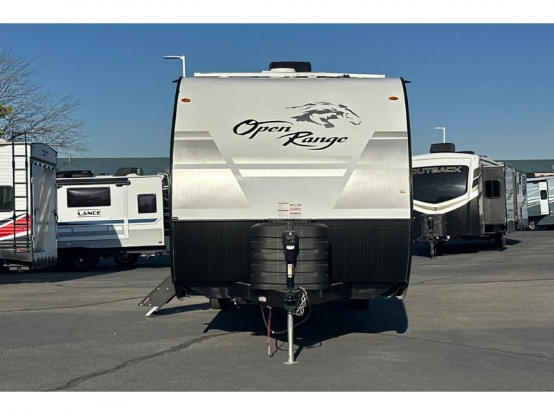 The affordable Open Range Conventional travel trailers by Highland Ridge are ready to meet your camping needs! You will appreciate the durable Magnum Roof system, plus each model is constructed with black front diamond plate protection, 5/8" main floor decking, and self-adjusting electric brakes with E-Z Lube axles for smooth towing. The 81" interior height means you won't feel cramped when relaxing with friends and family, and the residential vinyl flooring throughout is easy to clean, which will be perfect if you're camping with little ones or pets. These models also include an AM/FM/Bluetooth radio with indoor/outdoor speakers, a digital TV antenna that will go perfectly with the optional Smart TV, plus a 13,500 BTU roof mounted A/C to keep you cool on those hot summer months.